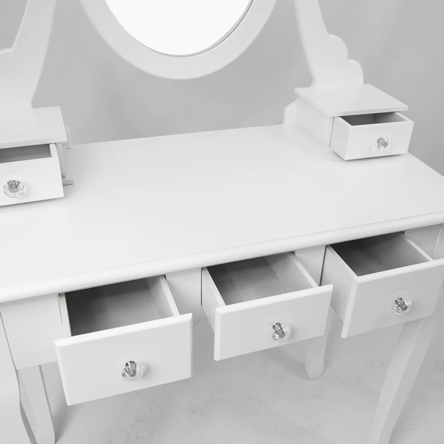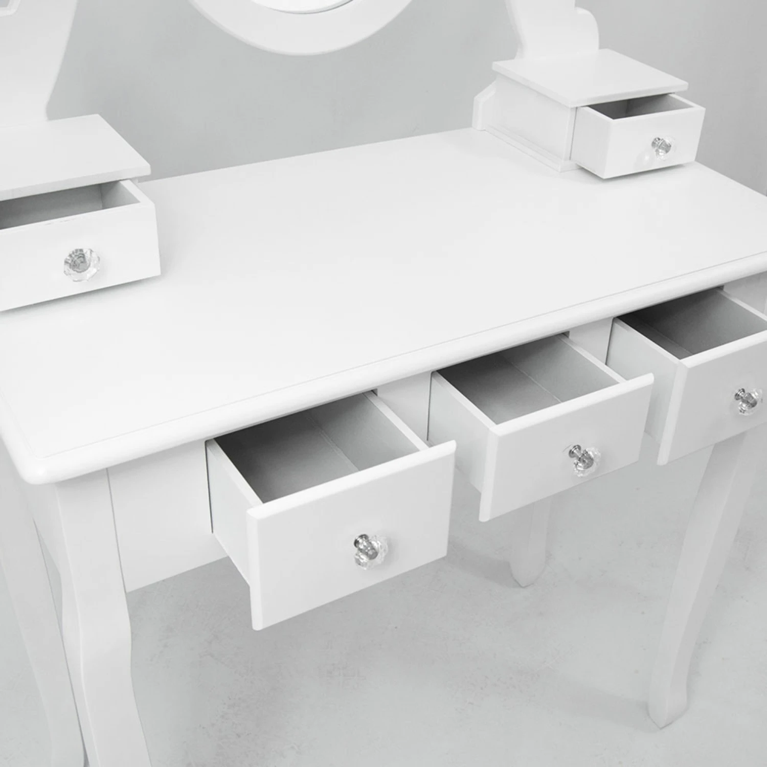 Ideally a part of your bedroom area whilst it already features other white furniture, this antique french style dressing table set is just what any home needs if it lacks luxurious style and practically designed furniture. Complete with drawers to give you the extra storage space you need, this set is a must for the bedroom area.