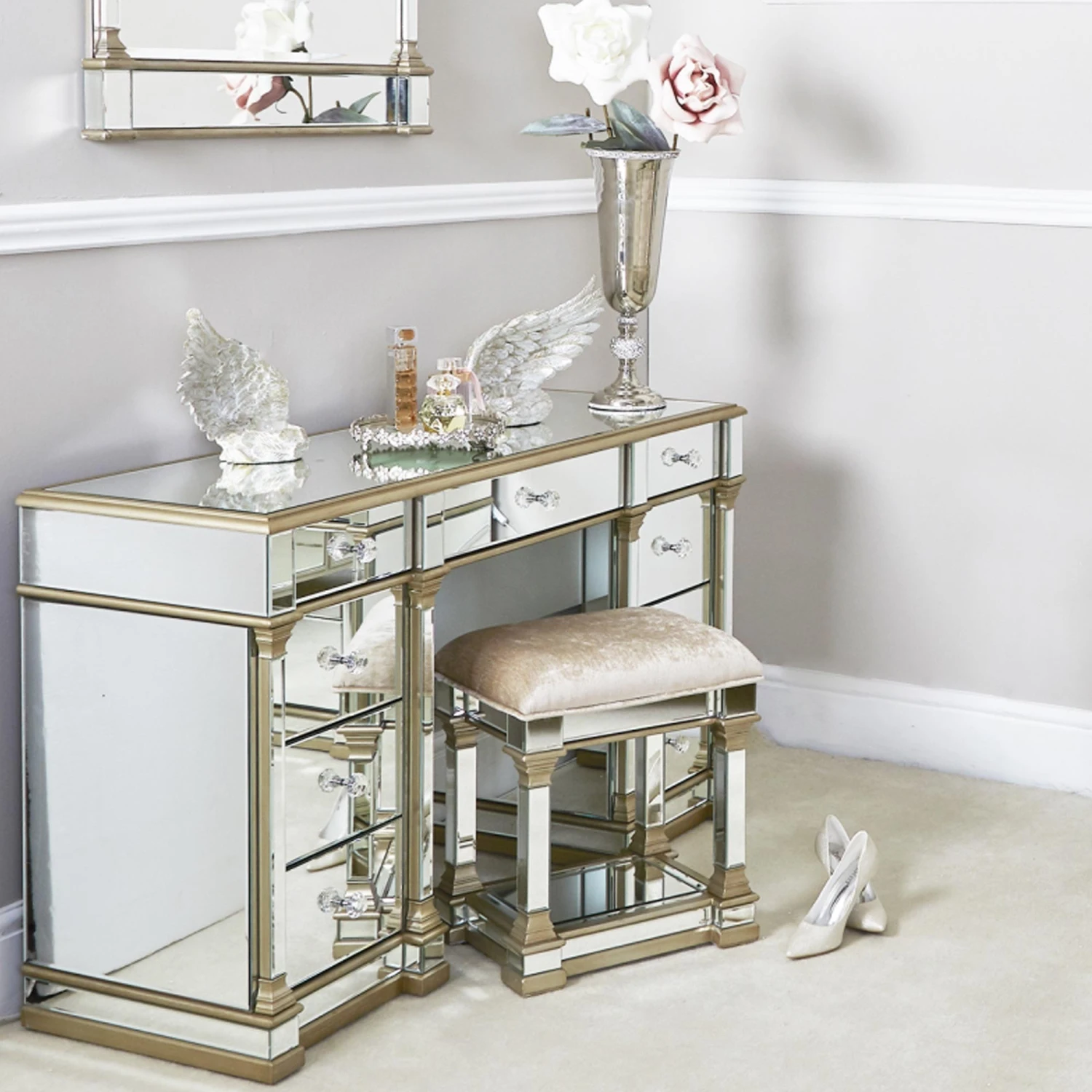 Bring the glam to your bedroom with this Apollo 9 Drawer Mirror Champagne dressing Table . The design features an all over mirror design, trimmed with champagne coloured trim and finished with crystal handles. The dressing table has 9 spacious drawers giving you plenty of storages. Style with a mirror of your choice and matching stool.