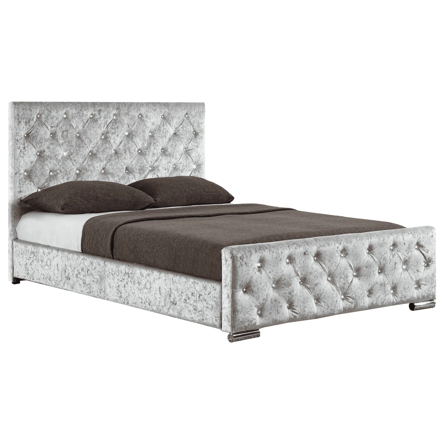 This stunning Arabella Silver Crushed Velvet Bed is a must-have for your home. A beautiful crushed velvet upholstered bed in sparkling silver adds a luxurious feel to the room. Set with button detailing both on the headboard and the footboard, this stylish modern king size bed will take centre stage. Made from high quality materials, it gives the style of a contemporary interior. Made from the Arabella range with other colours to choose from.
