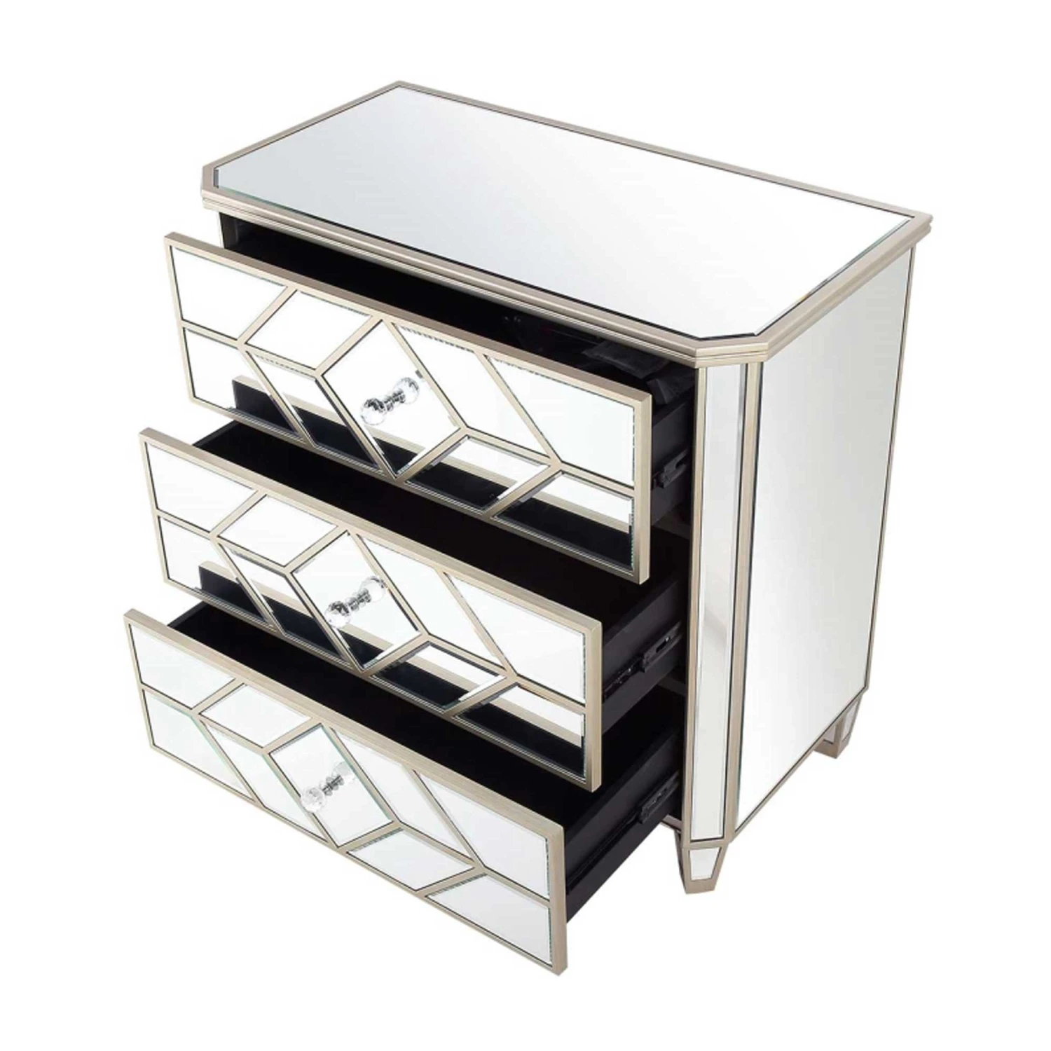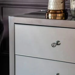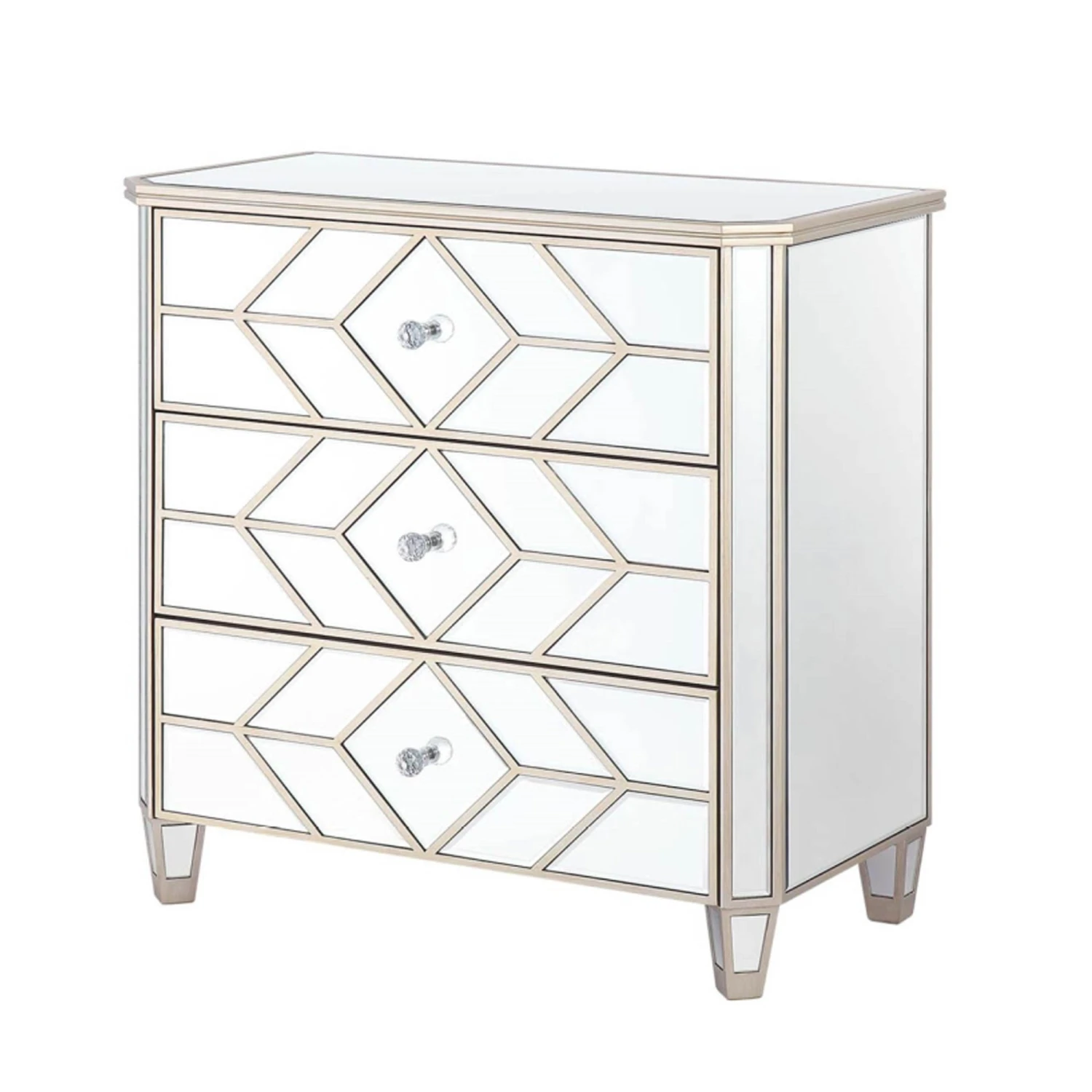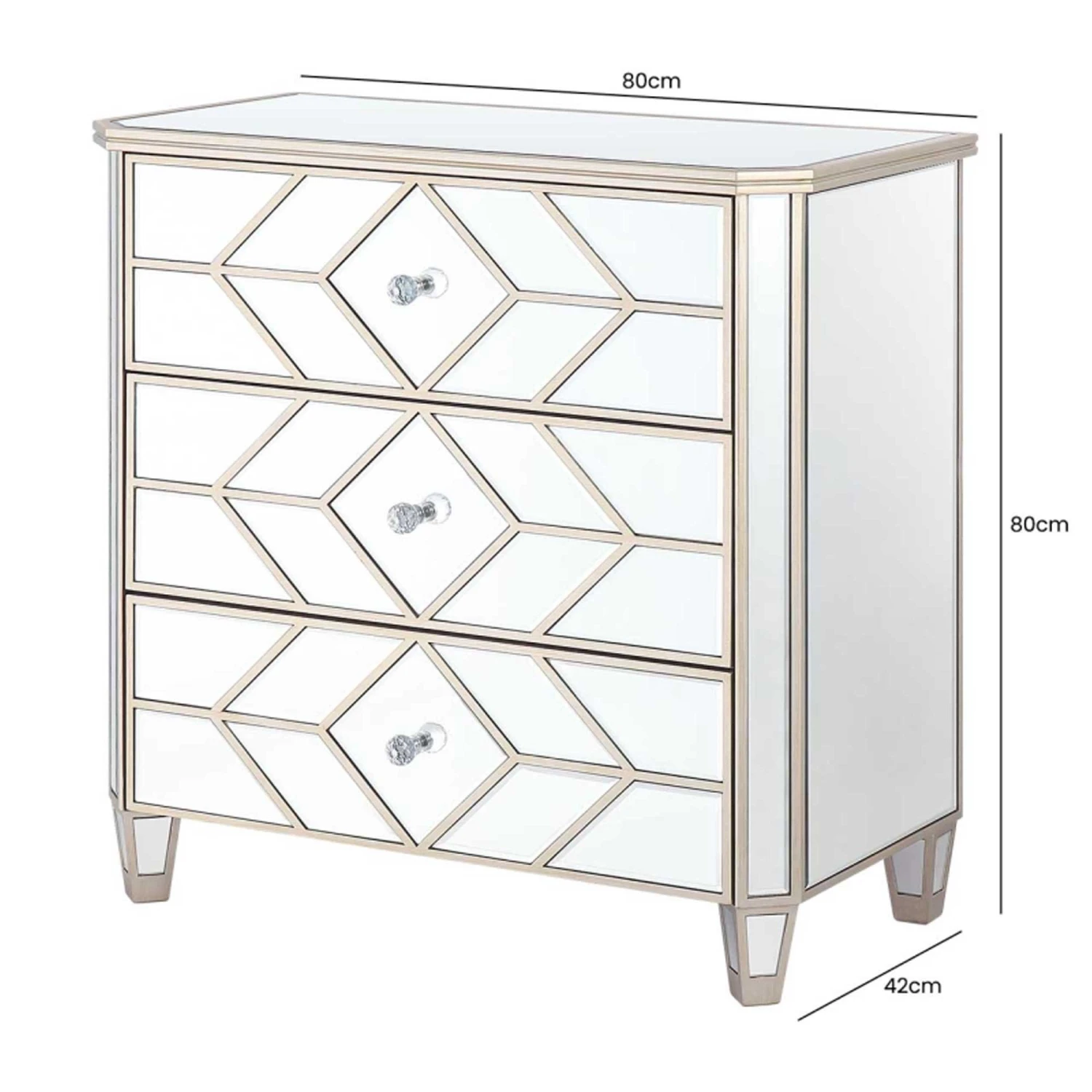 Transform your bedroom at home when you add this Becca 3 Drawer Mirrored Chest to it, increasing your storage space for your clothing and accessories. Manufactured from an MDF build, it is strong and sturdy and has a mirrored exterior oozing elegance with a champagne finish. Complete with crystal handles and a geometric inspired design on its exterior, it’s a popular choice in our mirrored furniture.Â