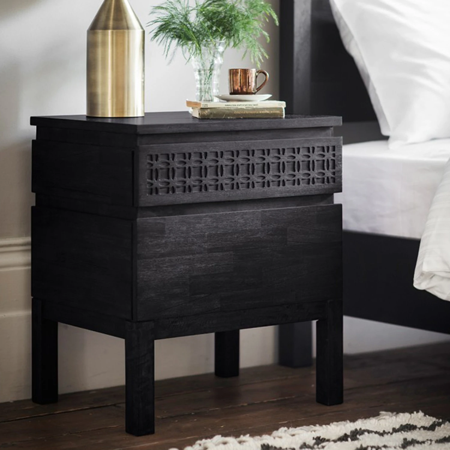 The Boho Boutique Bedside Drawer is the perfect piece to mix modern and classic styles, made using Mango solids with mixed timber veneers of Teak-Mahogany-Mindy Ash and Mango which give contrast and make the inlaid pattern stand out. It has a stunning mat black charcoal finish. The drawers feature a ethnic patterned design detail along the front of the top drawer, made from solid mango wood.