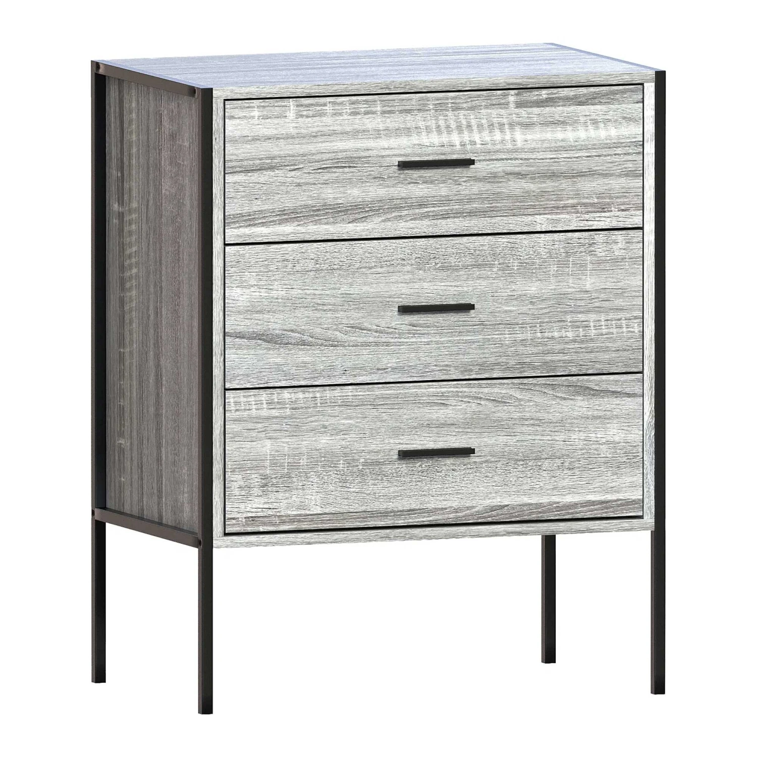 An essential piece of bedroom furniture, this Brooklyn Grey 3 Drawer Chest allows you to neatly fold and store T-shirts, trousers or jumpers into its 3 spacious drawers provided, ensuring a clean bedroom that’s clutter-free. Adding style and character with its industrial design, it comes in a rustic grey finish and is complete with a sturdy black metal frame to ensure durability.
