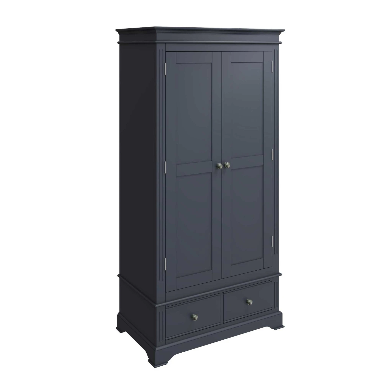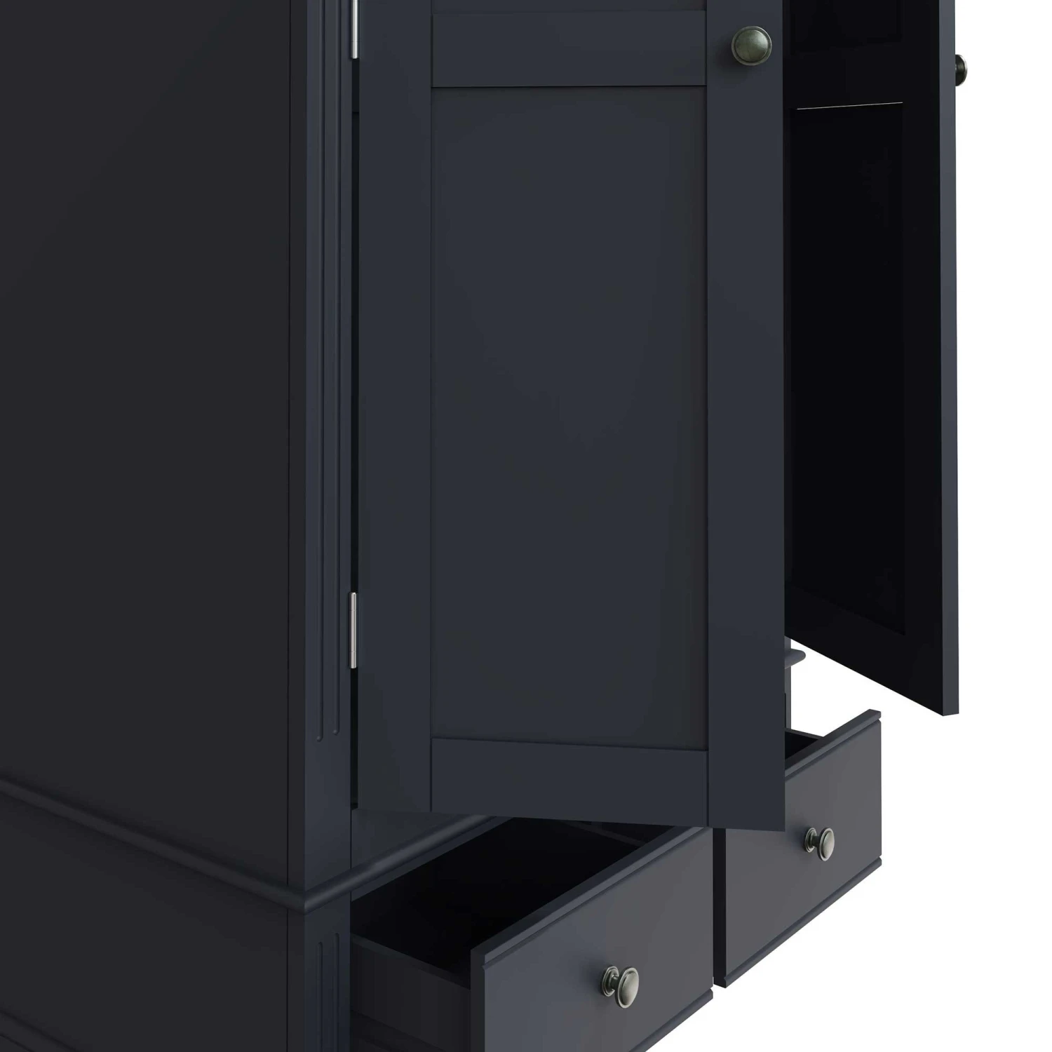 Add this Burlington Midnight Grey 2 Door Wardrobe to the bedroom and complete the Midnight Grey look. This 2 door wardrobe provides lots of storage with hanging space and complete with 2 additional drawers for extra storage. The doors and drawers are finished with aged pewter handles and sculpted cornices for a vintage touch. Matching items available.