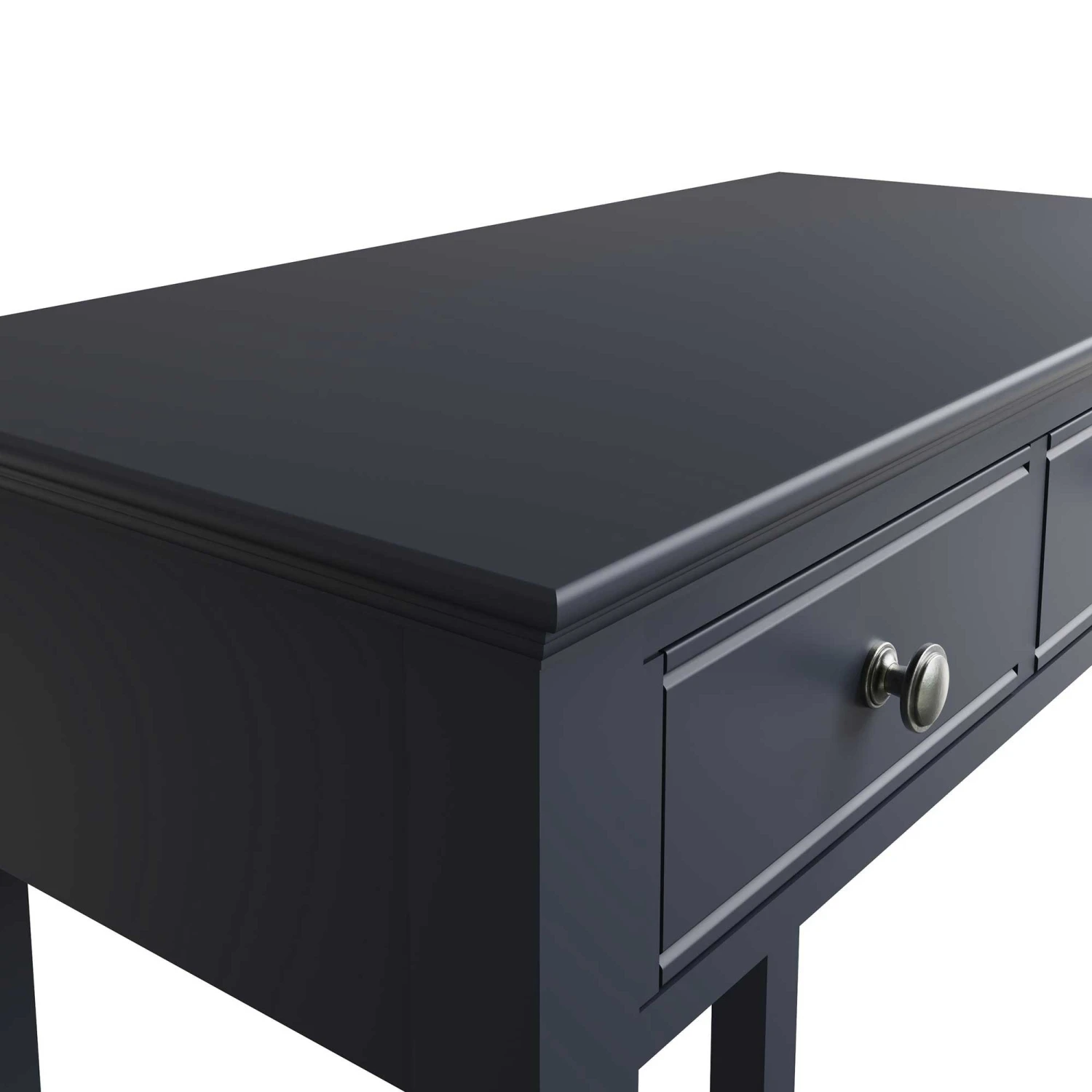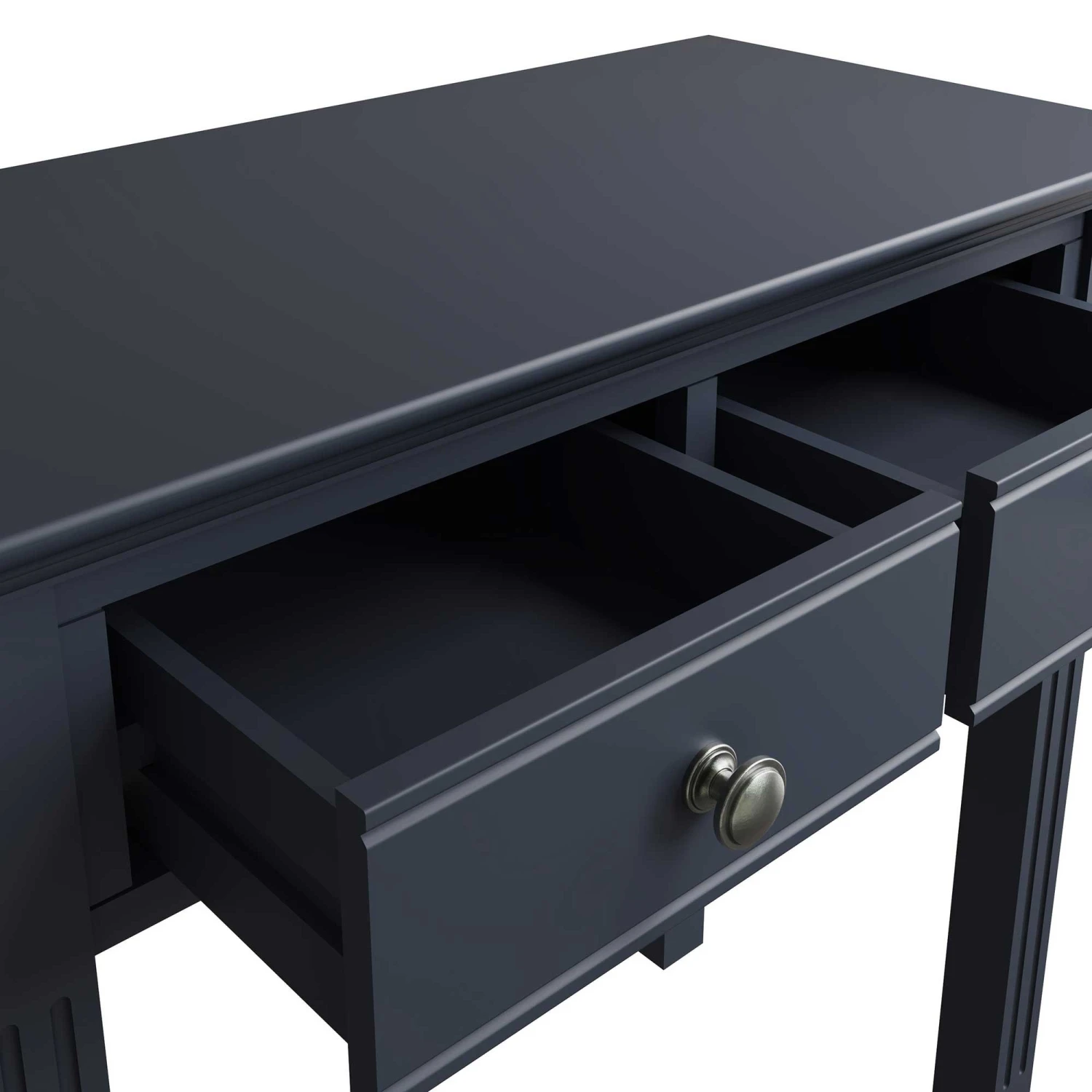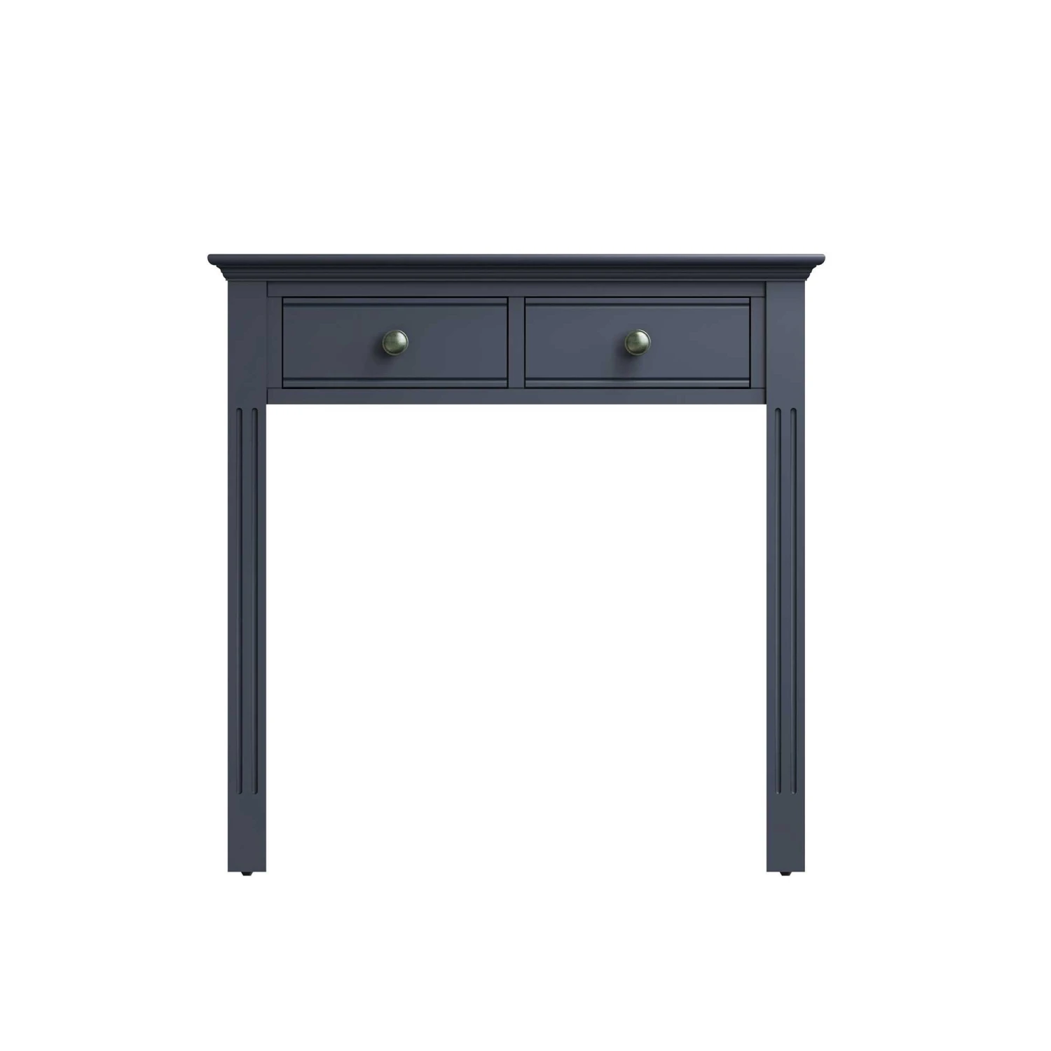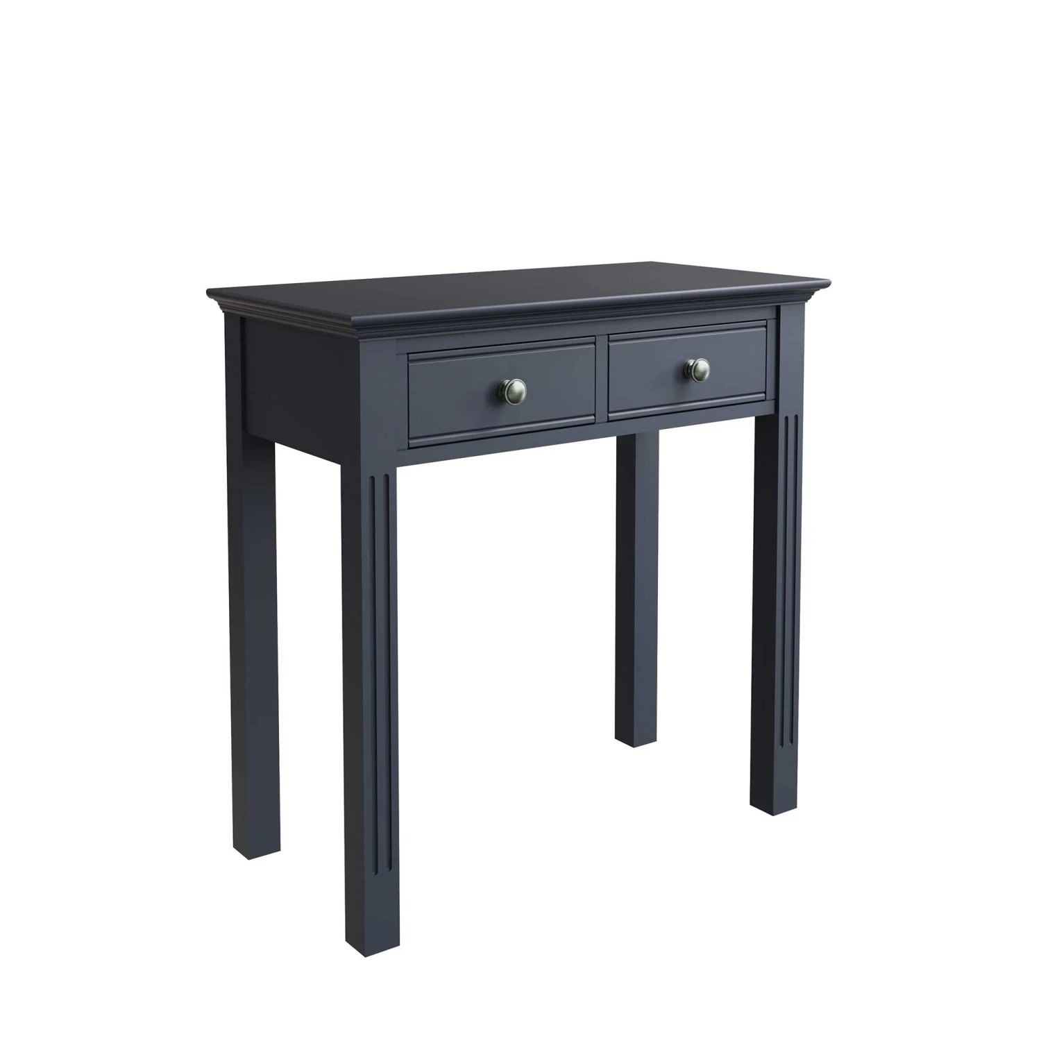 Extend your Burlington Midnight Grey Bedroom Collection with this beautiful Burlington Midnight Grey 2 Drawer Dressing Table. This contemporary style dressing table is painted in midnight grey and features 2 drawers for convenient storage of makeup and moisturisers. The dressing table is carefully crafted with linear ridged detail on the table legs and finished with aged pewter drawer handles for a vintage vibe. Matching items available.Â