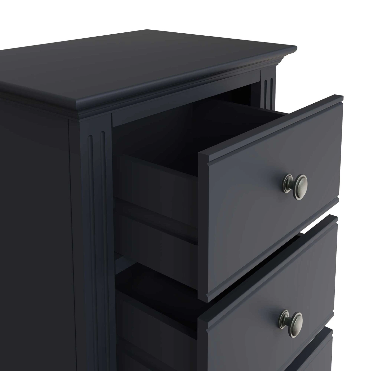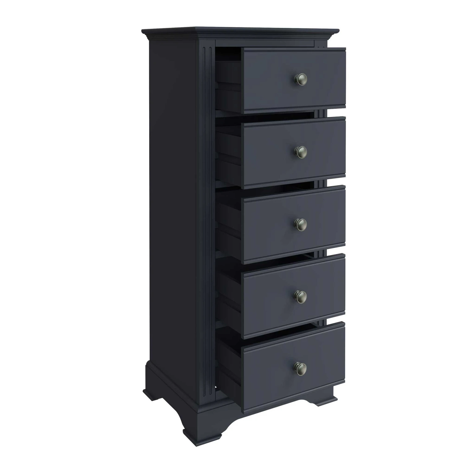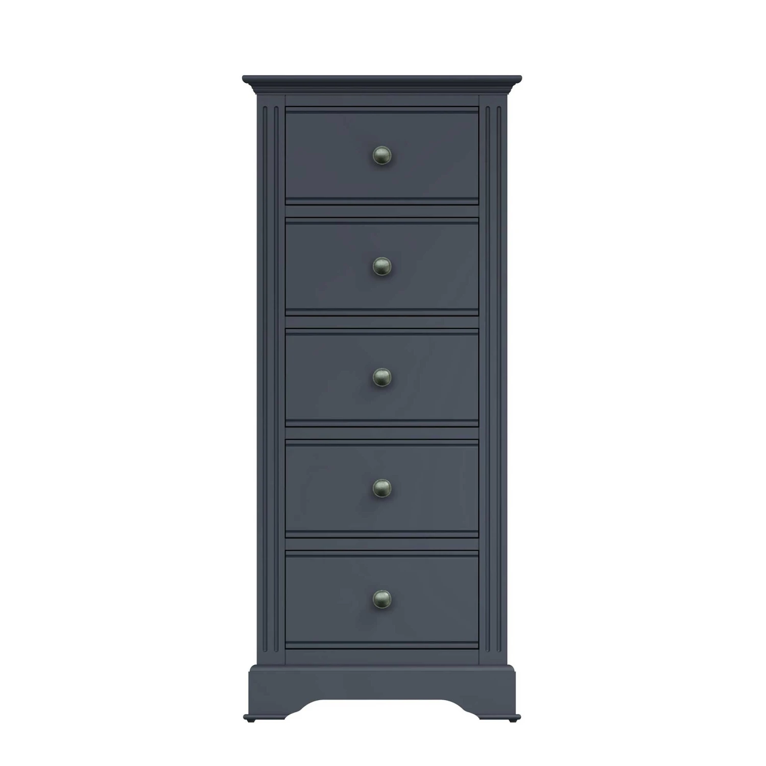 Enhance the contemporary look in your bedroom with this Burlington Midnight Grey 5 Drawer Narrow Chest. This 5 Drawer Narrow Chest is part of the new Burlington Midnight Grey Bedroom Collection and will make a great addition to any modern style home. This tallboy chest provides 5 spacious drawers for storing books, towels or bedding and is finished with aged pewter drawer handles for a vintage touch. Ridged detailing is found on the front along with sculpted cornice feet completing the contemporary design. Matching items available.