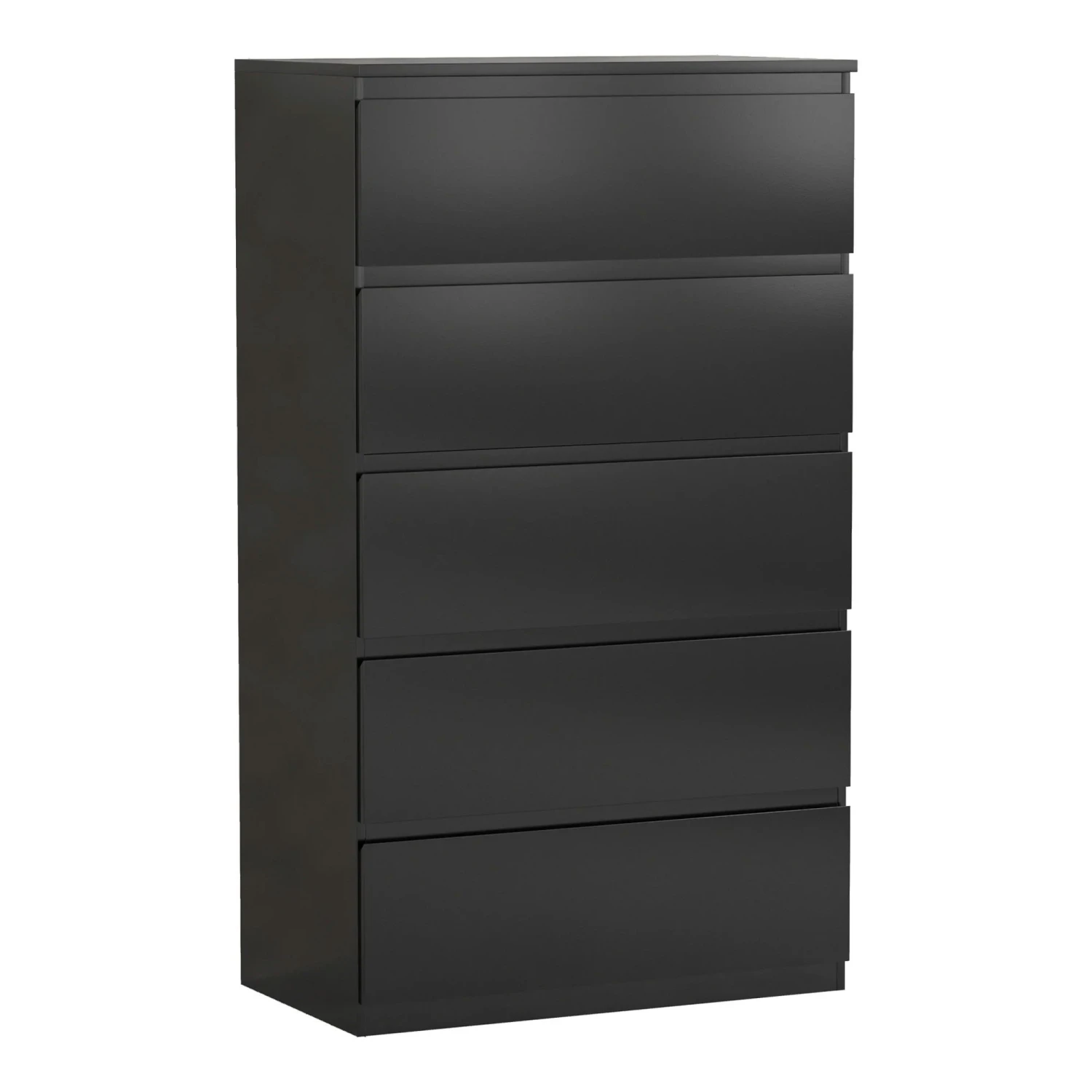 The Denver 5 Drawer Black Chest is a lovely piece of bedroom furniture that takes up little floor space with its tall, narrow design. Coming with 5 drawers of storage space, it has been manufactured using wood with a bold black finish and a sleek, stylish handle-less design. Neatly fold your clothes up and put them away inside to keep your bedroom space tidy from piles of clothes, making it easy to find your favourite top or those jeans you’ve been wanting to wear!