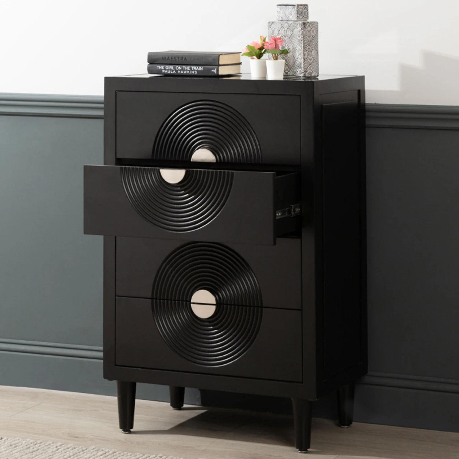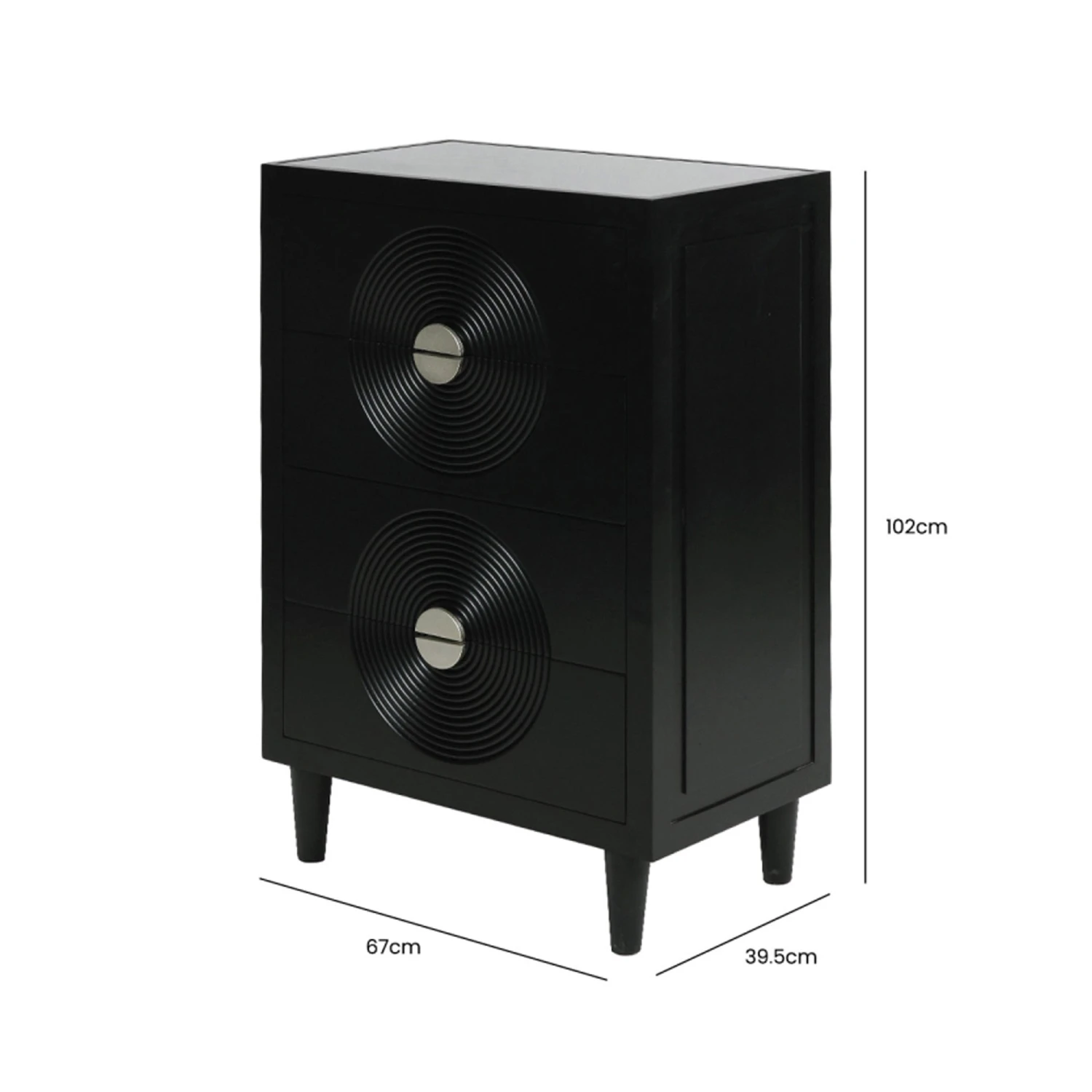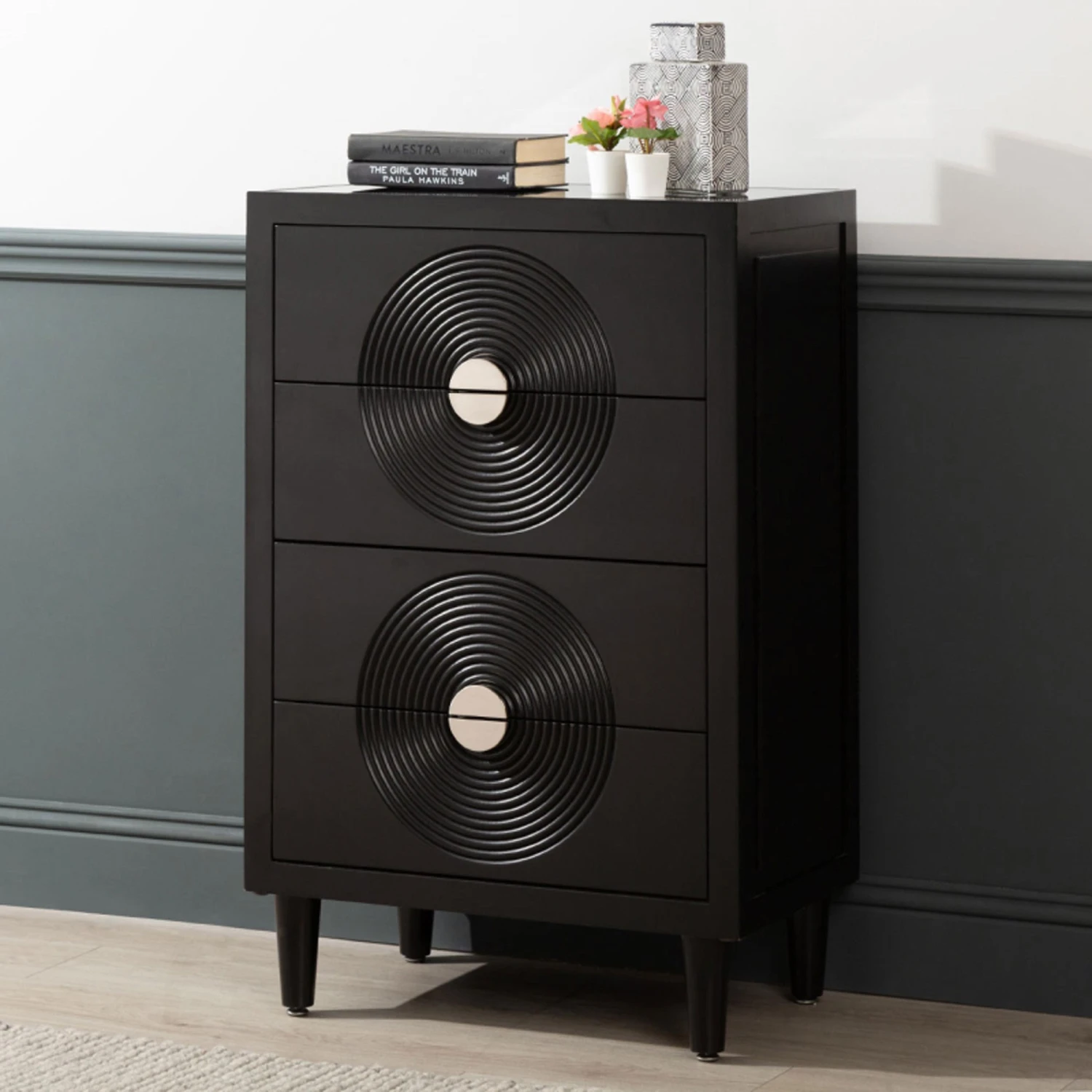 The Elon 4 Drawer Black Tallboy Cabinet with Smoked Mirror Top is a stylish, contemporary bedroom cabinet that provides storage facilities for your clothing and accessories. Manufactured from MDF wood, it has a black finish and comes with an ornate circular pattern on the drawer fronts with a smoked mirror top for added detail. With 4 drawers in total, there’s ample storage to fold clothes neatly inside. Coming with 2 sets of handles for you to choose from in a nickel and gold finish.