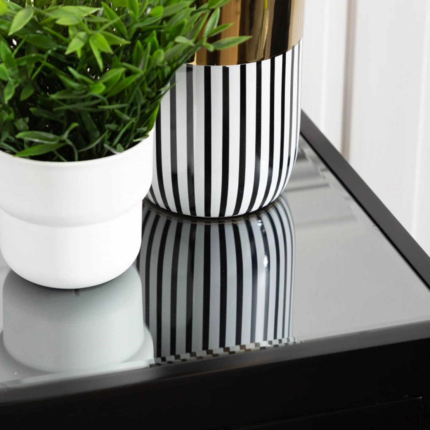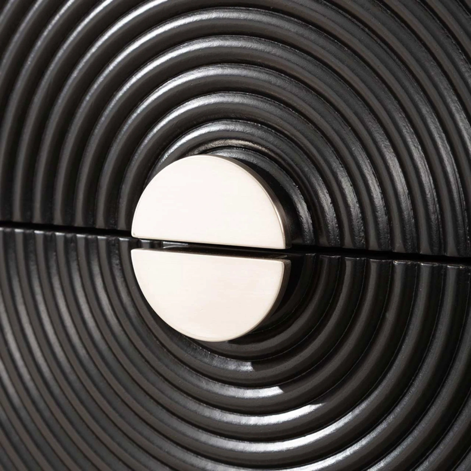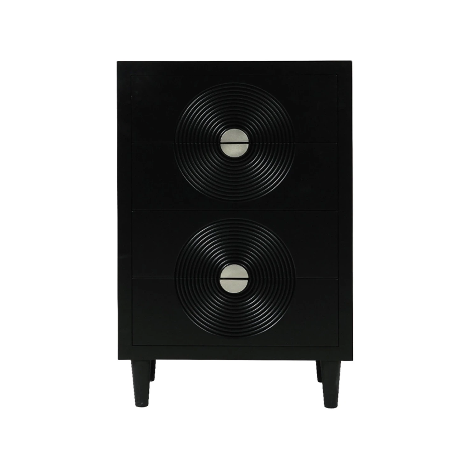 The Elon 4 Drawer Black Tallboy Cabinet with Smoked Mirror Top is a stylish, contemporary bedroom cabinet that provides storage facilities for your clothing and accessories. Manufactured from MDF wood, it has a black finish and comes with an ornate circular pattern on the drawer fronts with a smoked mirror top for added detail. With 4 drawers in total, there’s ample storage to fold clothes neatly inside. Coming with 2 sets of handles for you to choose from in a nickel and gold finish.