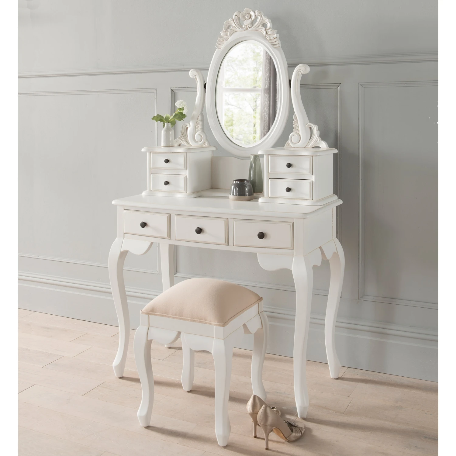 A brand new addition to our collection of antique French and shabby chic furniture comes the Emmanuelle collection. Handcrafted and carefully built by experts, this delightful dressing table set including a mirror and stool is finished in a stunning antique white, with 7 spacious trinket drawers, ornate drawer detailing and crafted from mahogany is ideal to add a touch of style, elegance and beauty in your home today, brightening up any space.