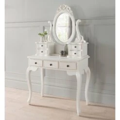 A brand new addition to our collection of antique French and shabby chic furniture comes the Emmanuelle collection. Handcrafted and carefully built by experts, this delightful dressing table finished in a stunning antique white, with 7 spacious trinket drawers, ornate drawer detailing and crafted from mahogany is ideal to add a touch of style, elegance and beauty in your home today, brightening up any space.