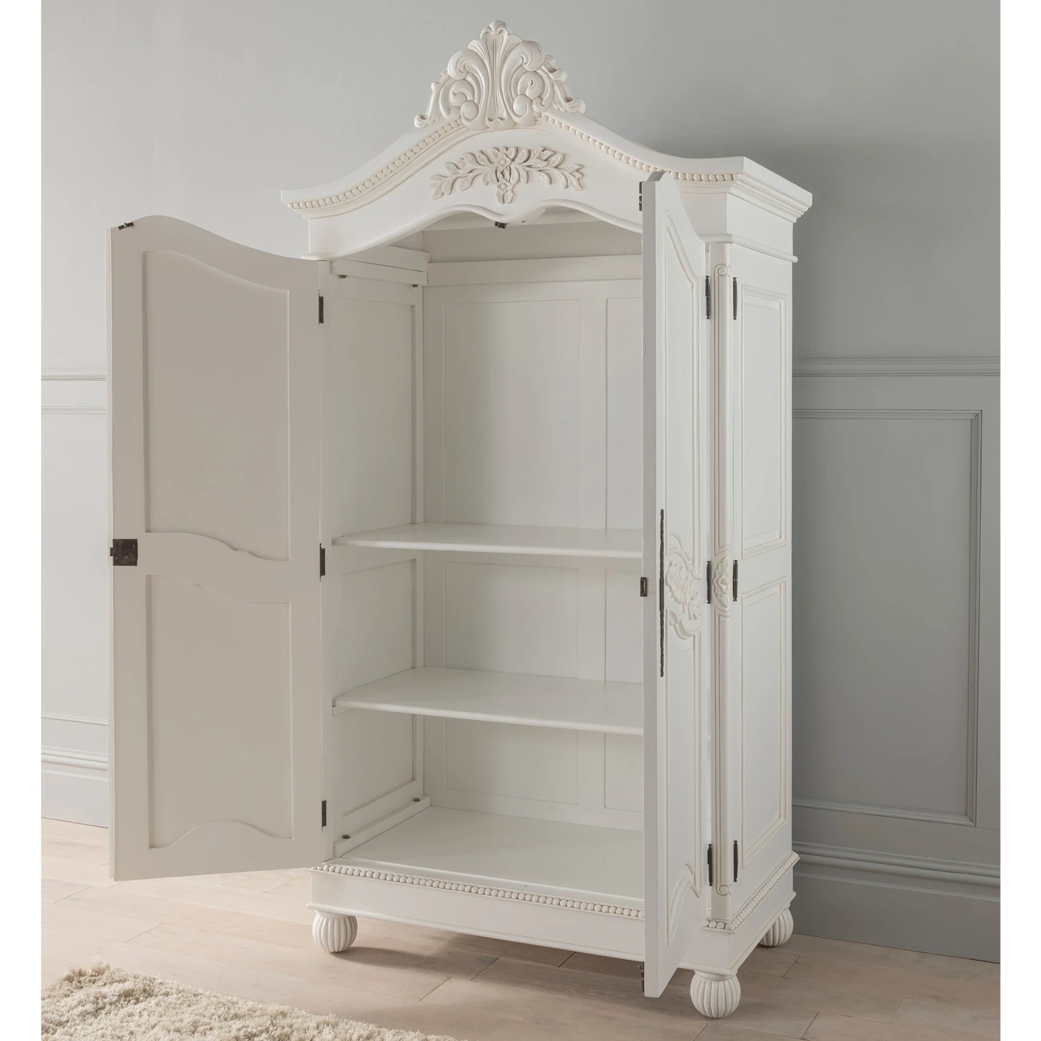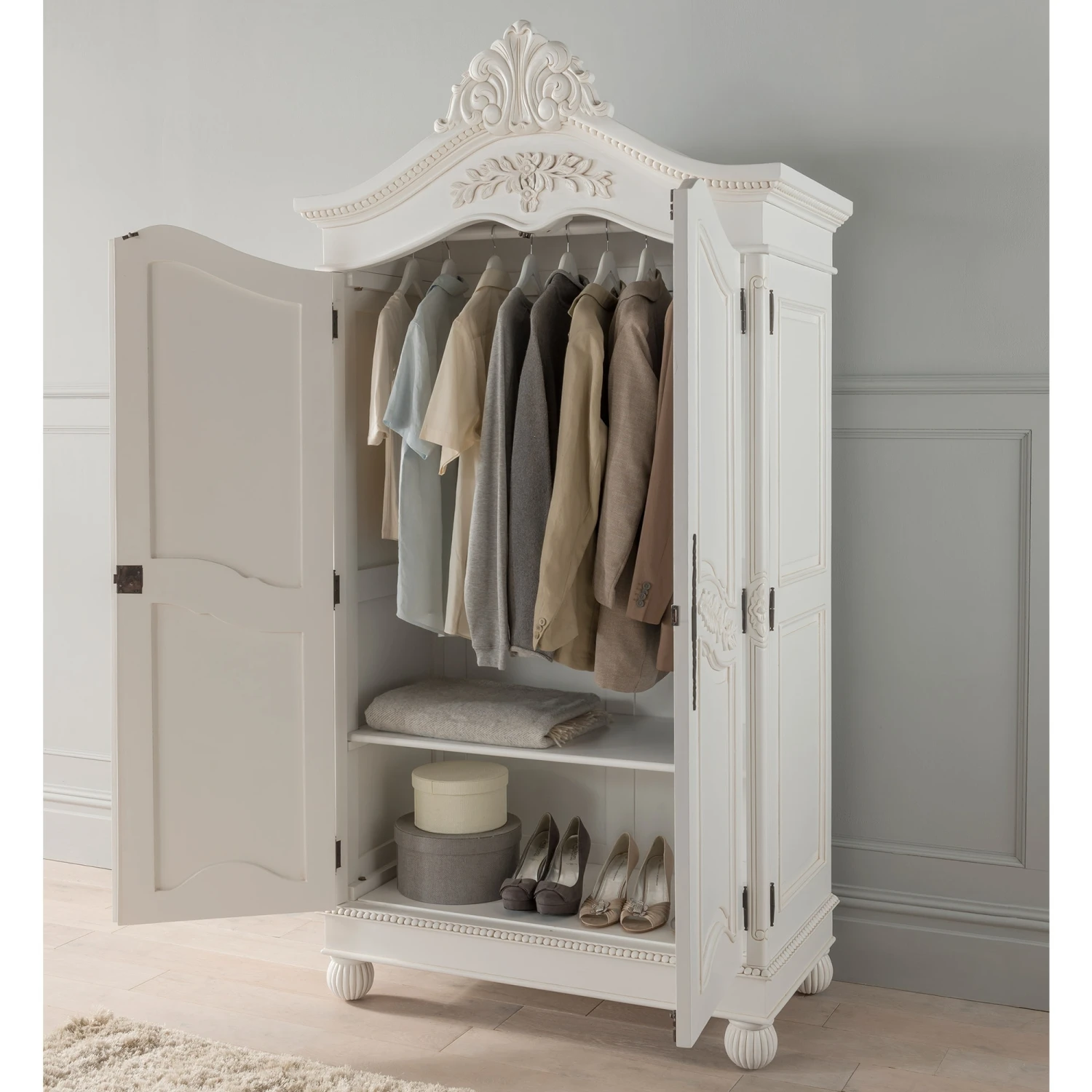 A brand new addition to our collection of antique French and shabby chic furniture comes the Emmanuelle collection. Handcrafted and carefully built by experts, this delightful wardrobe finished in a stunning antique white, with 2 spacious doors and crafted from mahogany is ideal to add a touch of style and elegance in your wonderful home today