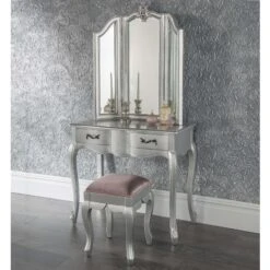 A brand new addition to our collection of antique French and shabby chic furniture comes the Estelle collection. Handcrafted and carefully built by experts, this delightful dressing table set finished in a stunning silver with a unique and stylish curved front is sure to impress across generations.
