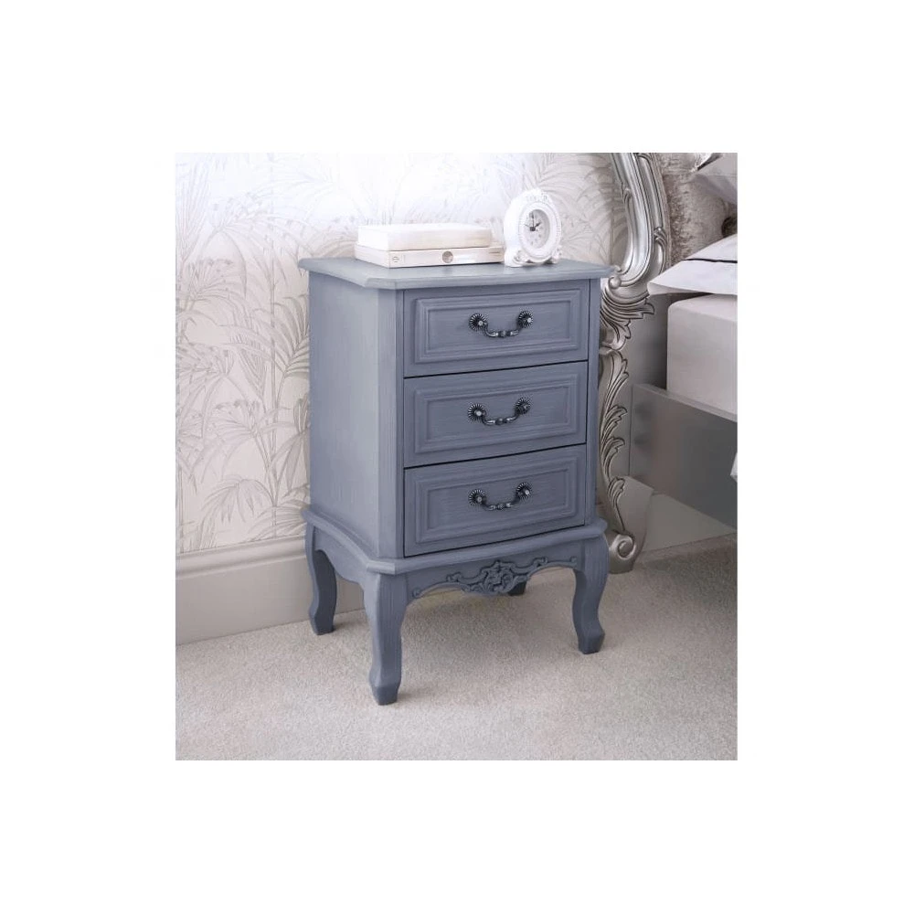 From our ever expanding range of shabby chic and French style furniture comes this delightful and ever so beautiful bedside table from our range of exclusive Etienne French furniture. Handcrafted and carefully built by experts, this exquisite and very practical antique French style bedside features 3 drawers, metal handles and finished in a marvelous grey. Perfect so and style and glam in any bedroom setting.