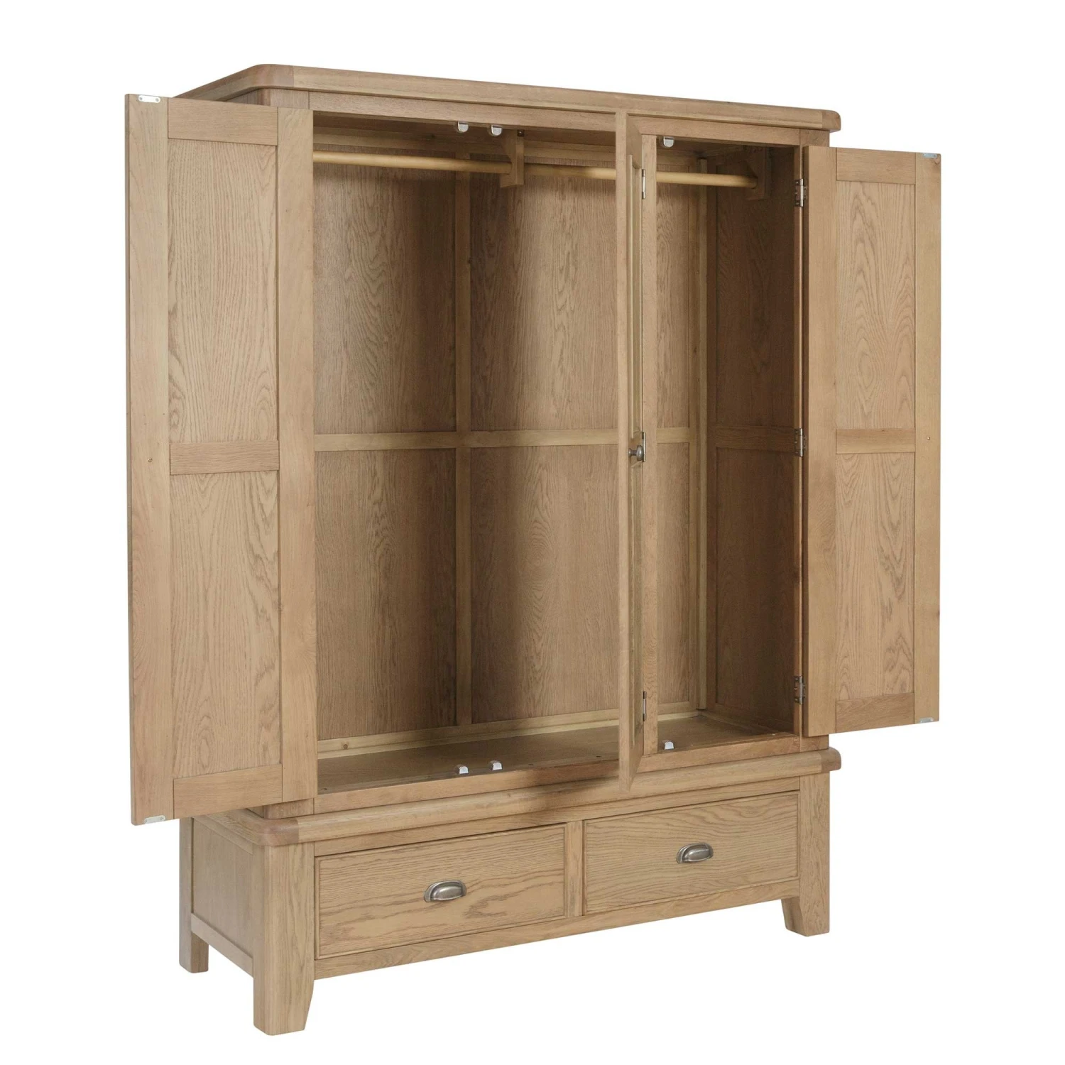 This beautiful Hampton Oak 3 Door Wardrobe will provide you with plenty of storage! The modern 3 door wardrobe also features 2 extra drawers for storing your towels and bedding! This stunning wardrobe showcases a high quality detailed finish with a thick oak top and rounded corners for a beautiful traditional look! The wardrobe opens up to a large spacious hanging area, ideal for your shirts, jumpers and coats! Matching items available.Â