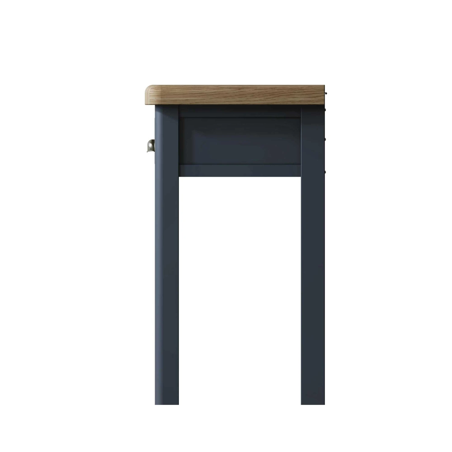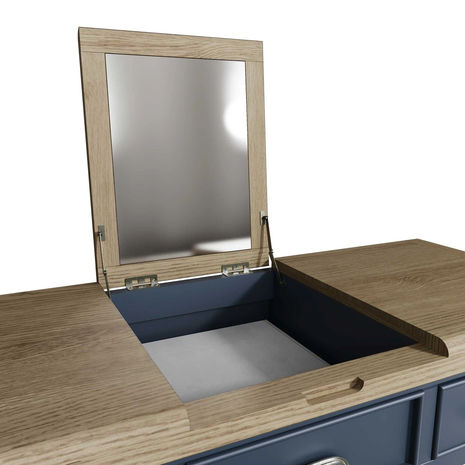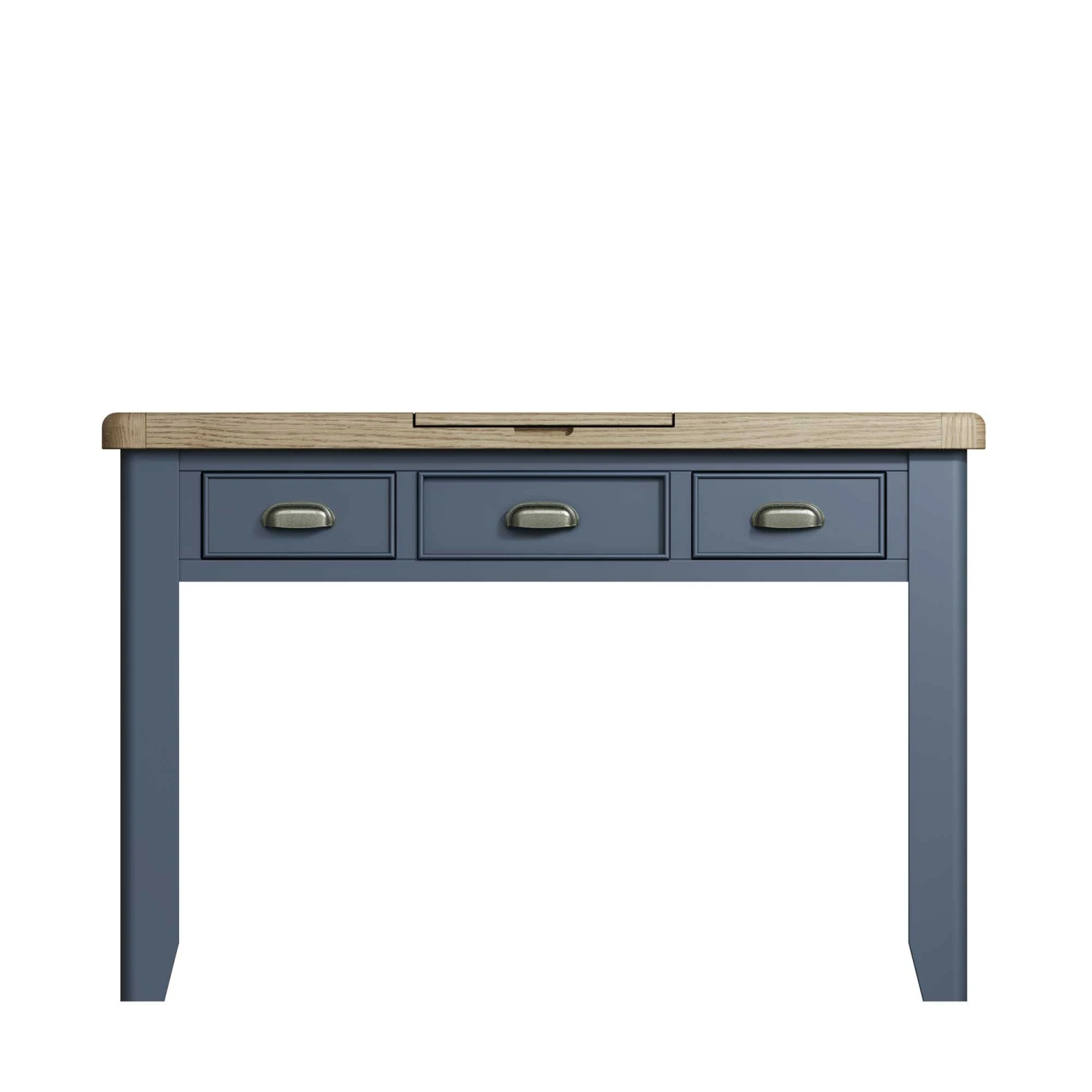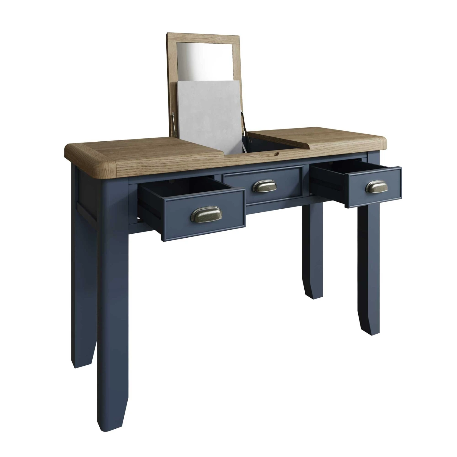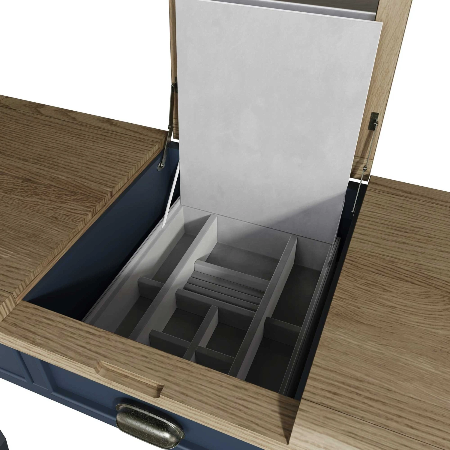 This Hopton Blue Dressing Table will look stunning in any modern home interior! This dressing table features a sumptuous and elegant traditional design and even hides a handy mirror and secret compartment in the thick oak table top! Complete with 3 drawers, this dressing table will provide storage for convenient items and make-up! Matching items available.Â