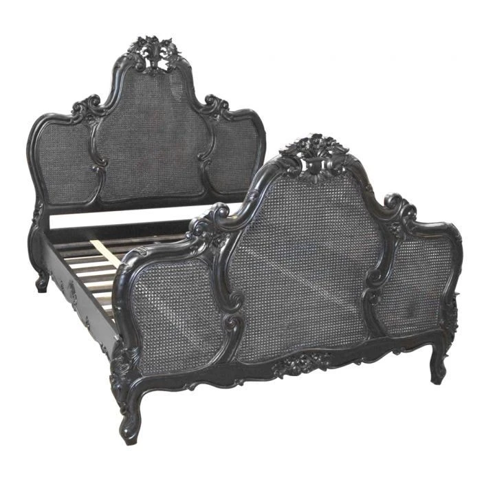 Absolutely stunning Louis XV inspired rattan and solid mahogany bed in a distressed flat black finish. This antique French bed has an exquisite finish, delicate wood carvings in Solid Mahogany, smooth curves so you can achieve that boudoir look. Whether on its own or co-ordinated with our stunning shabby chic furniture you are sure to be impressed.