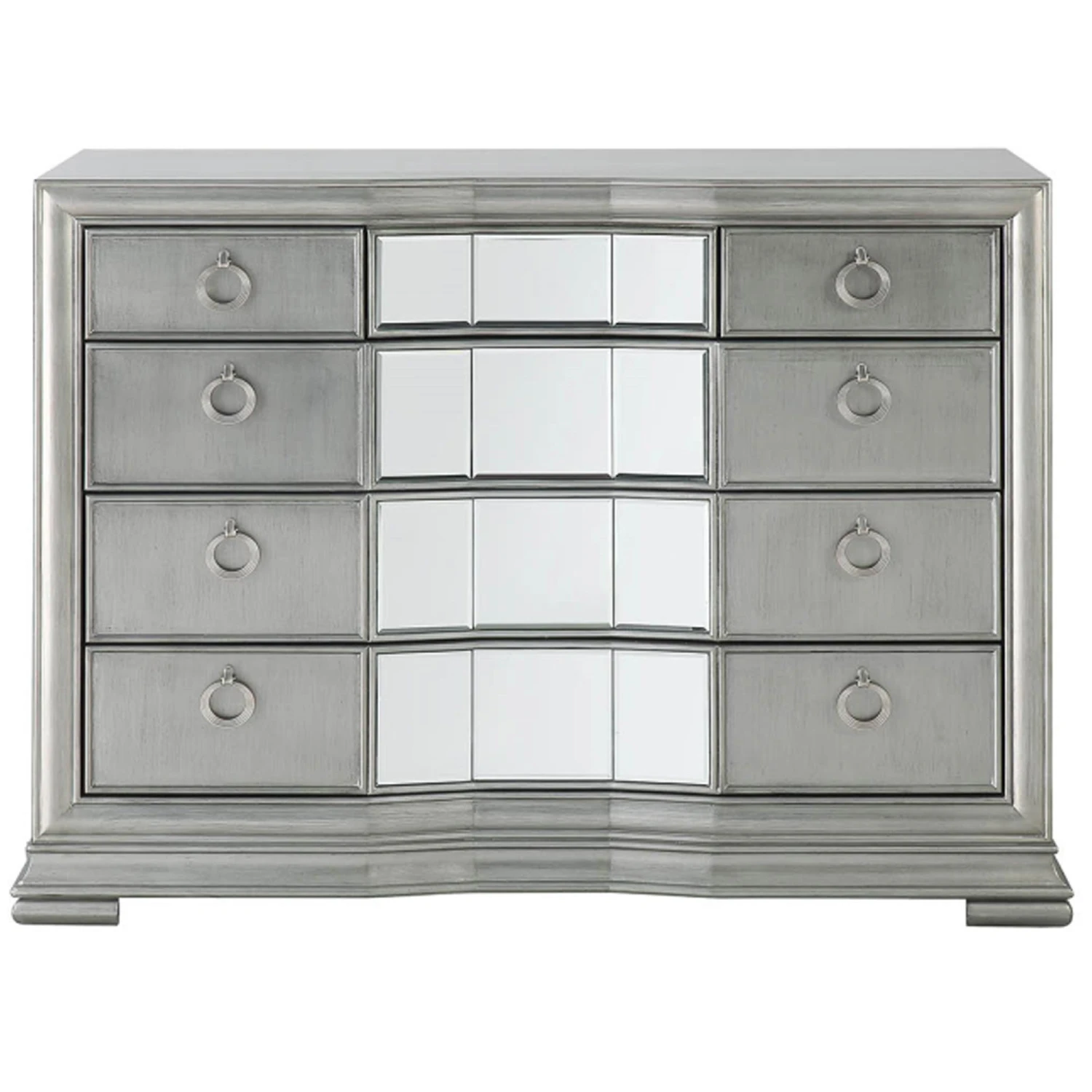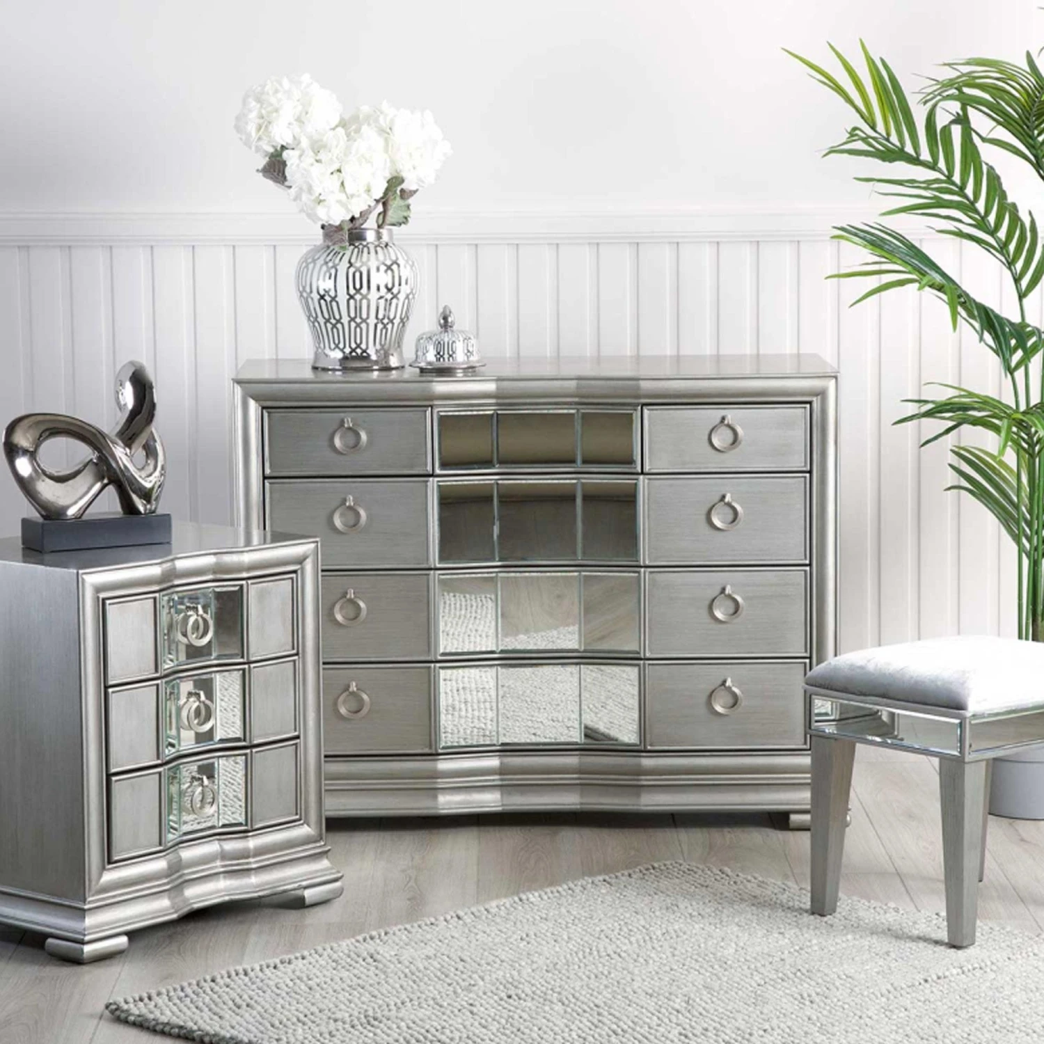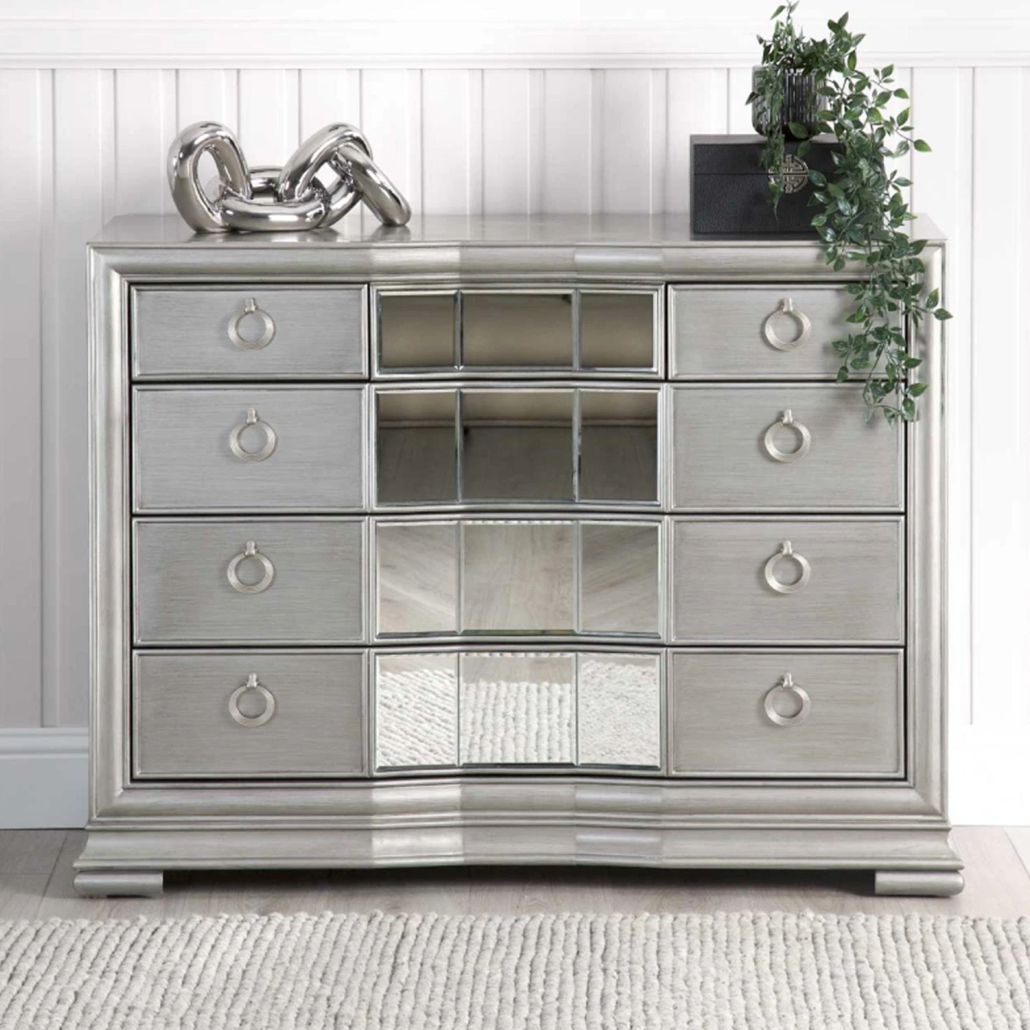 Add the Lucca Grey 5 Drawer Mirror Chest to your bedroom or living area for a luxury touch. The chest is crafted with a subtle grey toned wood with a serpentine detail to the frame created with a softly curving design and finished with insets of mirror. The chest offers plenty of storage with 5 spacious drawers all complete with ring shaped handles.