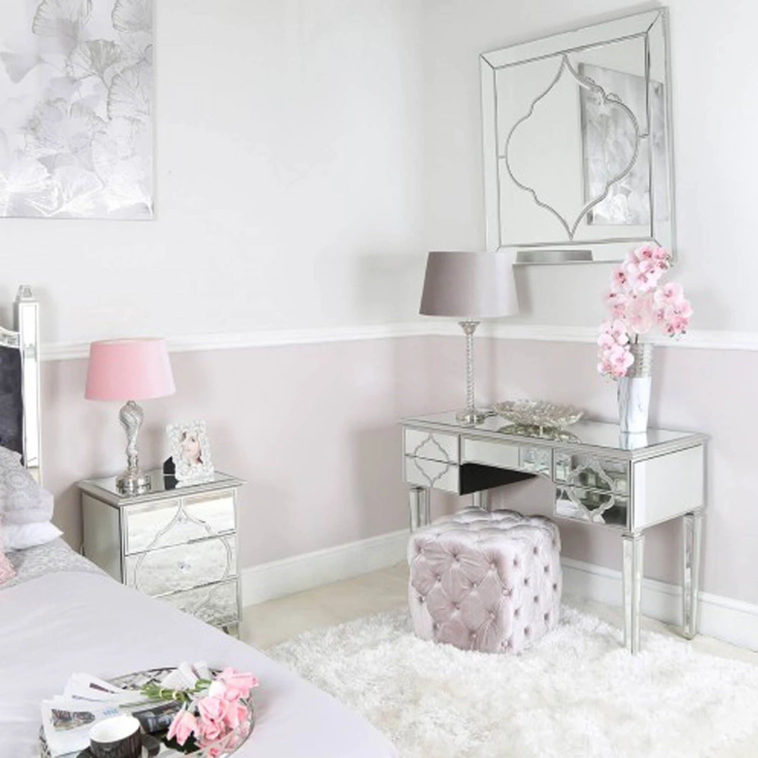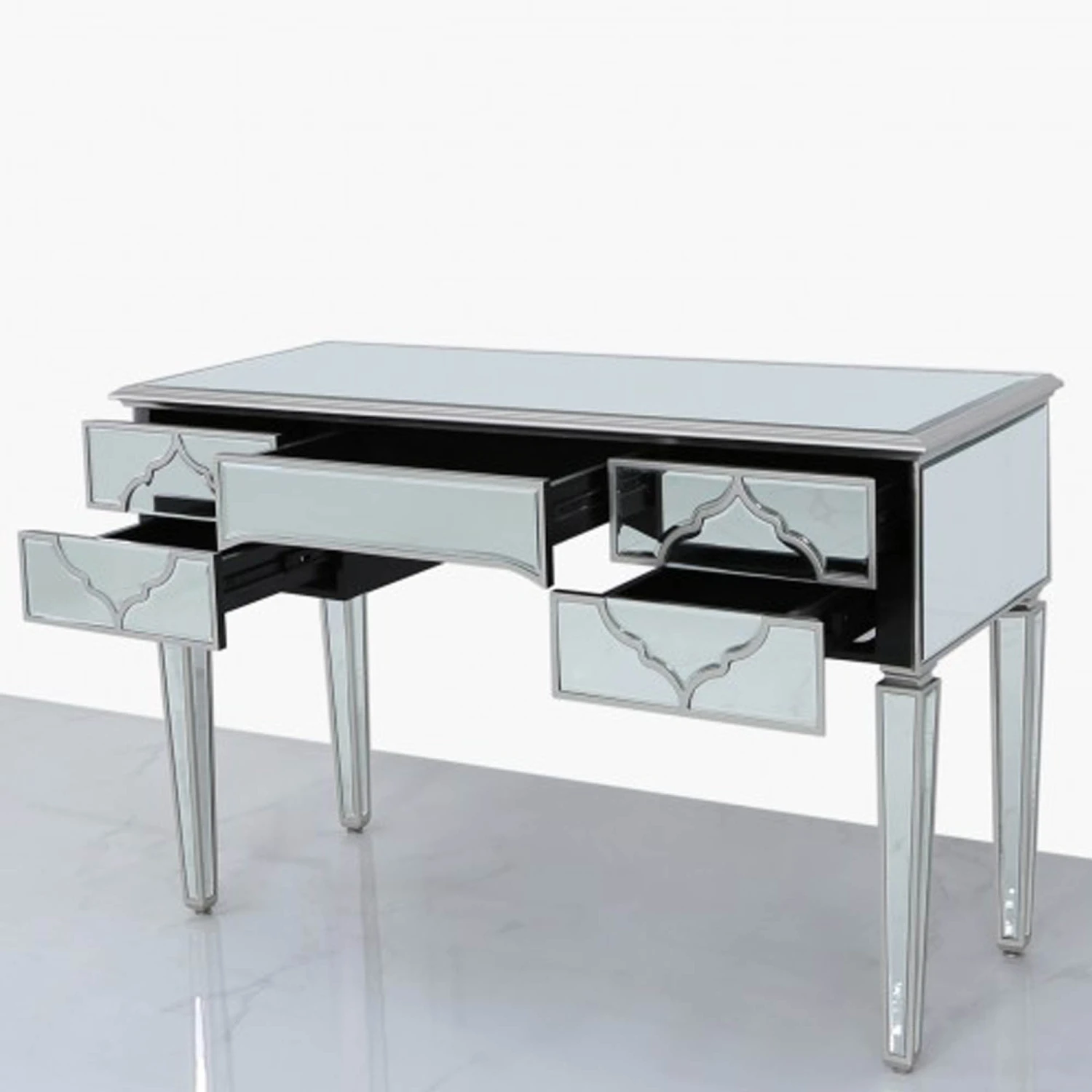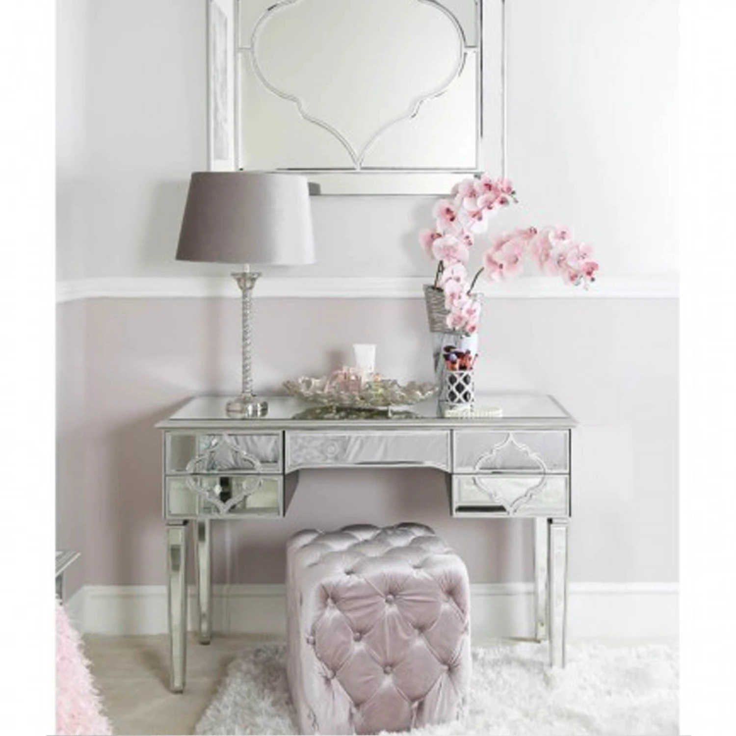 This stunning piece of mirrored furniture would be the most perfect and practical new addition to your home, this mirrored dressing table brings an elegant style and a chic charm into your interior. This silver mirrored dressing table features Marrakesh style qua-trefoil detailing on the sides along with silver painted framed edges.