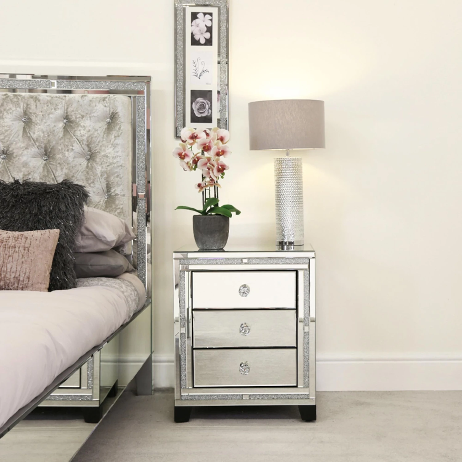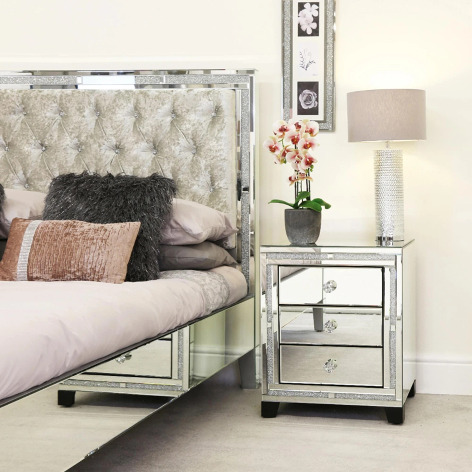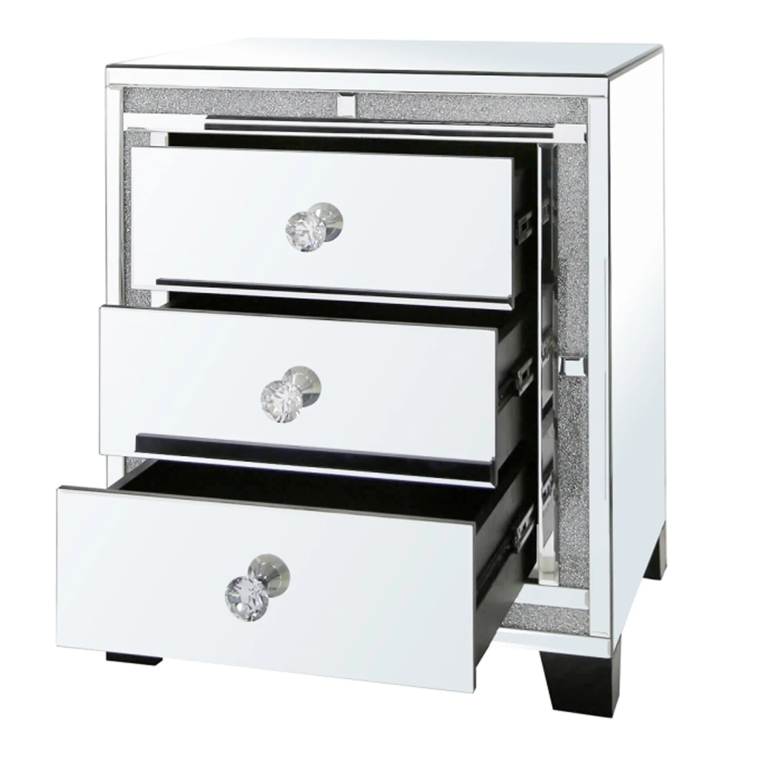 Introducing the Milano Mirror 3 Drawer Bedside. This is a beautiful cabinet that would certainly look stunning in any home whilst adding an expensive feel and surely a glitzy glamorous edge to the room. The three-drawer cabinet has ample space proving this piece practical as well as stunning with its inlaid crystal panels and crystal handles.