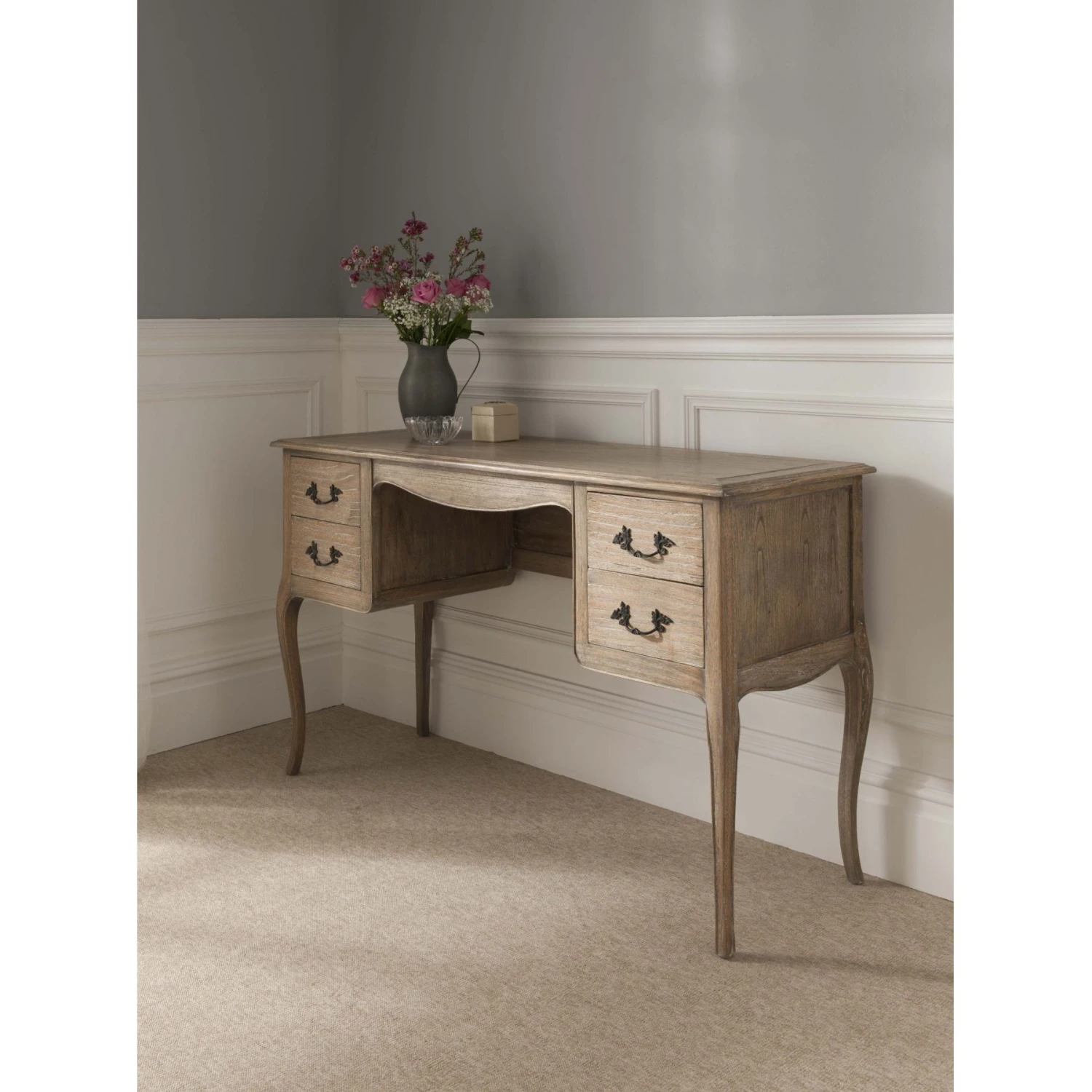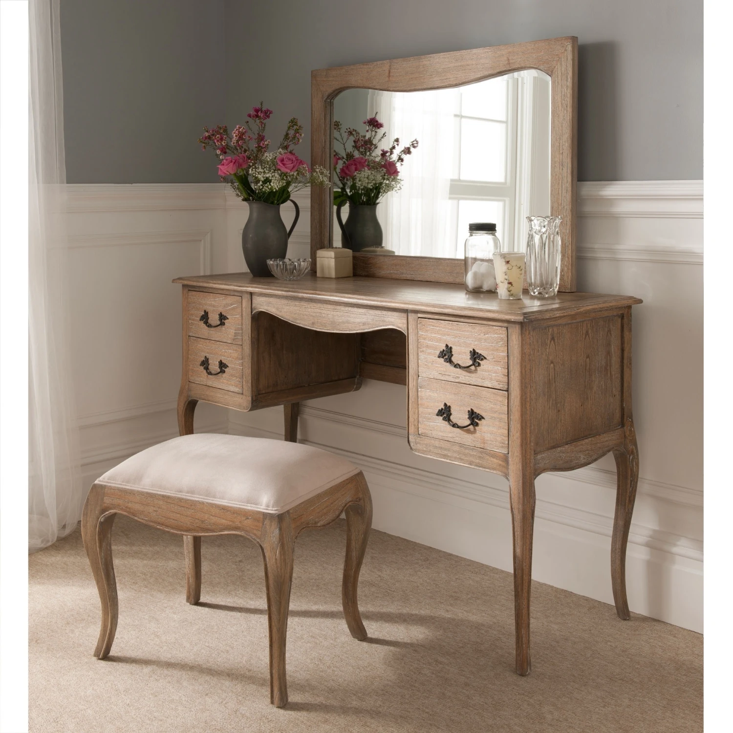 Our exciting range of French furniture now includes our new range addition, the Montpellier Blanc Collection. Made from solid Mindi wood, this dressing table set has everything you need in terms of aesthetics and practicality. This stunning dressing table set works well co-ordinated along side other matching pieces such as our shabby chic furniture or simply as a statement piece on its own.