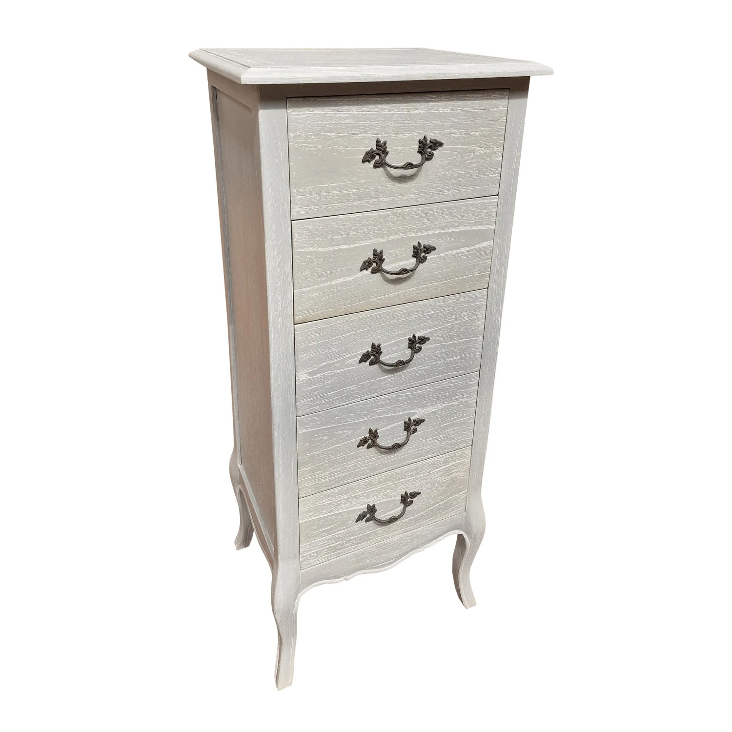 This beautiful Montpellier Blanc Sage Green Tallboy has a nice subtle sage green finish to bring calm and tranquillity to any home. Complete with 5 drawers for all your storage needs, this French style tallboy chest is made from solid Mindi wood for a natural look.