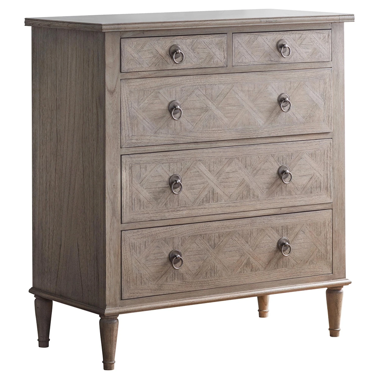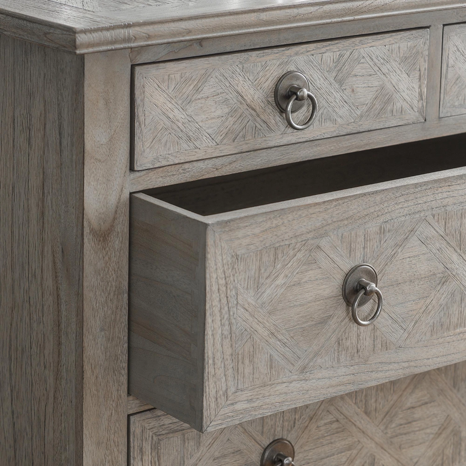 Bring your home alive with this stunning and beautiful brand new large chest of drawers which Homesdirect365 have to offer. Made from Mindy wood to give it a overall twist of modern and French style . This is the perfect addition to any bedroom as it gives you a very decorated and detailed touch.Â
