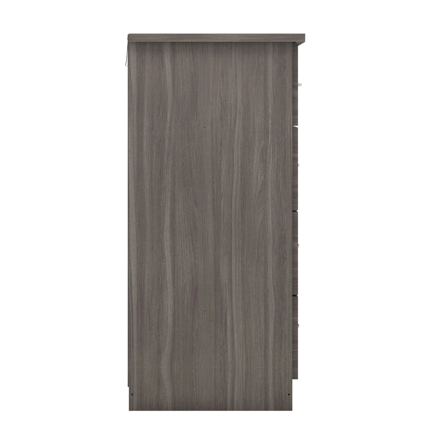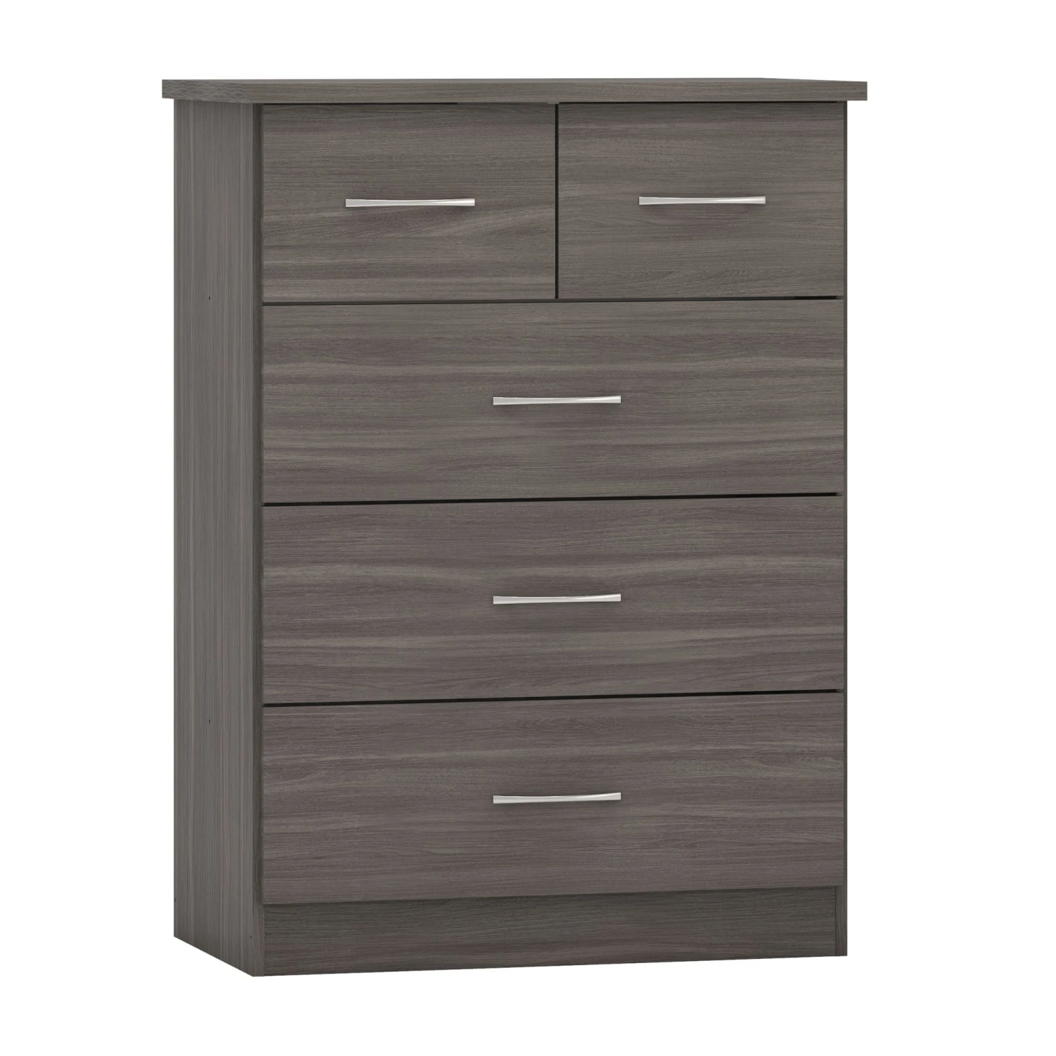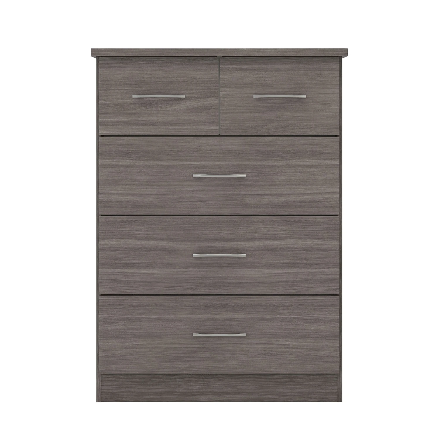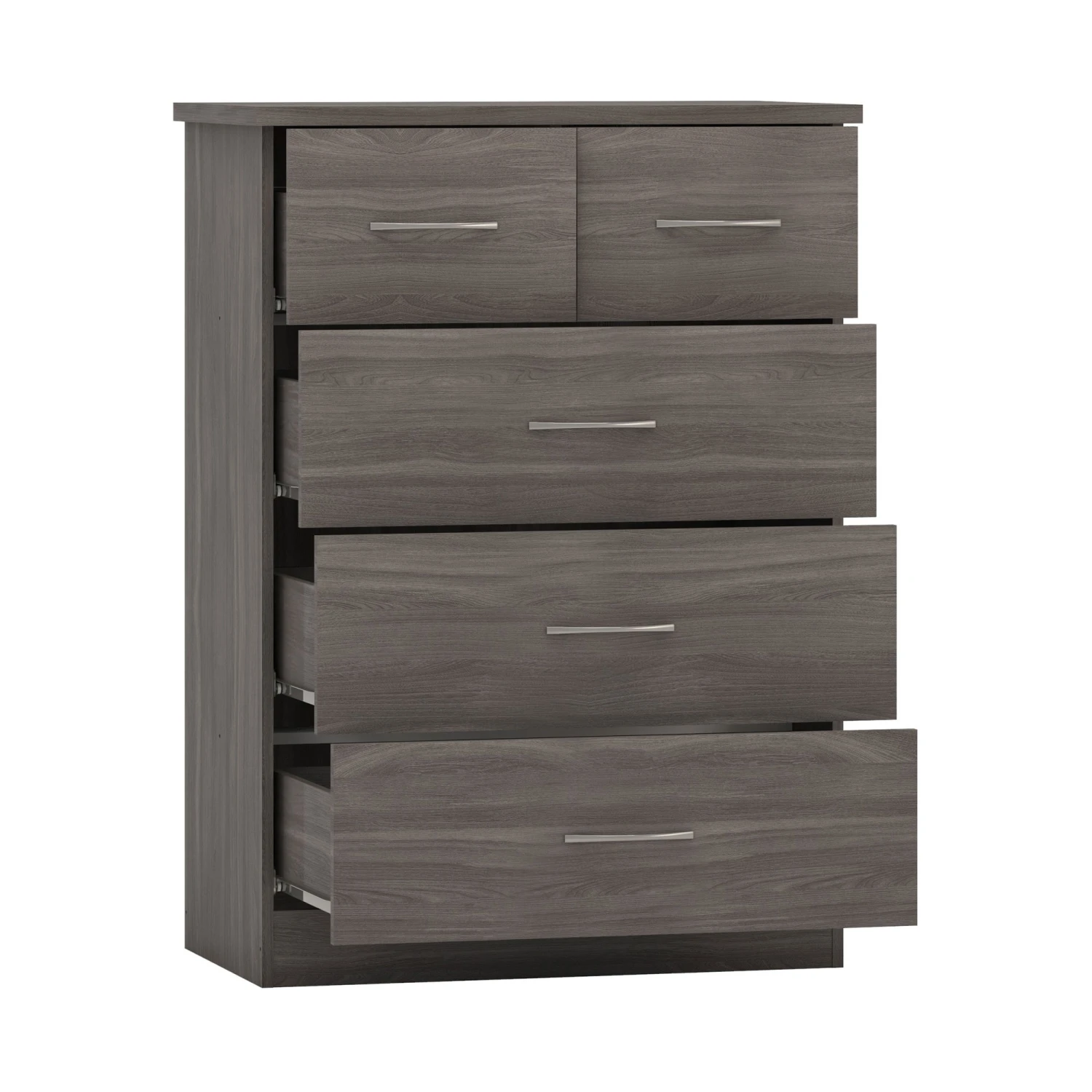 Bringing style and practicality to your bedroom, this Nevada Black 3+2 Drawer Chest will provide extra storage space from its 2 over 3 drawer design. Ideal for folding your clothes neatly away, they come on metal runners to easily slide out using long metal handles. The black wood grain finish offers a rustic style and will be a welcomed addition in any bedroom. With an anti-tip strap included for additional safety, this chest of drawers boasts a contemporary design and is solidly built to last you many years.