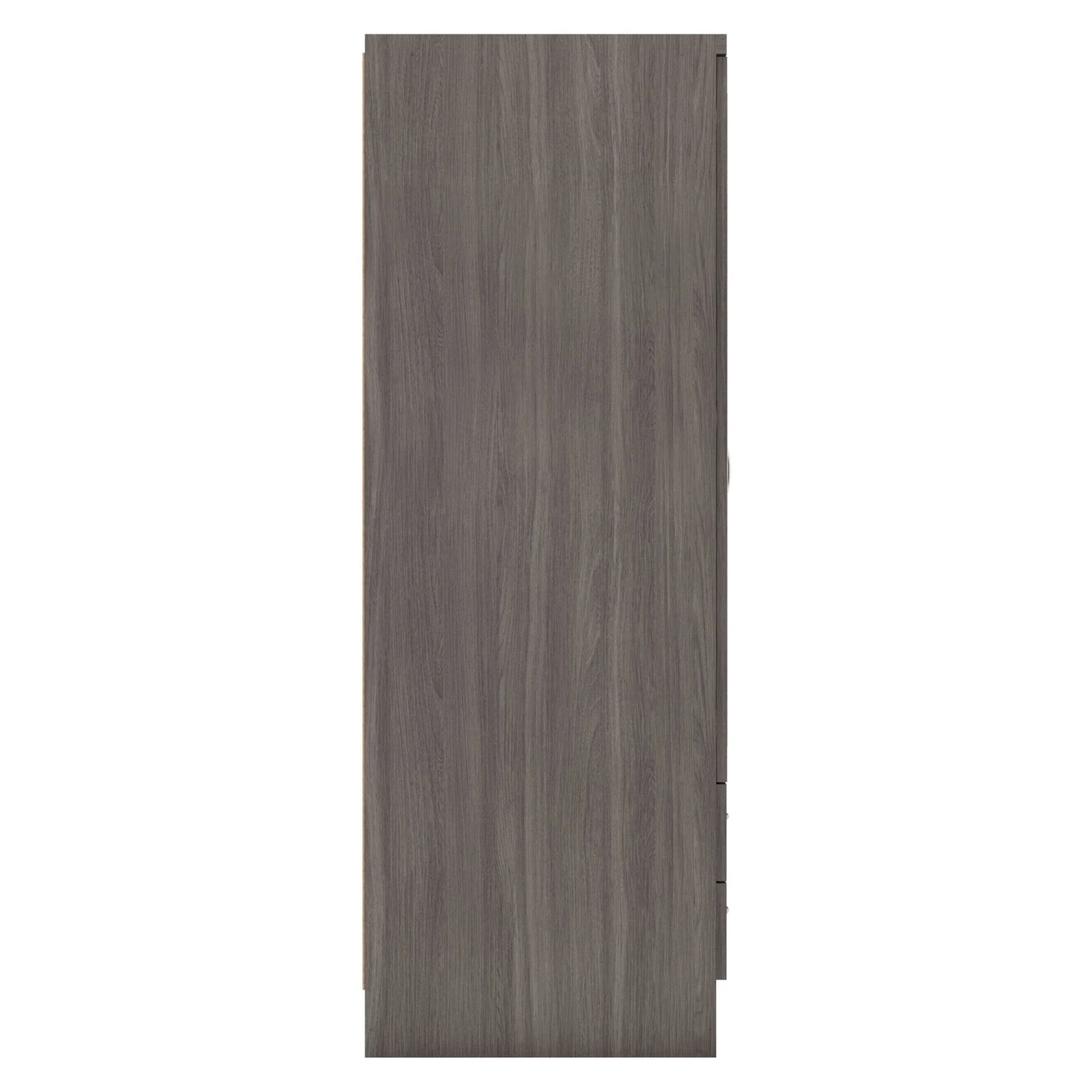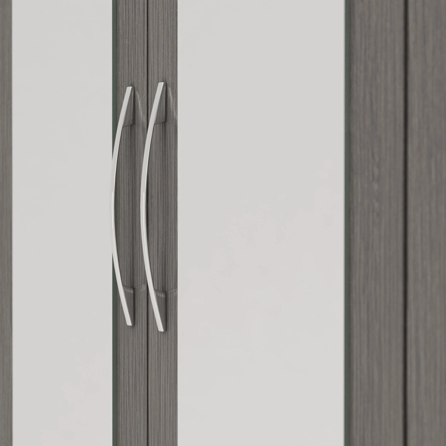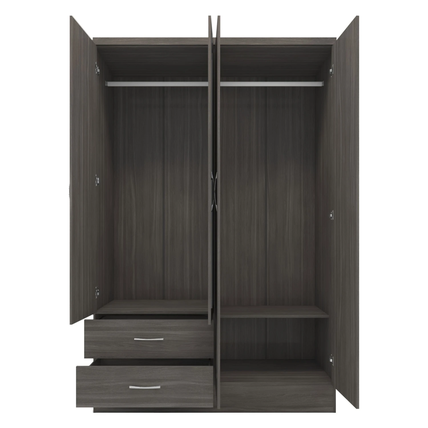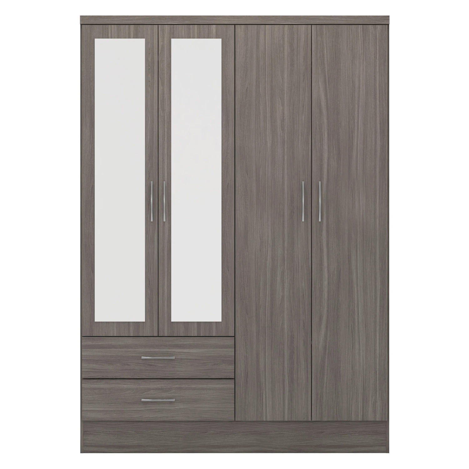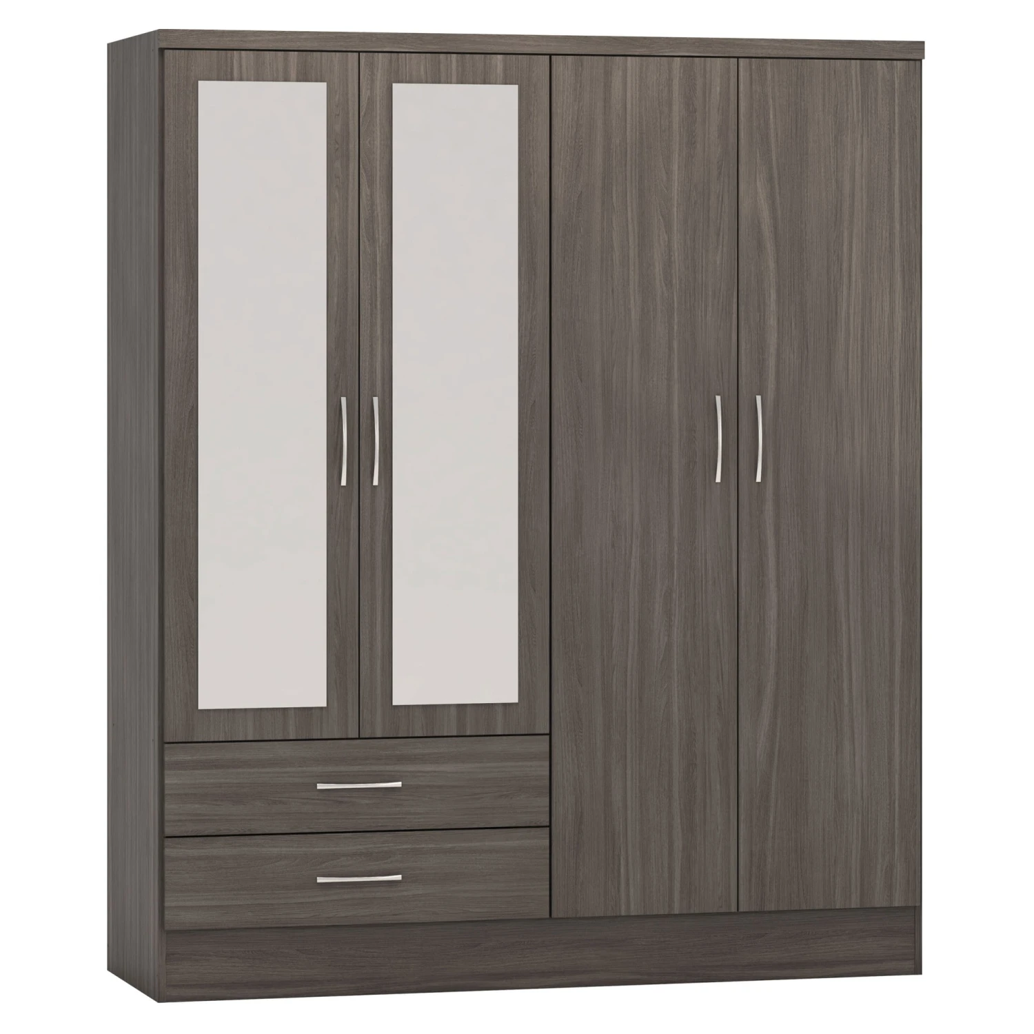 Designed to provide you with a generous amount of storage space, this Nevada Black 4 Door 2 Drawer Mirrored Wardrobe will be an ideal practical piece of furniture that offers storage space in many forms. With 4 doors, 2 of which have a mirrored front for checking out how you look when getting ready, they feature internal hanging rails and shelving to store clothing items. Underneath there is a 2 drawer storage system to allow you to neatly fold clothes and is accessible using long metal handles on the drawer and door fronts. Coming in a black wood grain finish, adding character and style, it’s built with hard-wearing materials to create a long-lasting finish, giving you a piece of furniture that will last you many years.