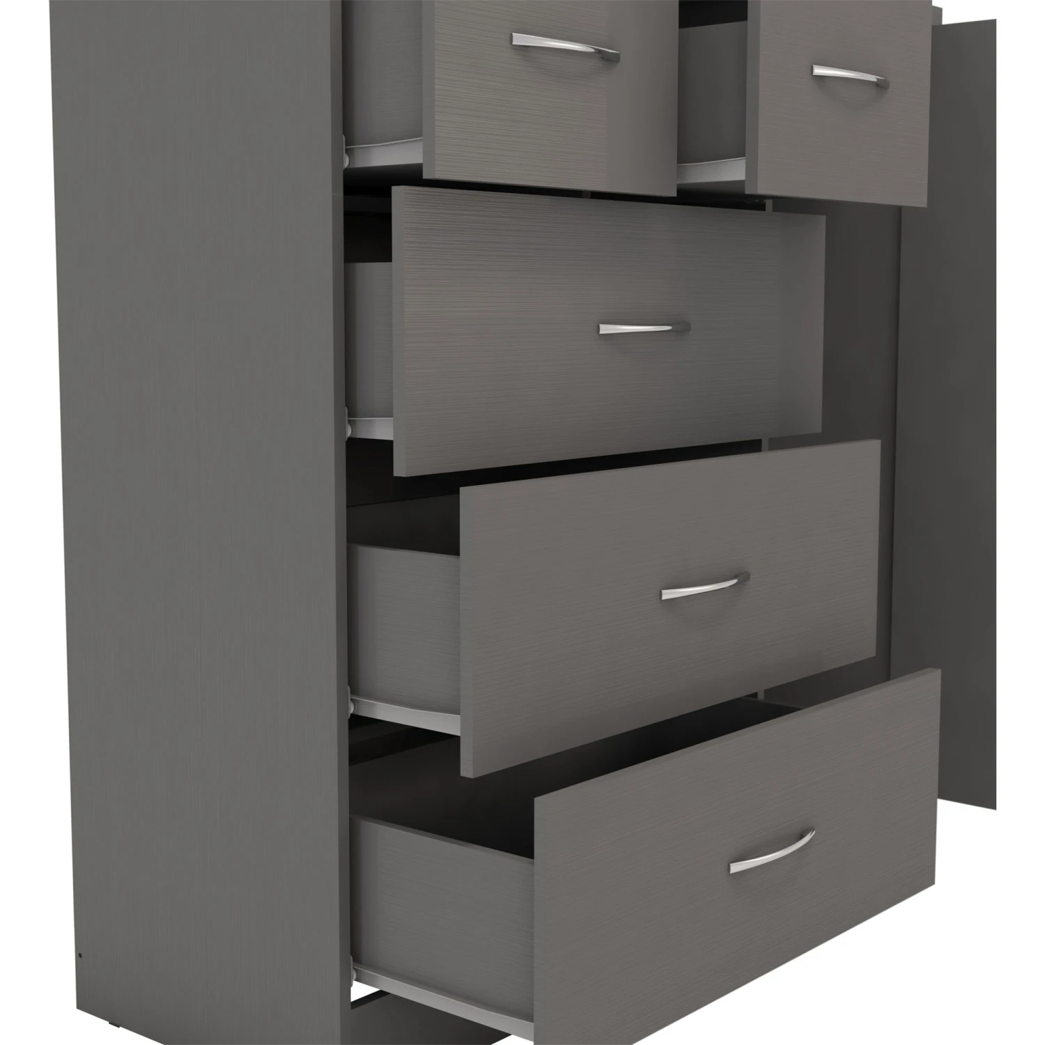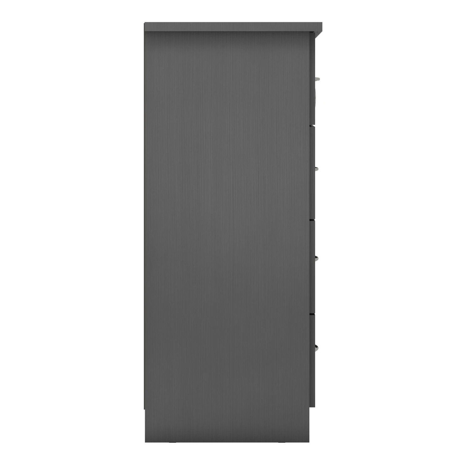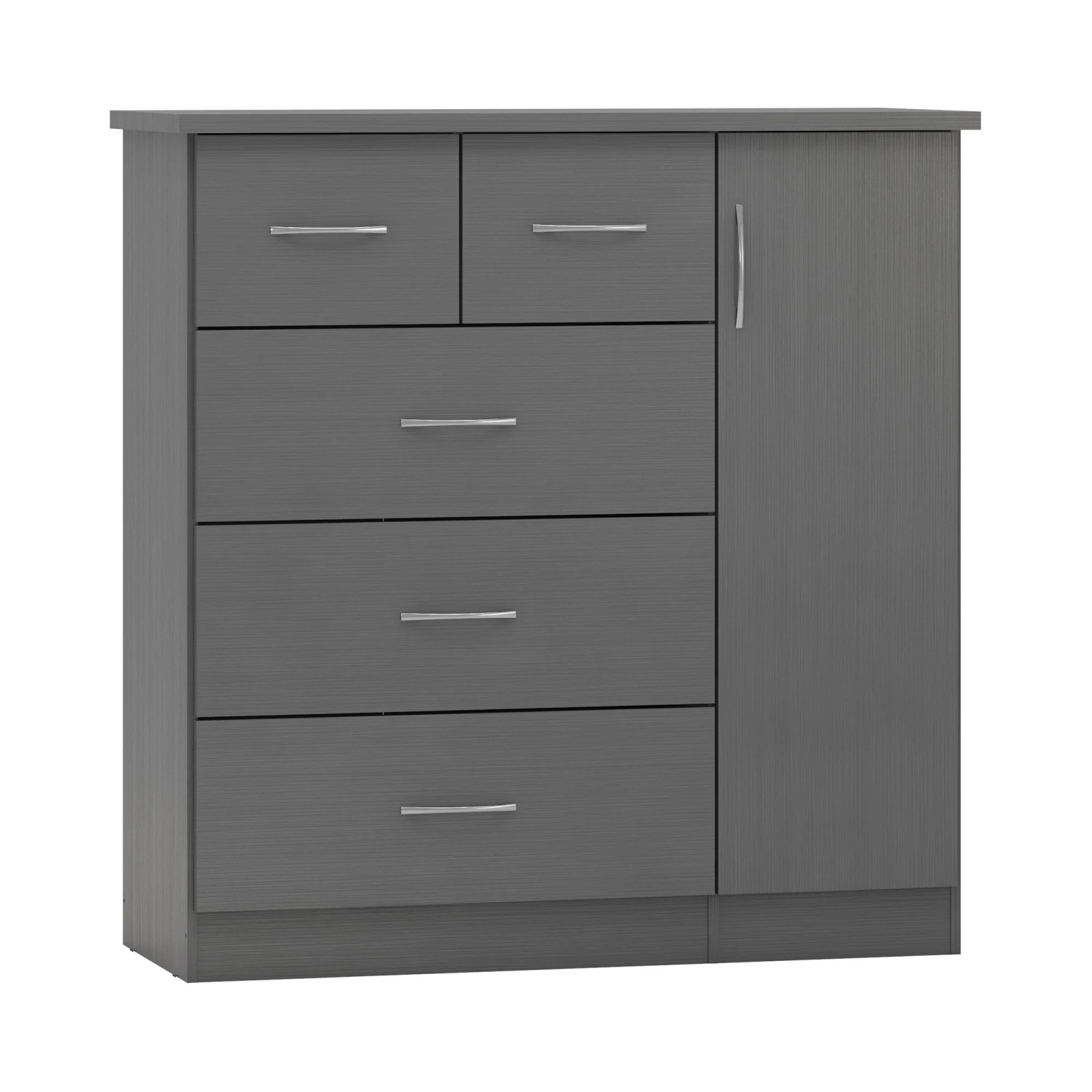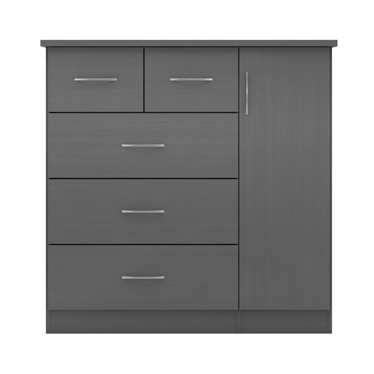 Low on space in your bedroom but need a space-saving solution? Introducing this brand new Nevada Grey 5 Drawer Low Wardrobe. With 5 drawers to the left of varying sizes, it allows you to store socks, T-shirts and trousers with a door to the right featuring an internal hanging rail for jackets and shirts. A practical way to combat limited floorspace, this solidly built wooden wardrobe comes in a 3D effect grey finish and is designed with a contemporary style that is simple and sleek for a modern style of interior. It comes finished with long silver metal handles to complete the look.