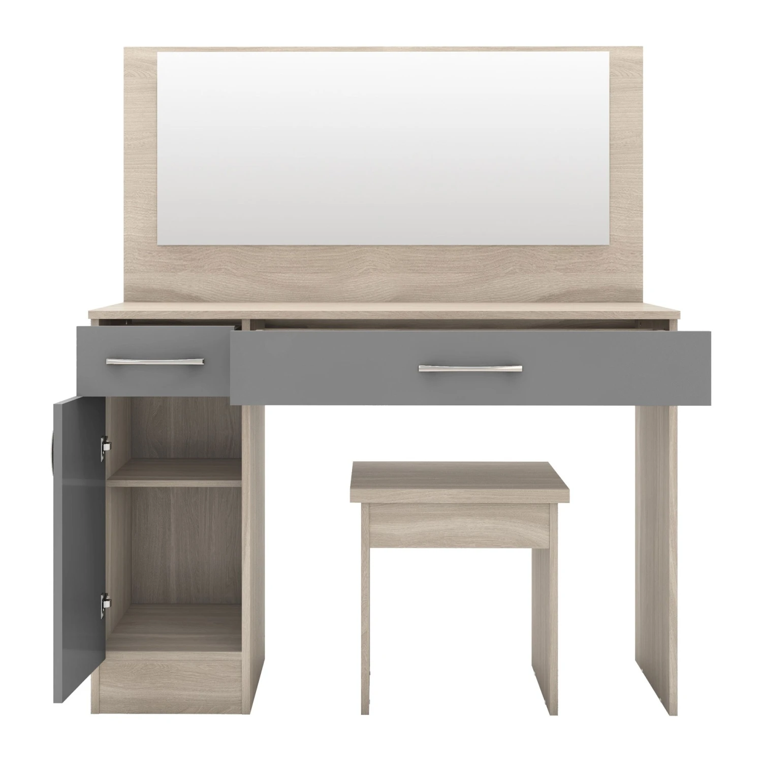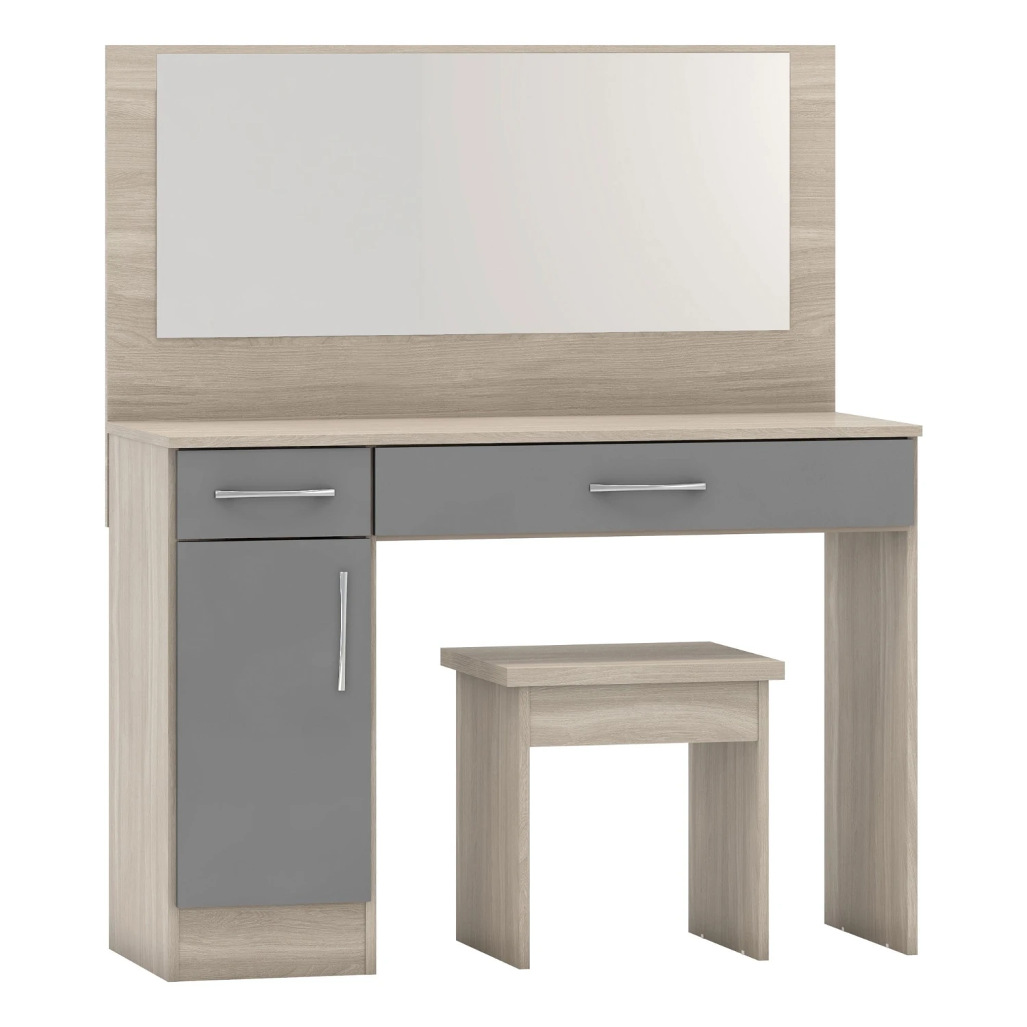 Make your bedroom the place to get ready when you organise all your makeup, hair care and styling products inside or on top of this modern Nevada Grey Gloss & Light Oak Veneer Vanity/Dressing Table Set. Beautifully crafted from wooden materials with a glass mirror included, it comes with 2 drawers and 1 door of storage. The perfect bedroom furniture that will make getting ready in the morning that bit better.