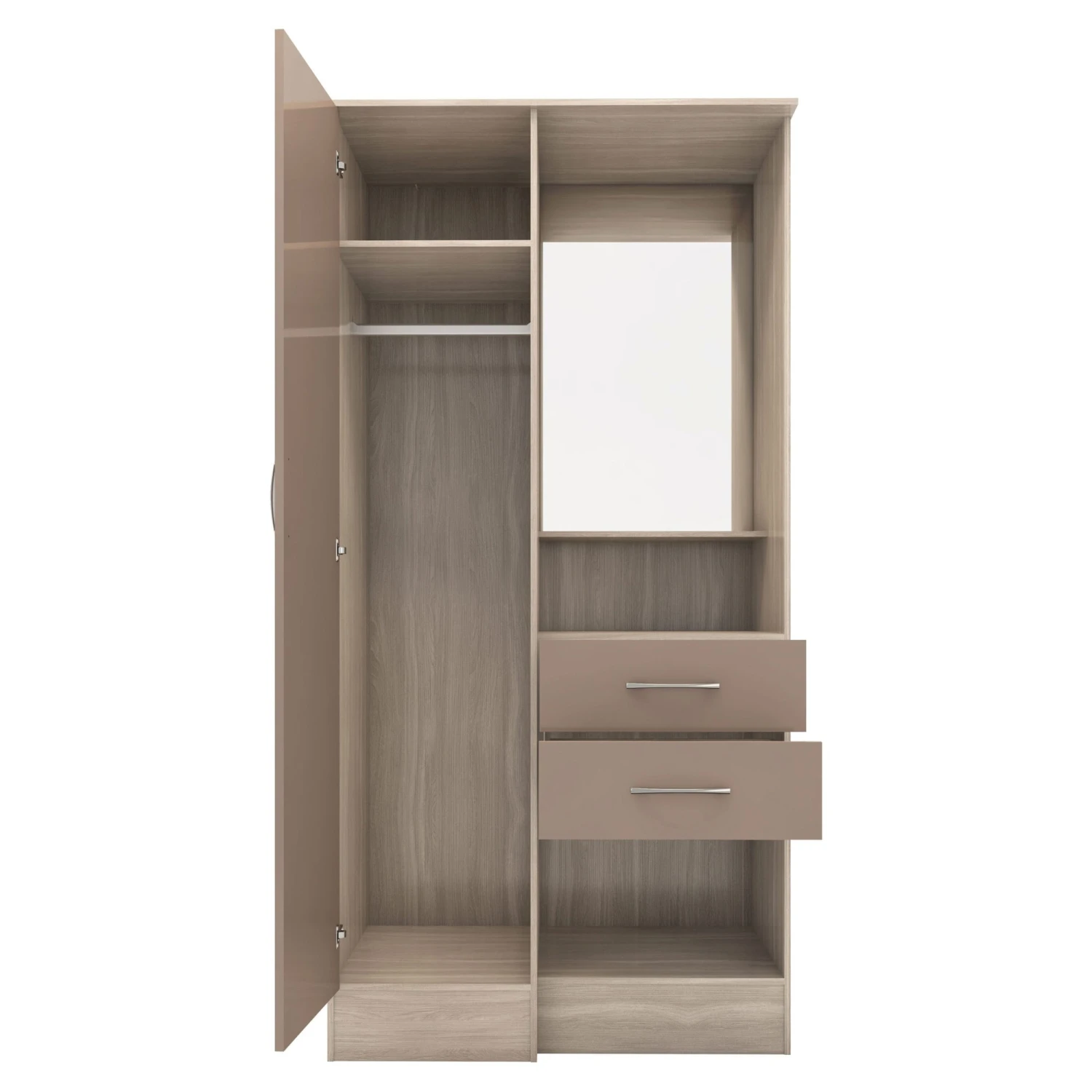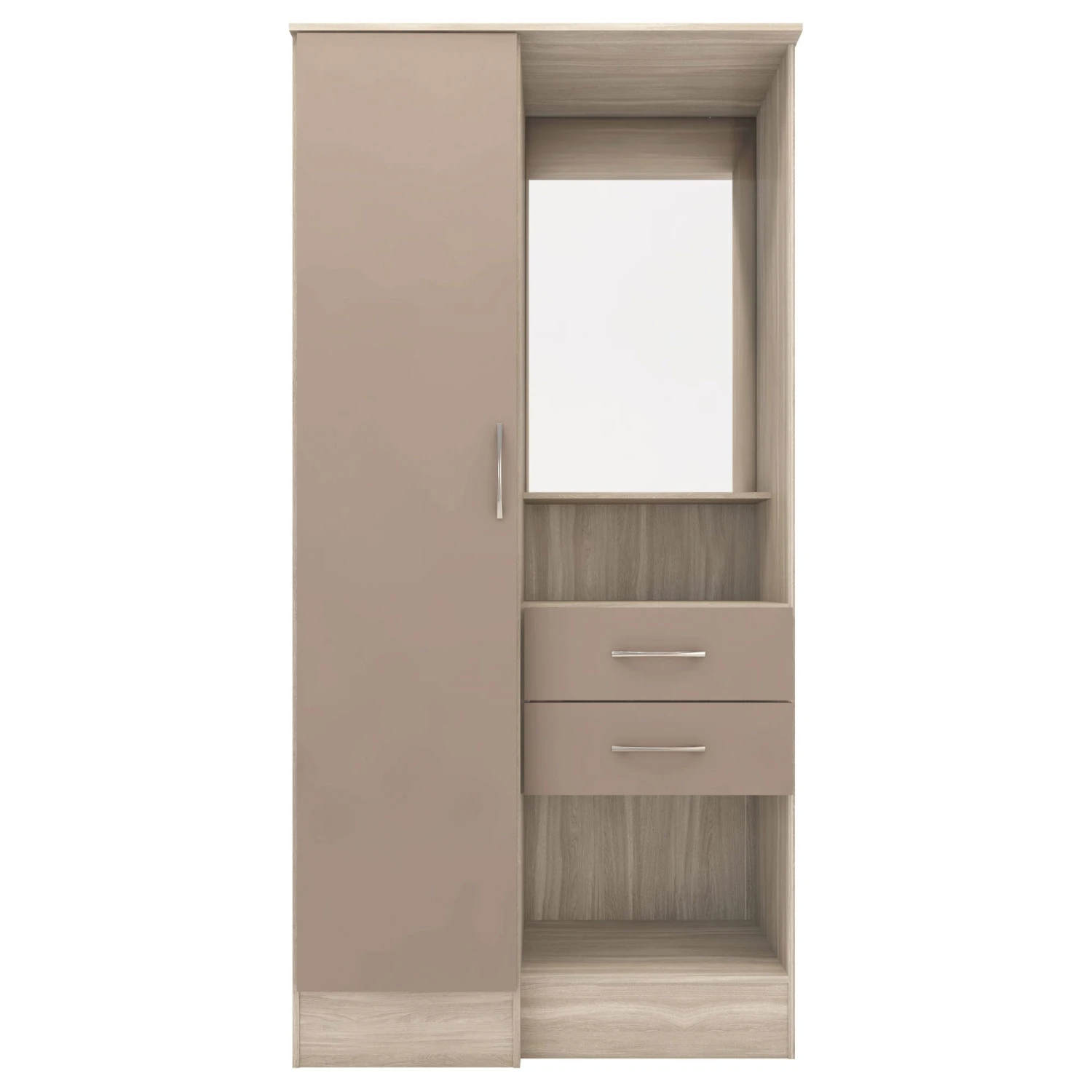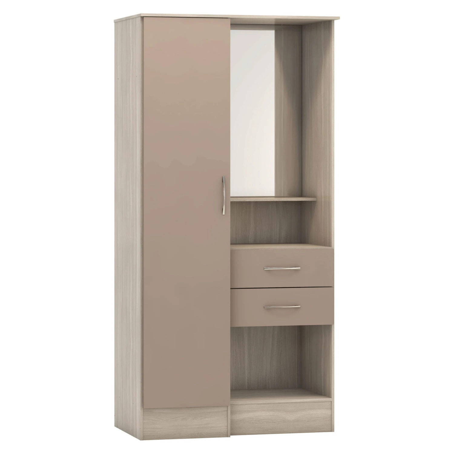 Manufactured with high quality materials, the Nevada Oyster Gloss/Light Oak Effect Veneer Vanity 1 Door Wardrobe makes for a contemporary bedroom furniture piece that offers storage solutions alongside style and practicality.Â