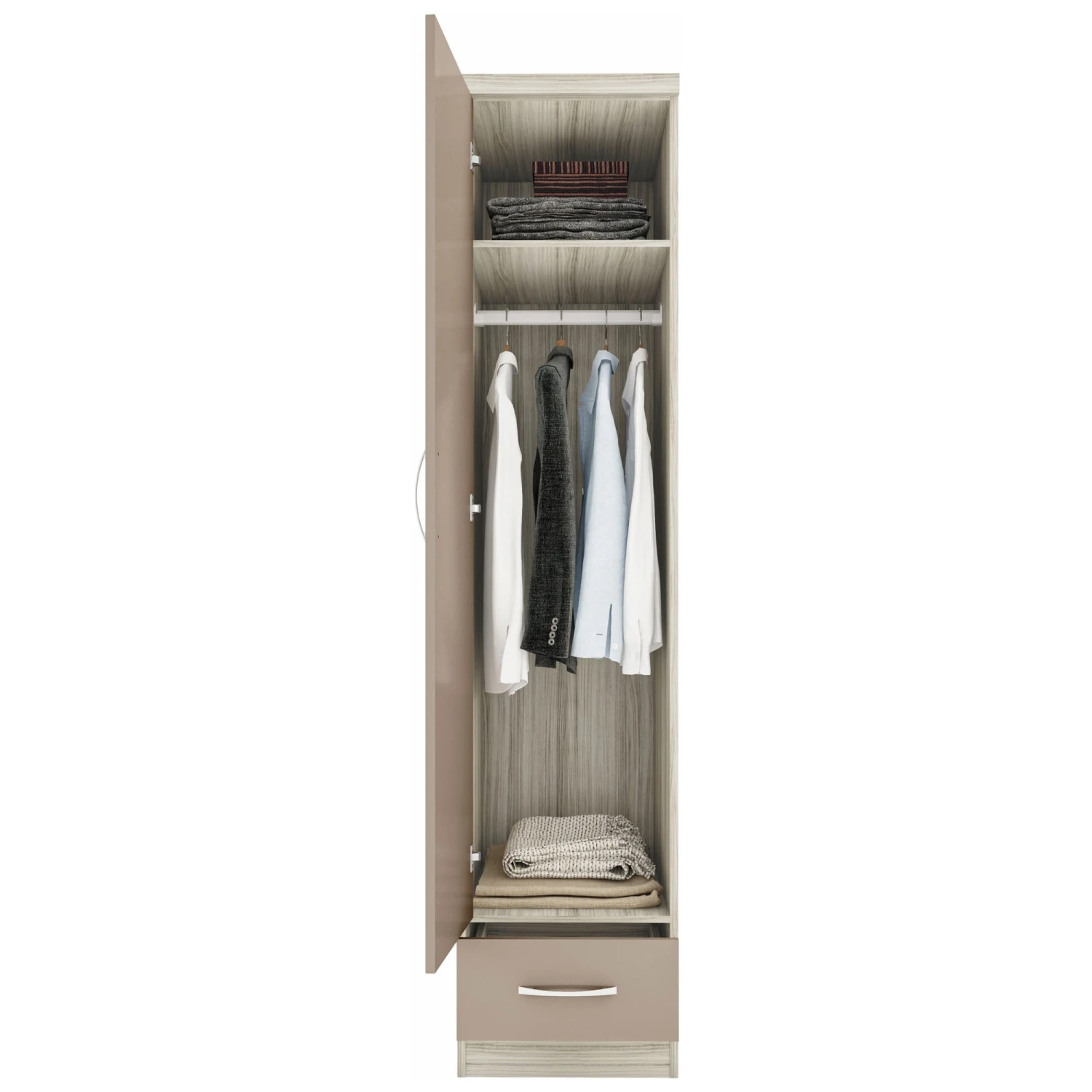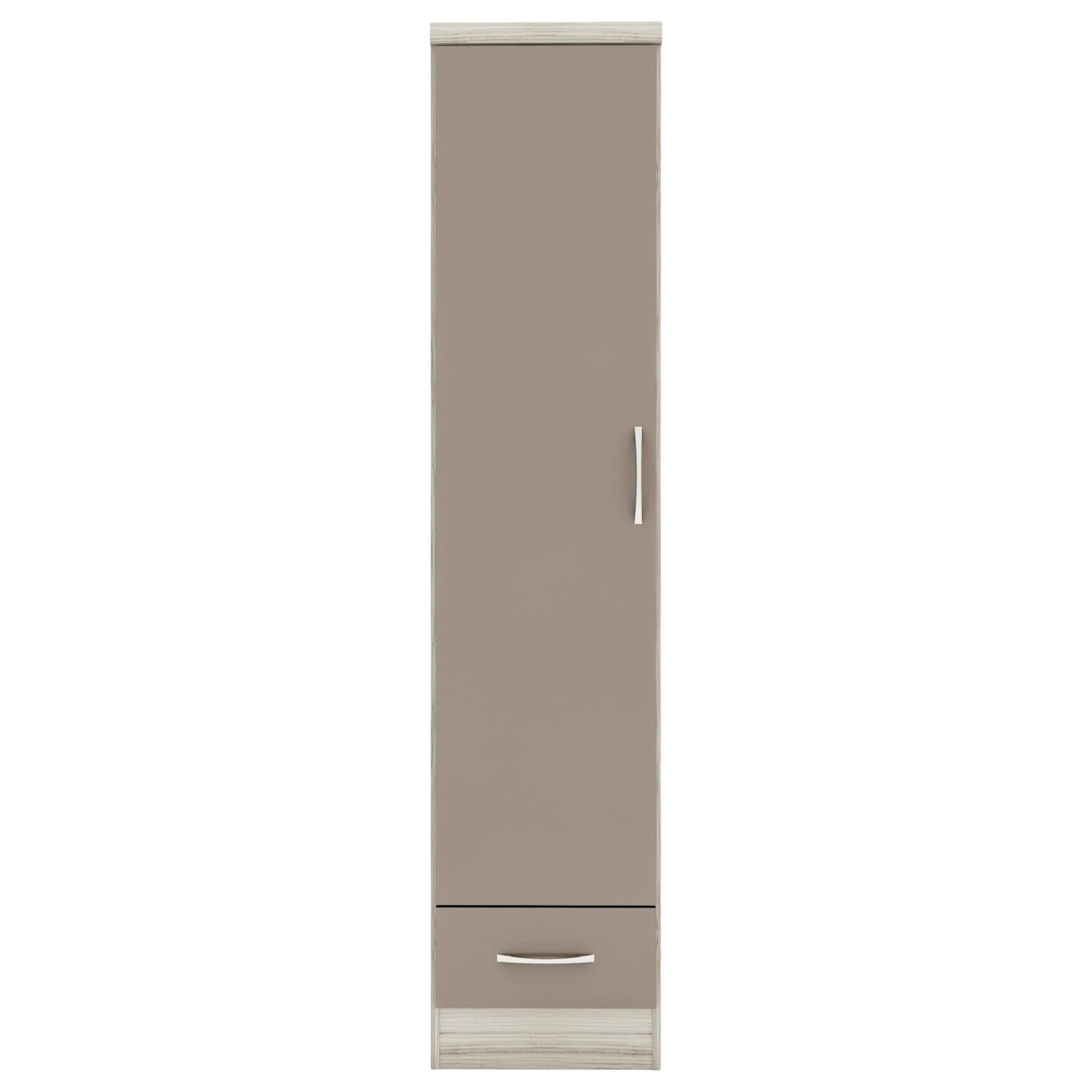 The ideal size for smaller bedrooms in the home or for guests staying in a spare room, the Nevada Oyster Gloss & Light Oak Veneer 1 Door 1 Drawer Wardrobe provides enough space for hanging your immediate clothing. Coming with an internal hanging rail and shelf above, you can pop shoes or bags on top whilst hanging T-shirts, trousers, and jumpers below with a handy drawer for neatly folded shirts and jeans. Expertly manufactured, it has a light oak finish with an oyster glossed door and drawer front, which adds a modern touch to your home.Â