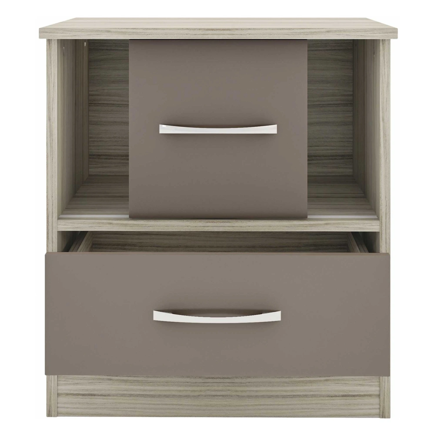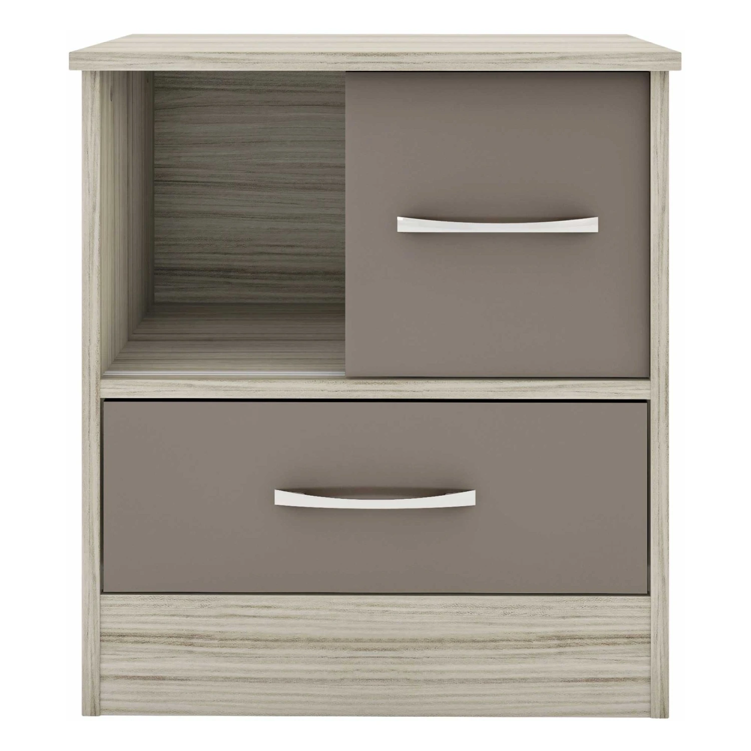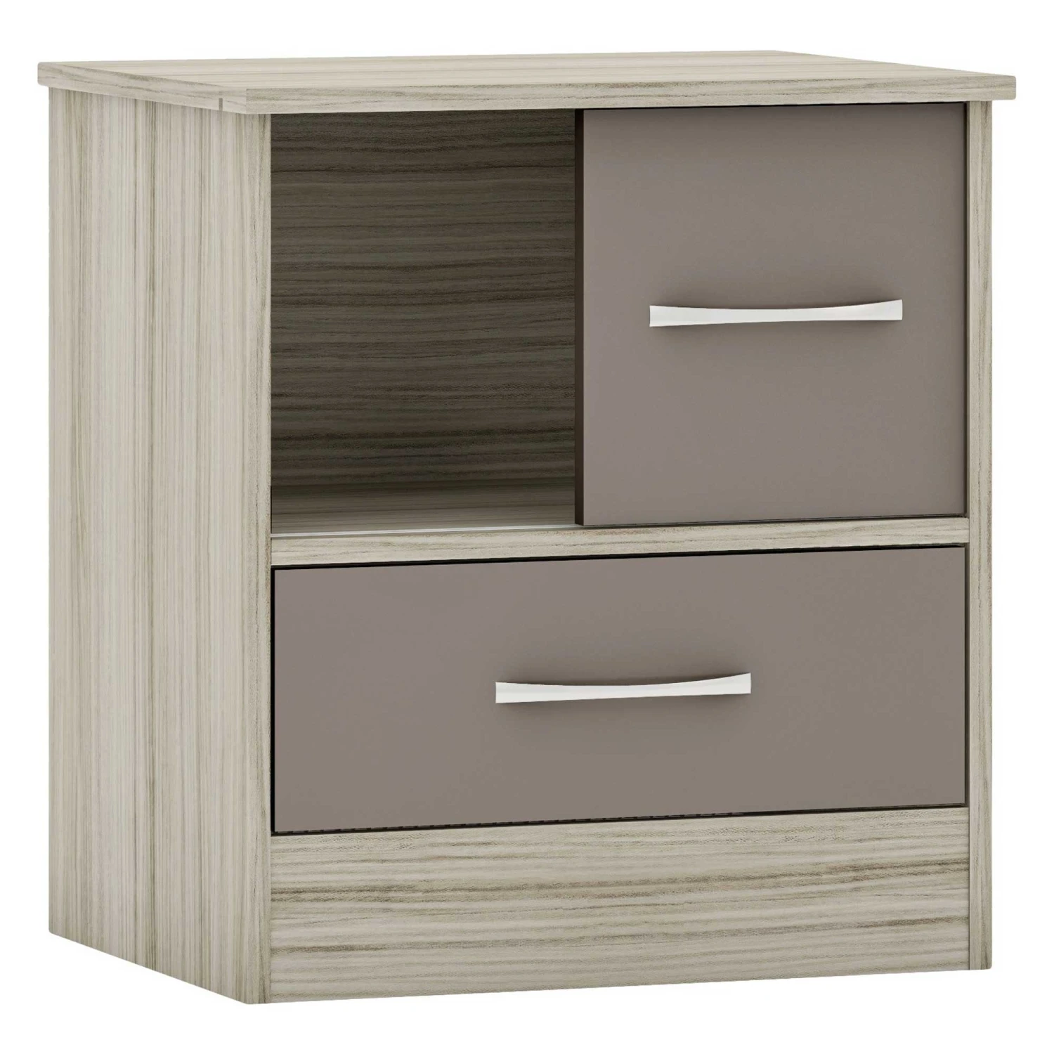 Complete your Nevada Bedroom Collection with this beautiful Nevada Oyster Gloss Sliding Door Bedside! Ideal for all modern bedrooms, this sliding door bedside also comes with 1 drawer storage, great for all your overnight essentials! This contemporary style bedside is finished with a smooth Oyster Gloss and Light Oak Effect Veneer. Also available in other colours.Â