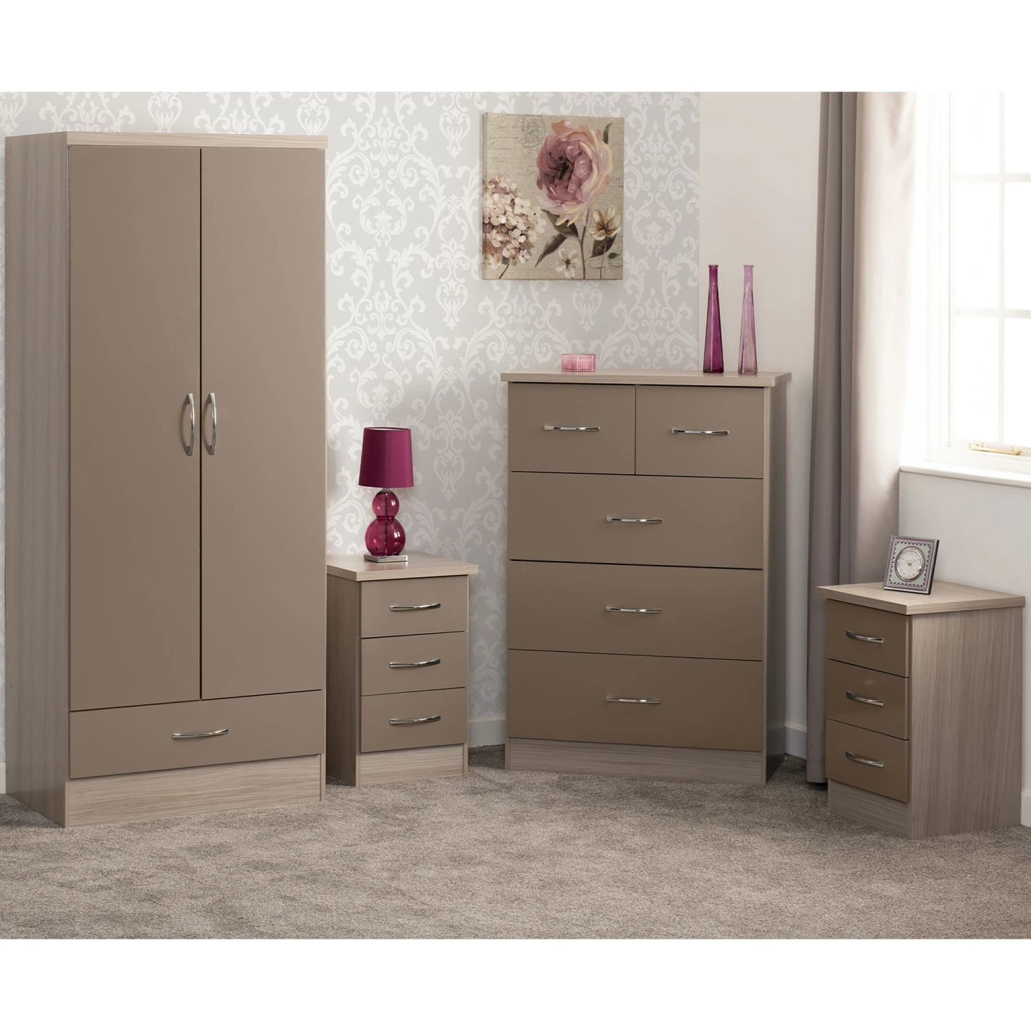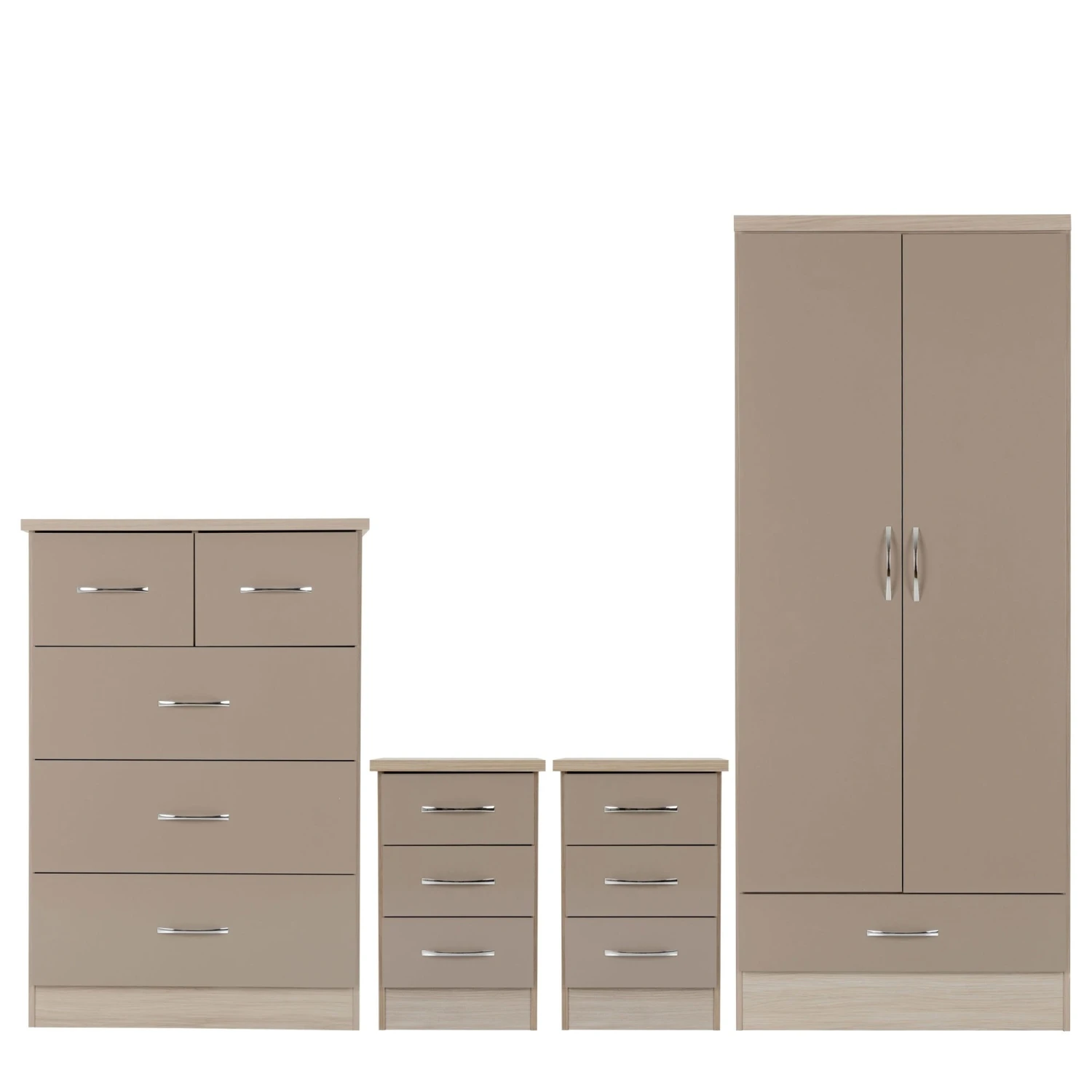 Complete the set-up of your bedroom when you introduce this Nevada Oyster & Light Oak 2 Door 1 Drawer Wardrobe Bedroom Set. All that you need to store your clothings items in one full set consisting of a wardrobe, chest of drawers and 2 bedside tables. Manufactured to be a high quality sleek bedroom set, it comes in an oyster gloss and light oak finish.Â