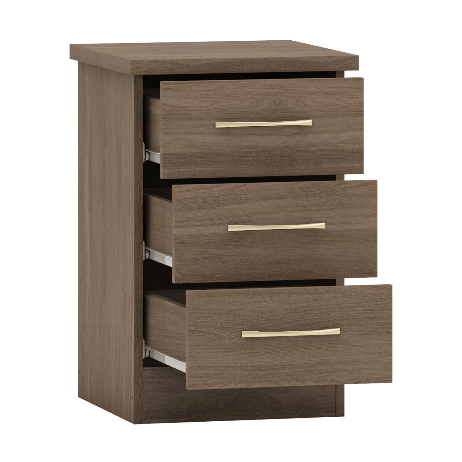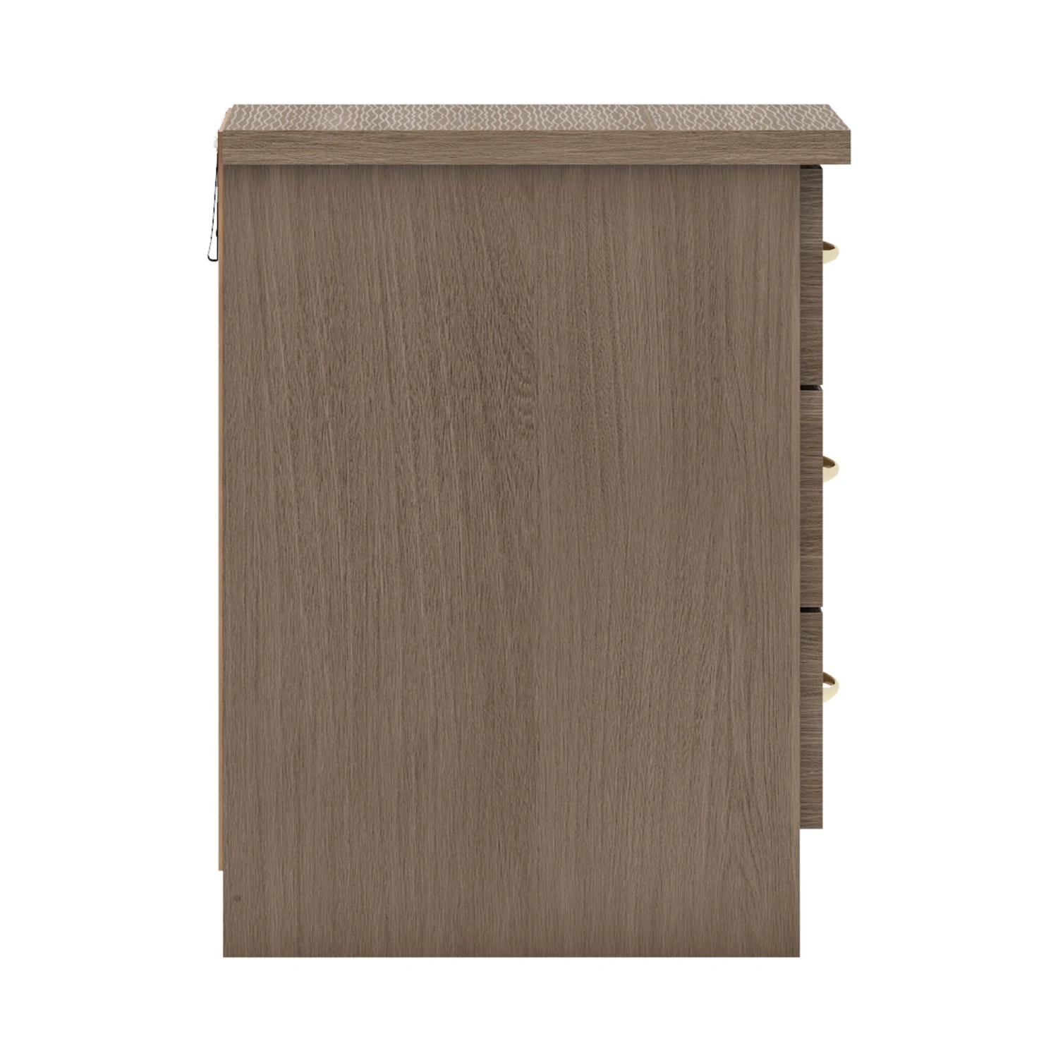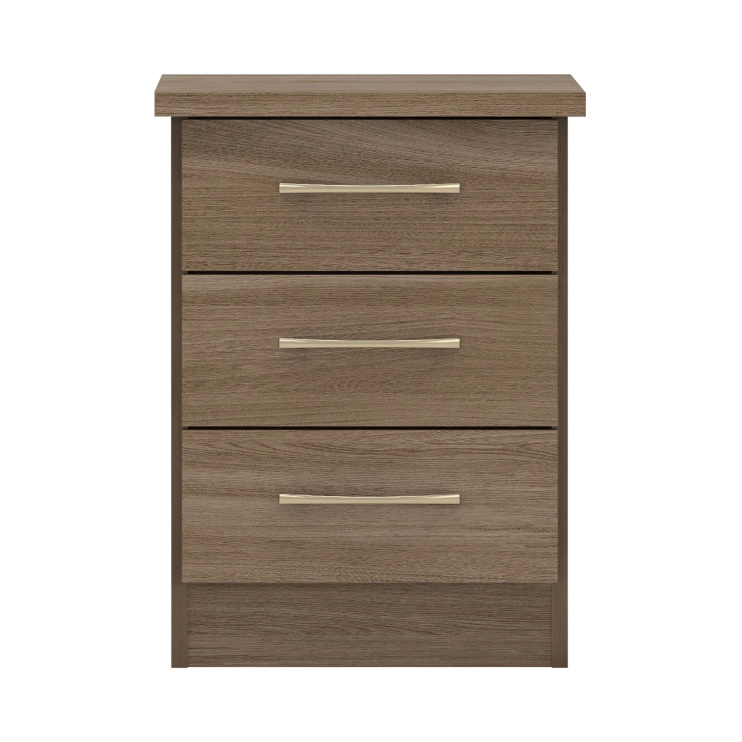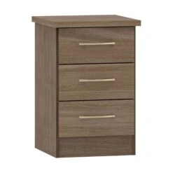 Ideal for holding your table lamp and alarm clock, this Nevada Rustic Oak 3 Drawer Bedside will make a great addition placed next to your bed. With 3 spacious drawers, offering a vast amount of extra storage space in your room, it can be used to store your nighttime essentials such as books, an eye mask or sleep aids. A side table that every bedroom needs, it comes designed with a contemporary style in a rustic oak finish that can be blended into existing modern decor styles relatively easily. The drawers feature long thin metal handles, making it easy to pull out, and it’s crafted from MDF and composite board for a durable, solid build.Â