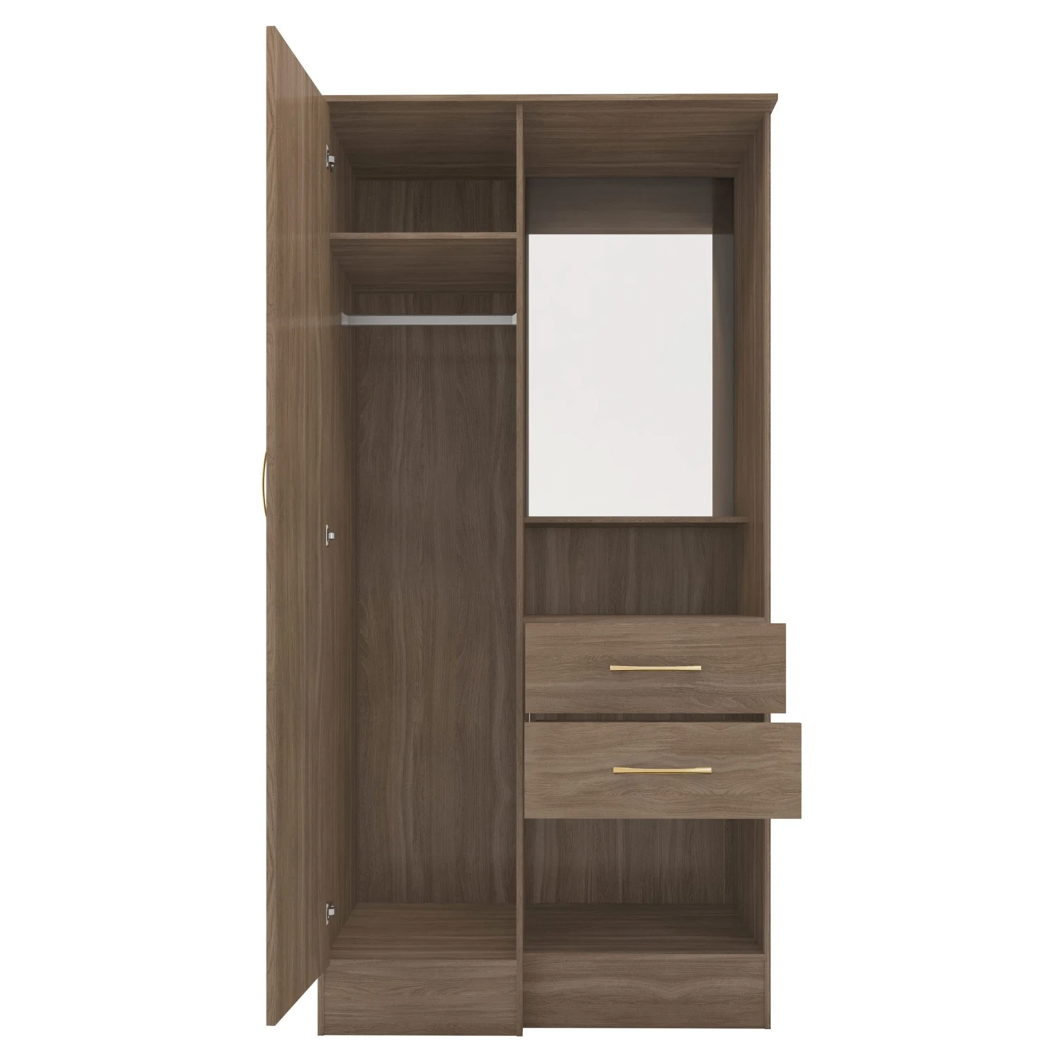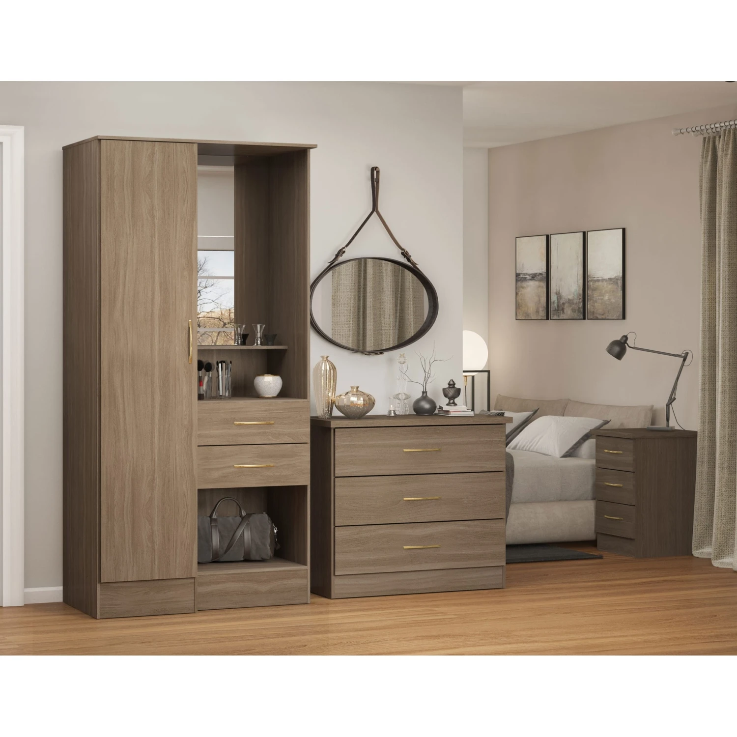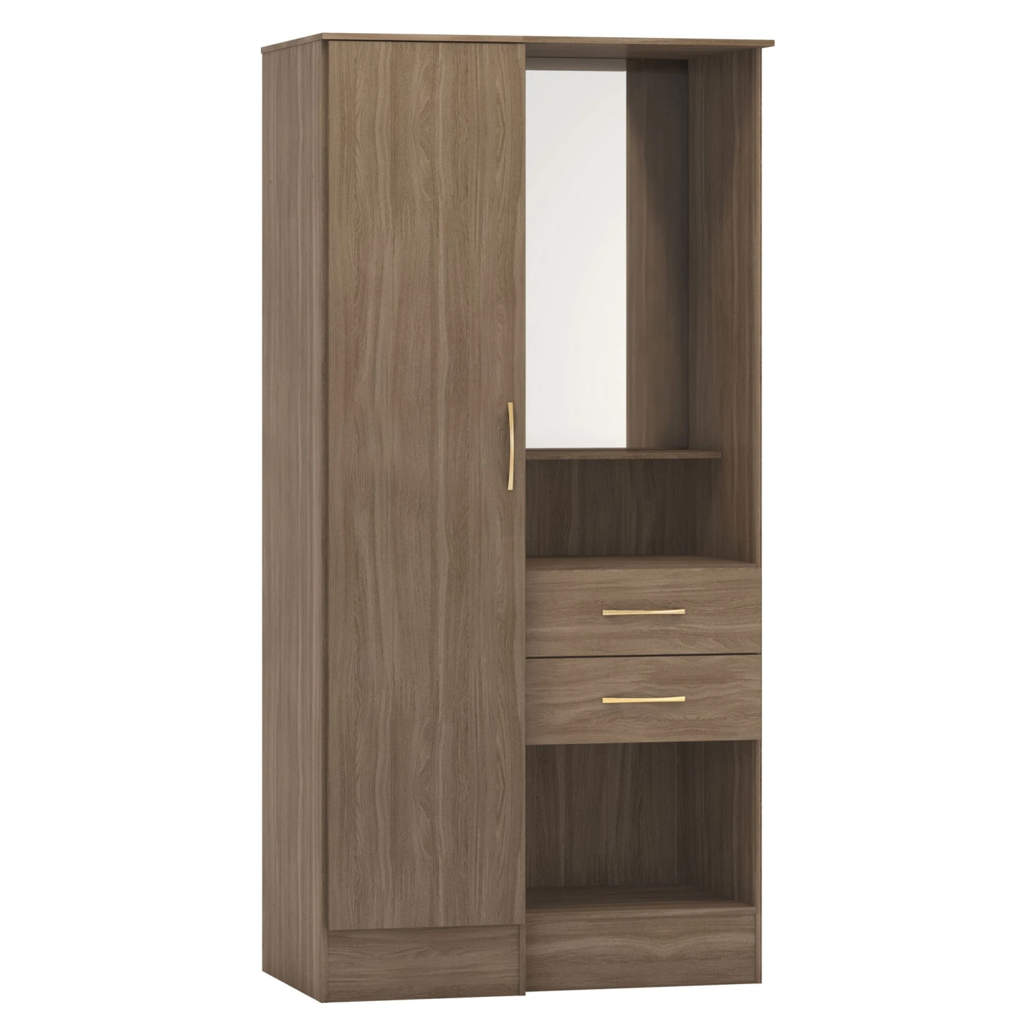 Uniquely designed as a vanity unit and wardrobe combined, this Nevada Rustic Oak Effect Vanity 1 Door Wardrobe is practical and enhances floor space with its compact design with multipurpose design. Providing storage space, it has 1 door with a hanging rail inside, 2 drawers and a handy shelf for perfume bottles, makeup, or accessories. Highly crafted from sturdy, strong materials, it comes in a lovely rustic oak effect shade and is complete with a mirror for self reflection.