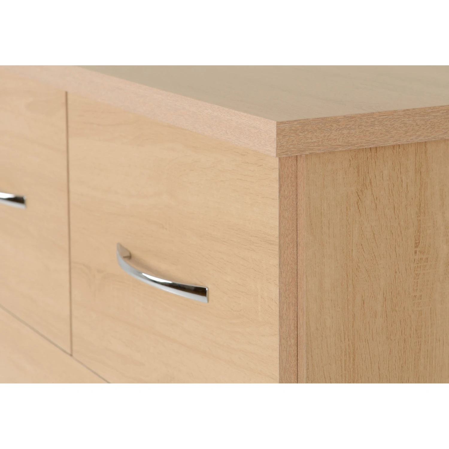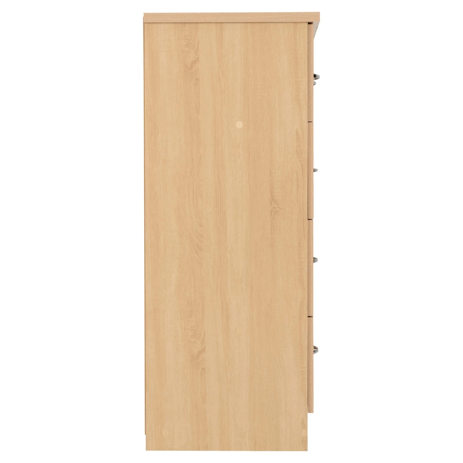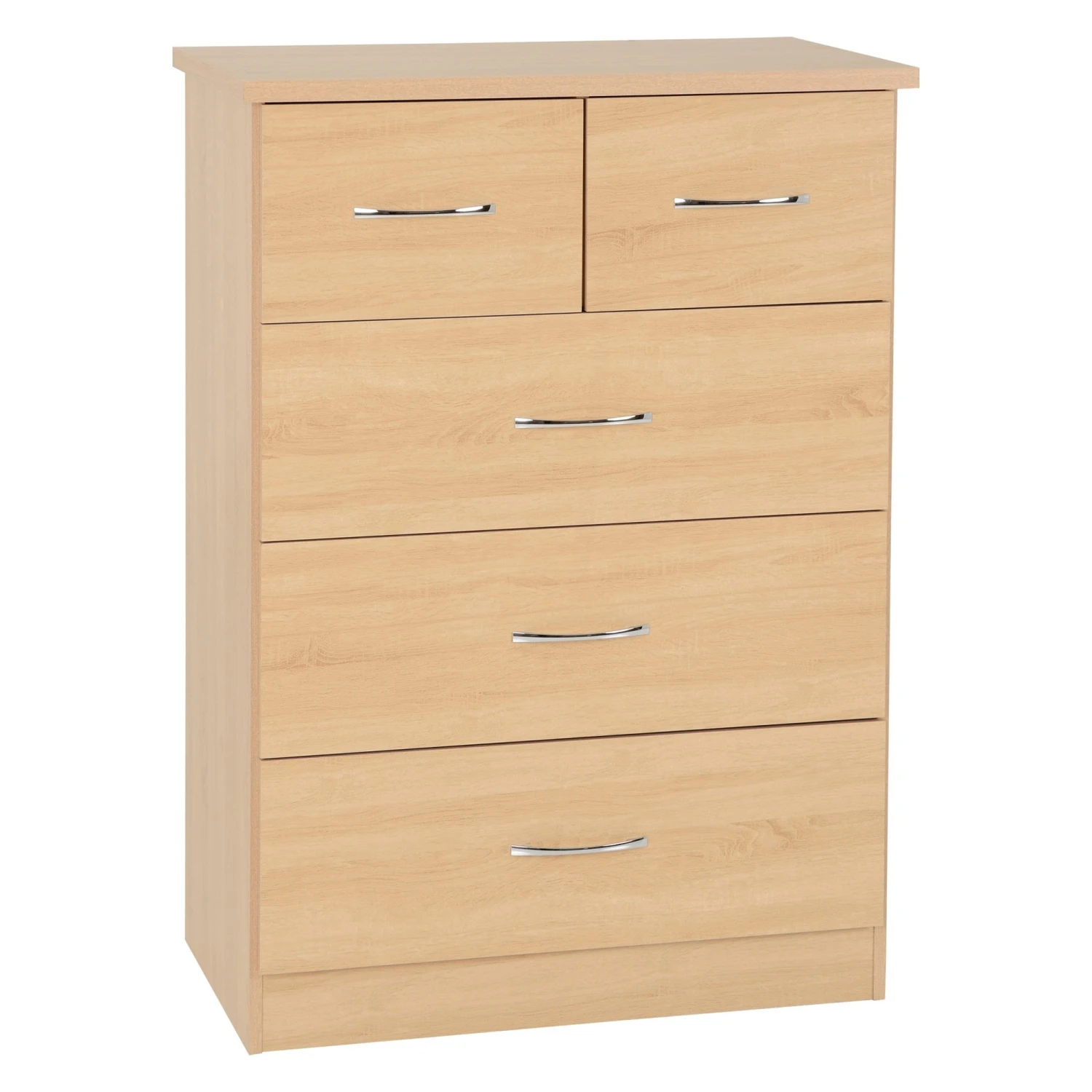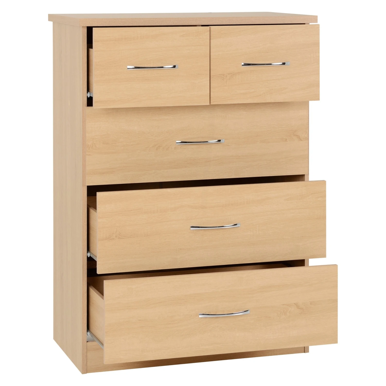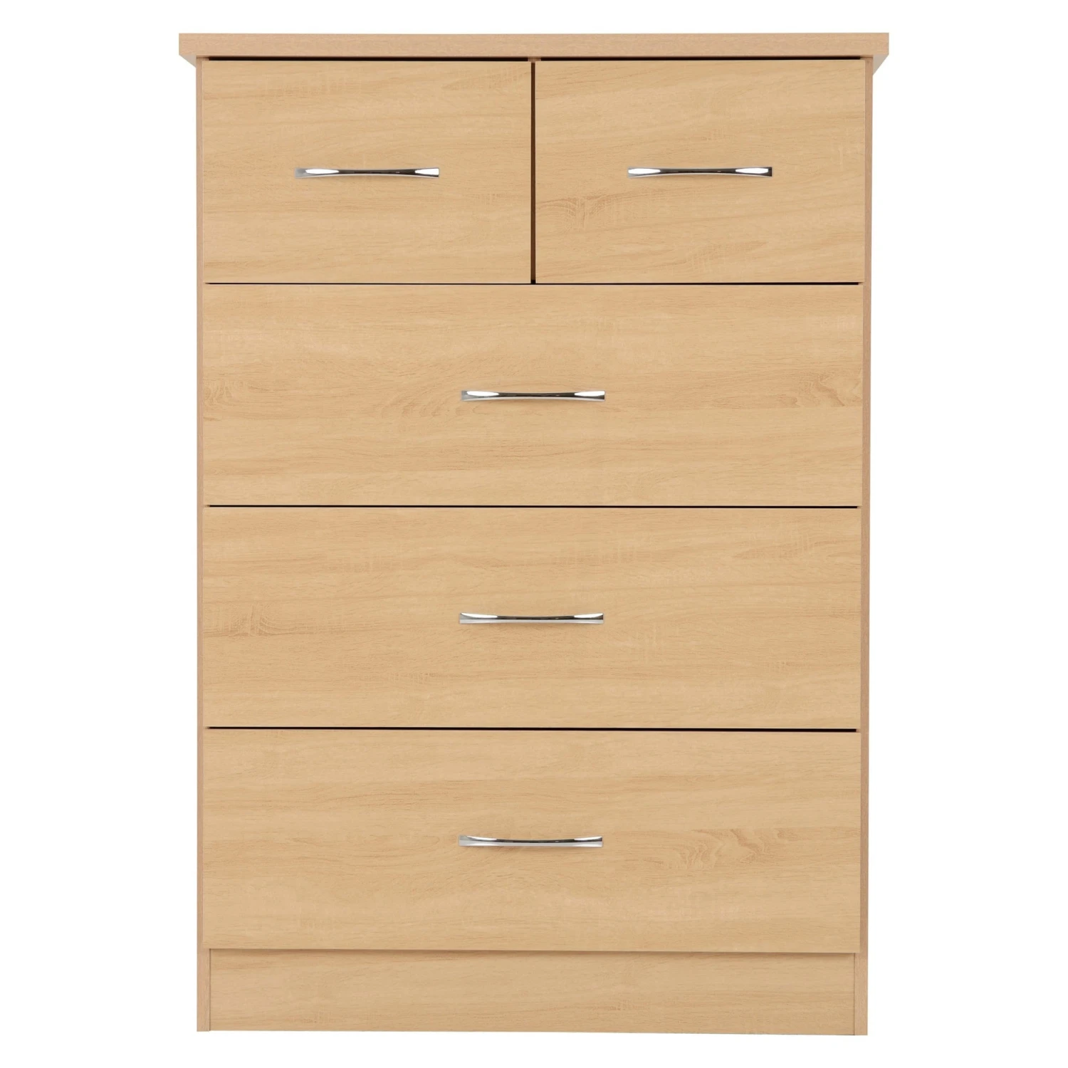 Providing lots of storage space with its 5 drawer build, made of 2 small drawers over 3 large drawers, this Nevada Sonoma Oak Effect 3+2 Drawer Chest will be practical, versatile, and stylish for your home. Crafted from MDF and composite board, it’s built to last and is complete with thin metal handles.Â