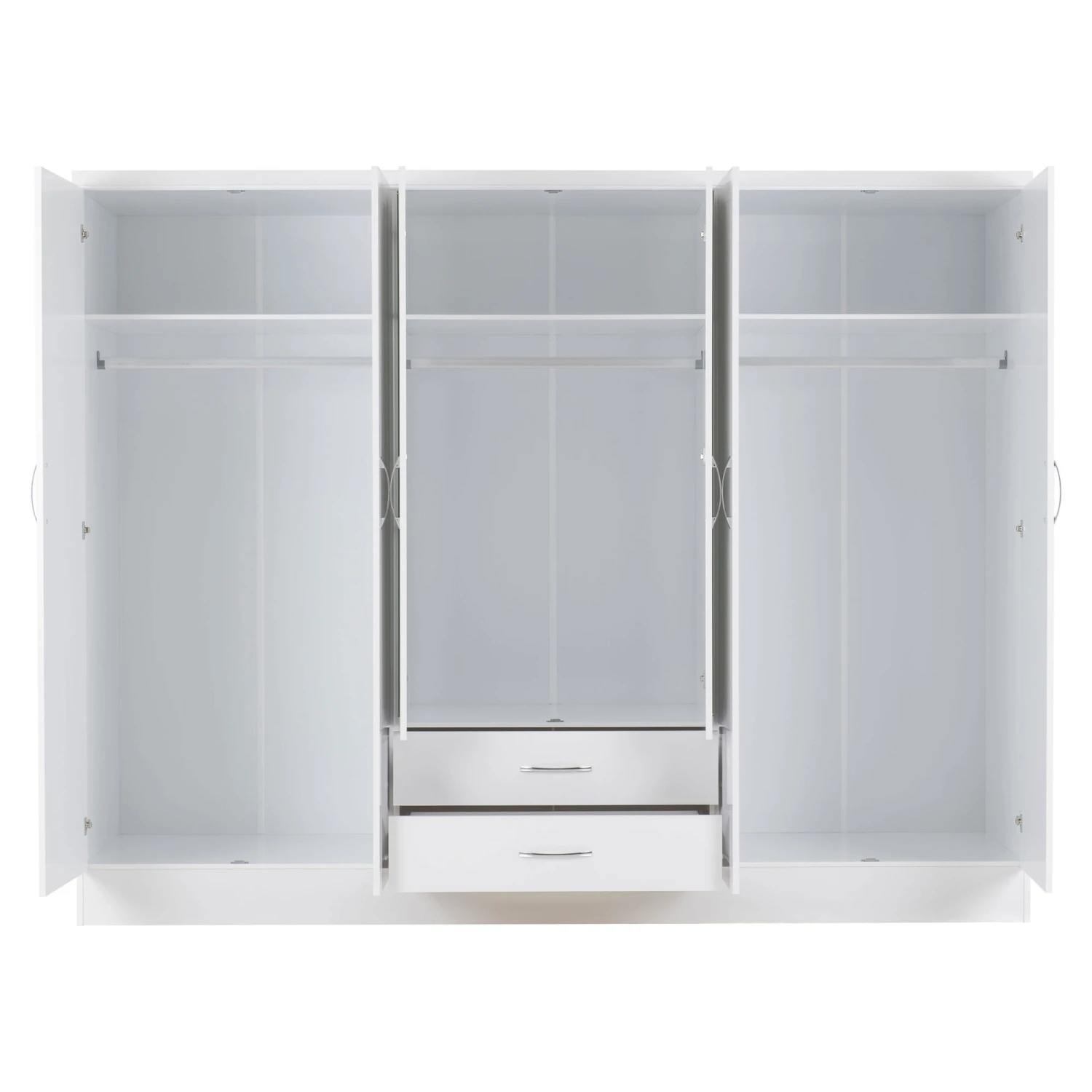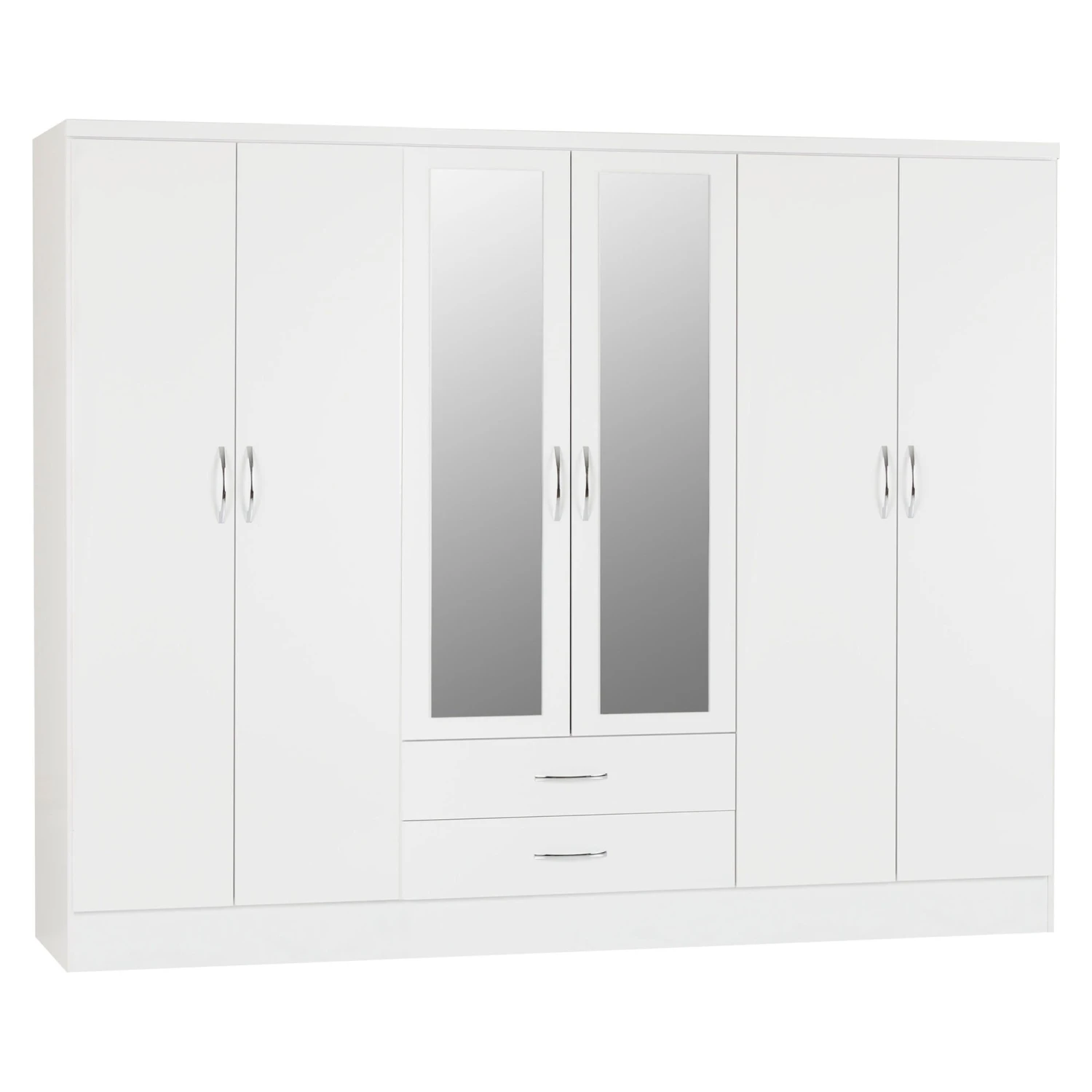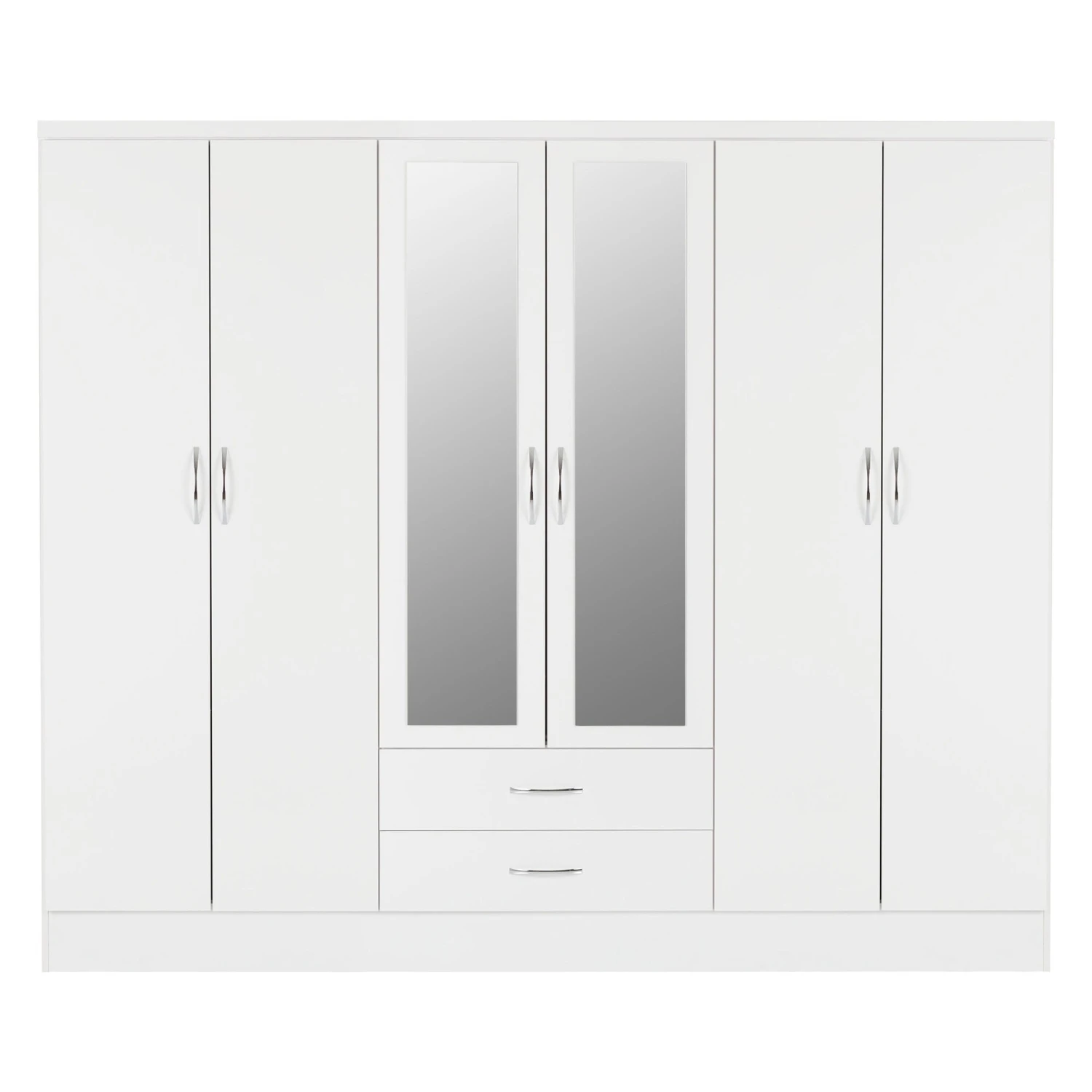 Have all you need in one place with this huge Nevada White Gloss 6 Door 2 Drawer Mirrored Wardrobe. Beautifully crafted from high quality materials to create a sturdy, hard-wearing product, it comes in a sleek white gloss finish, perfect for matching to any interior decor. With 6 doors, 2 of which have mirrored panelling, it comes with internal hanging rails for your clothing and gives you the opportunity to check out your outfit, helping to style and get ready in the morning. Additional storage is provided with 2 drawers beneath to fold smaller items or store shoes, and it’s complimented with silver metal handles to gain access. Offering a generous amount of storage space, it’s all you need to organise your bedroom.