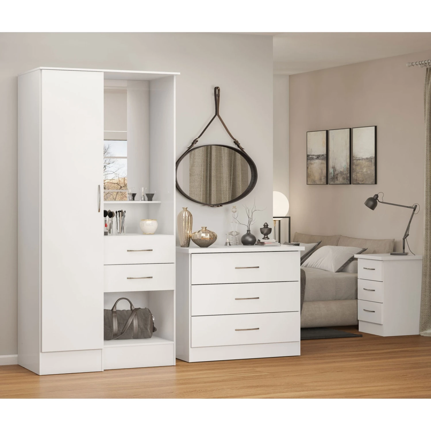 Uniquely crafted with a 2 in 1 design, this Nevada White Gloss Vanity 1 Door Wardrobe cleverly allows you to use its 1 door wardrobe for hanging clothing items whilst the other side is used as a vanity unit. Complete with a hanging rail and internal shelf, it also has 3 shelf spaces and 2 drawers, with a mirror included for getting ready in front of. Coming in a white gloss finish, manufactured from high quality wooden materials, it’s sturdily built for a long-lasting finish and makes a versatile and practical addition, boosting storage space and adding to your bedroom furniture.Â