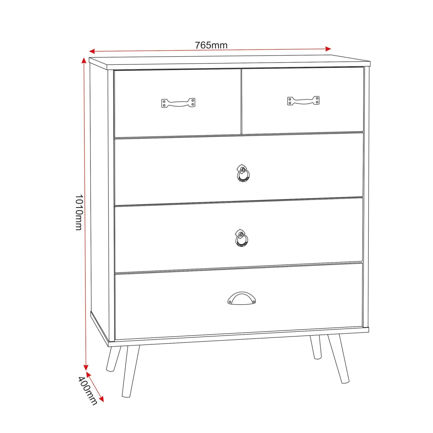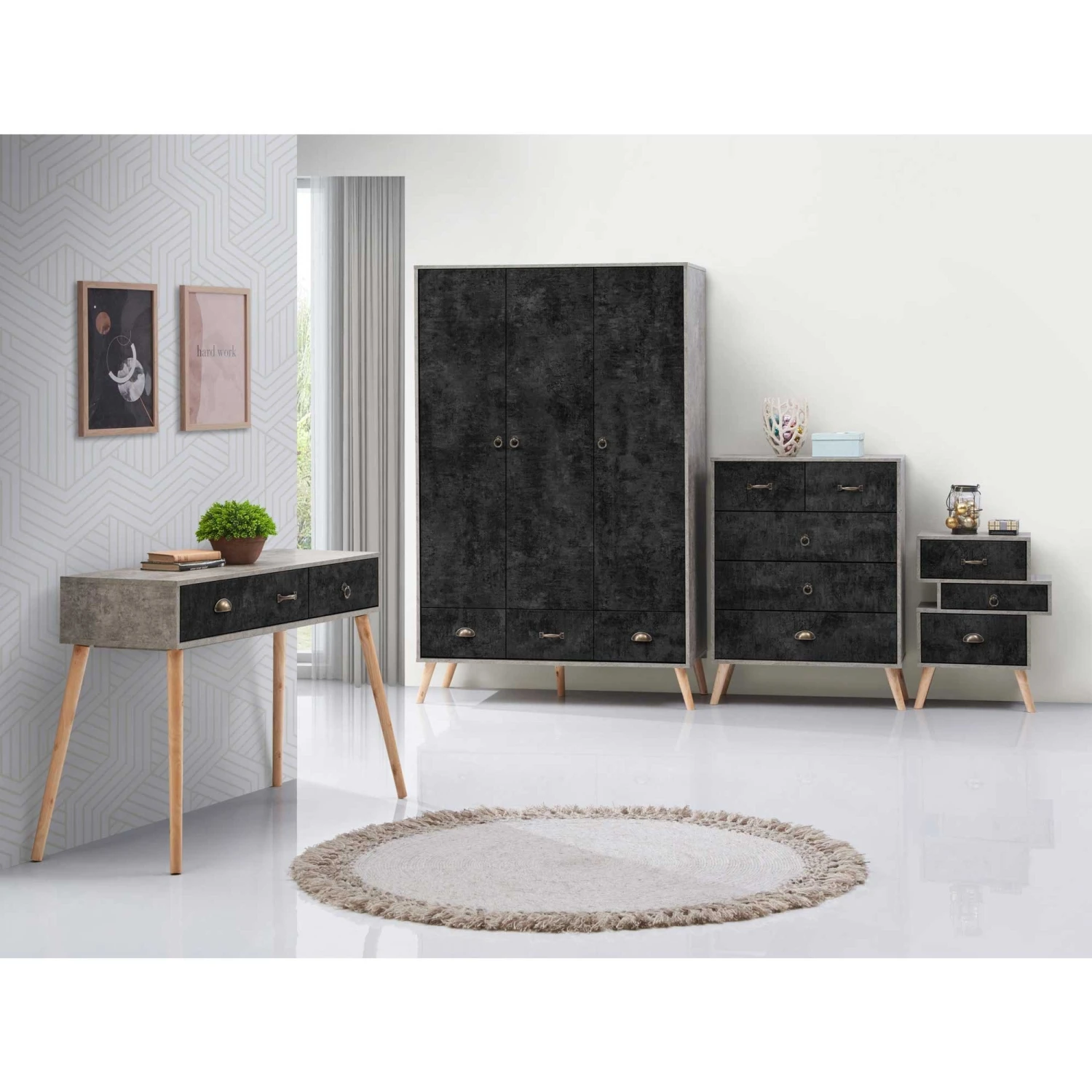Add a stunning statement to any bedroom with this Nordic 3+2 Drawer Chest! This Nordic style chest is finished in Concrete Effect and Charcoal for a unique twist to your bedroom storage. Complete with pewter effect handles and pine feet, this chest provides lots of storage in the 2 small drawers and 3 large drawers.Â