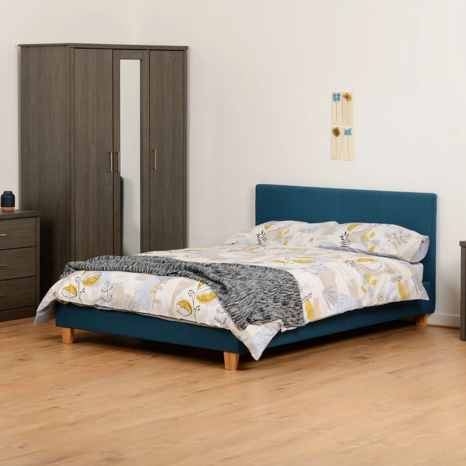 Add this gorgeous Prado Petrol Blue Fabric Bed to any bedroom and instantly attract attention! This contemporary bed frame is upholstered in petrol blue fabric and will make a stunning statement to your home decor! Complete with wooden feet, this bed will make an ideal choice for all ages. Available in other colours.Â