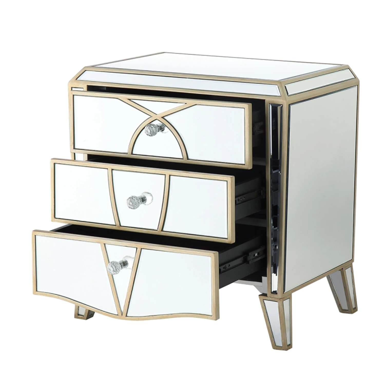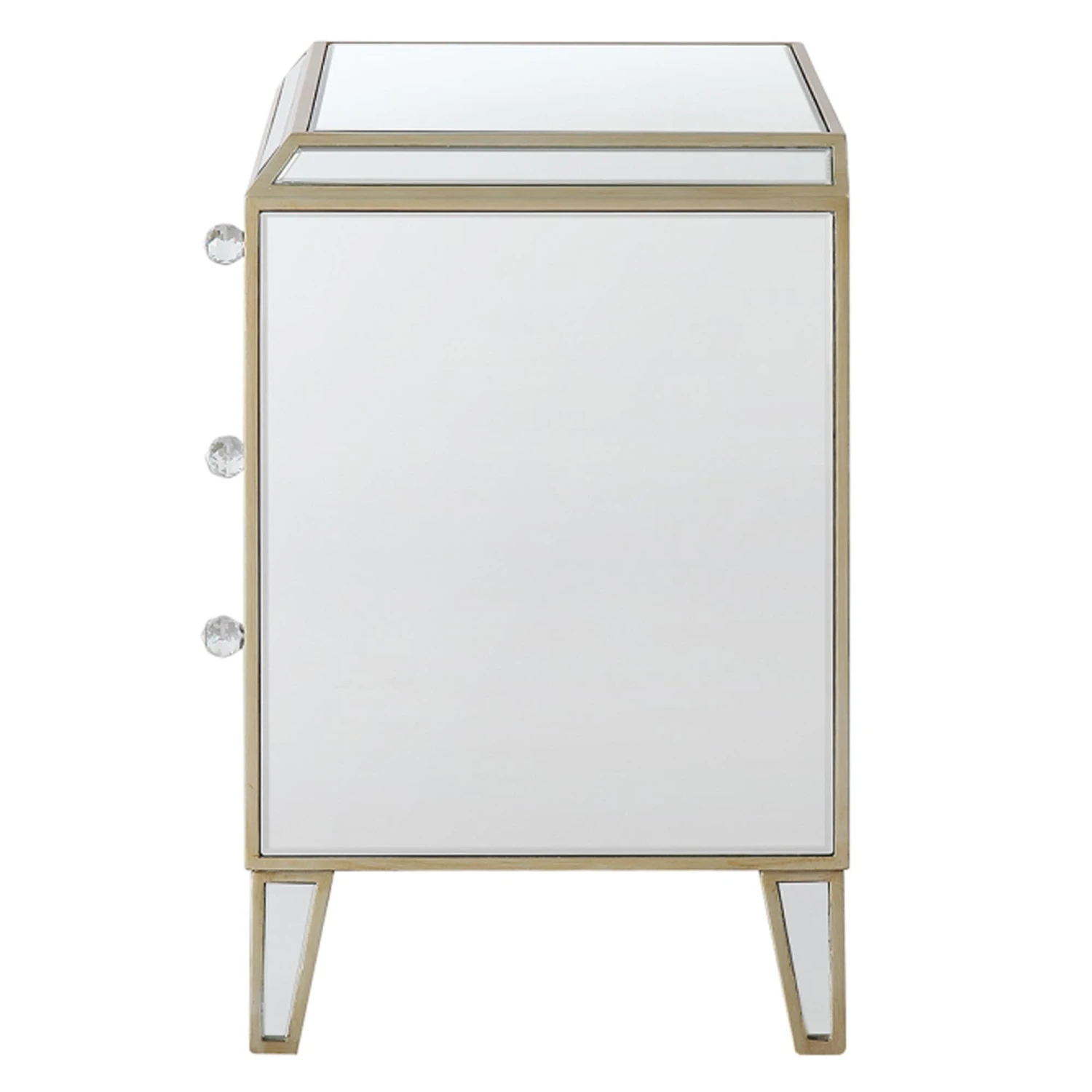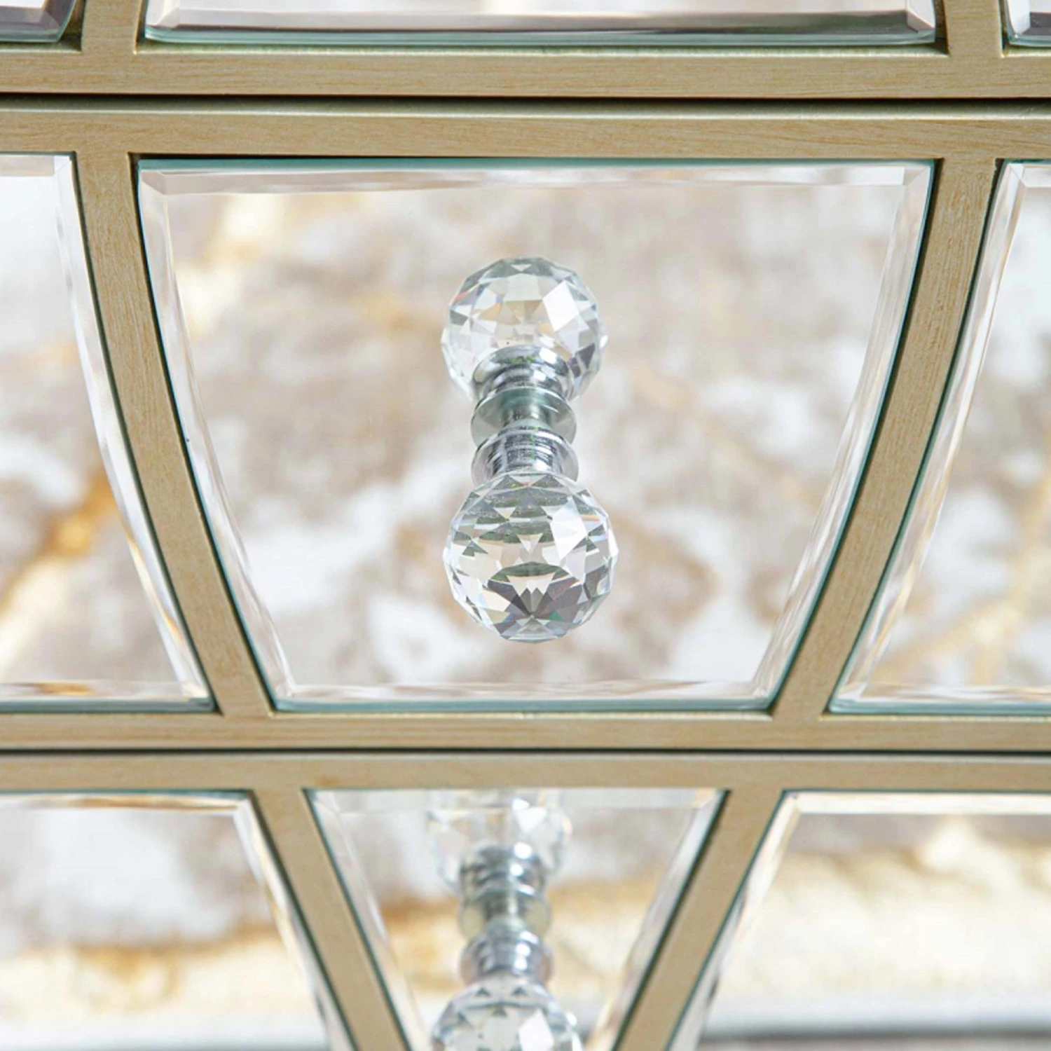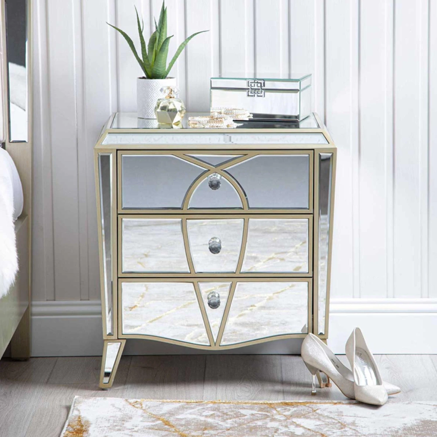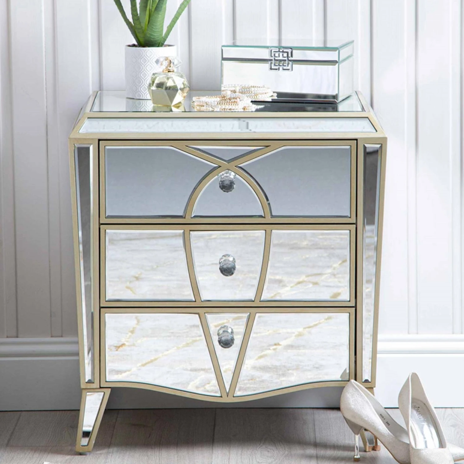 Adding elegance to any room this Pristina 3 Drawer Mirror Cabinet that can be used in your bedroom or as a storage unit in any room. The drawers are made up of mirror panelling, trimmed in champagne with a decorative feature across the front of the drawers. The bottom of the cabinet is gently curved along the edge and complete with crystal handles on the 3 spacious drawers.Â