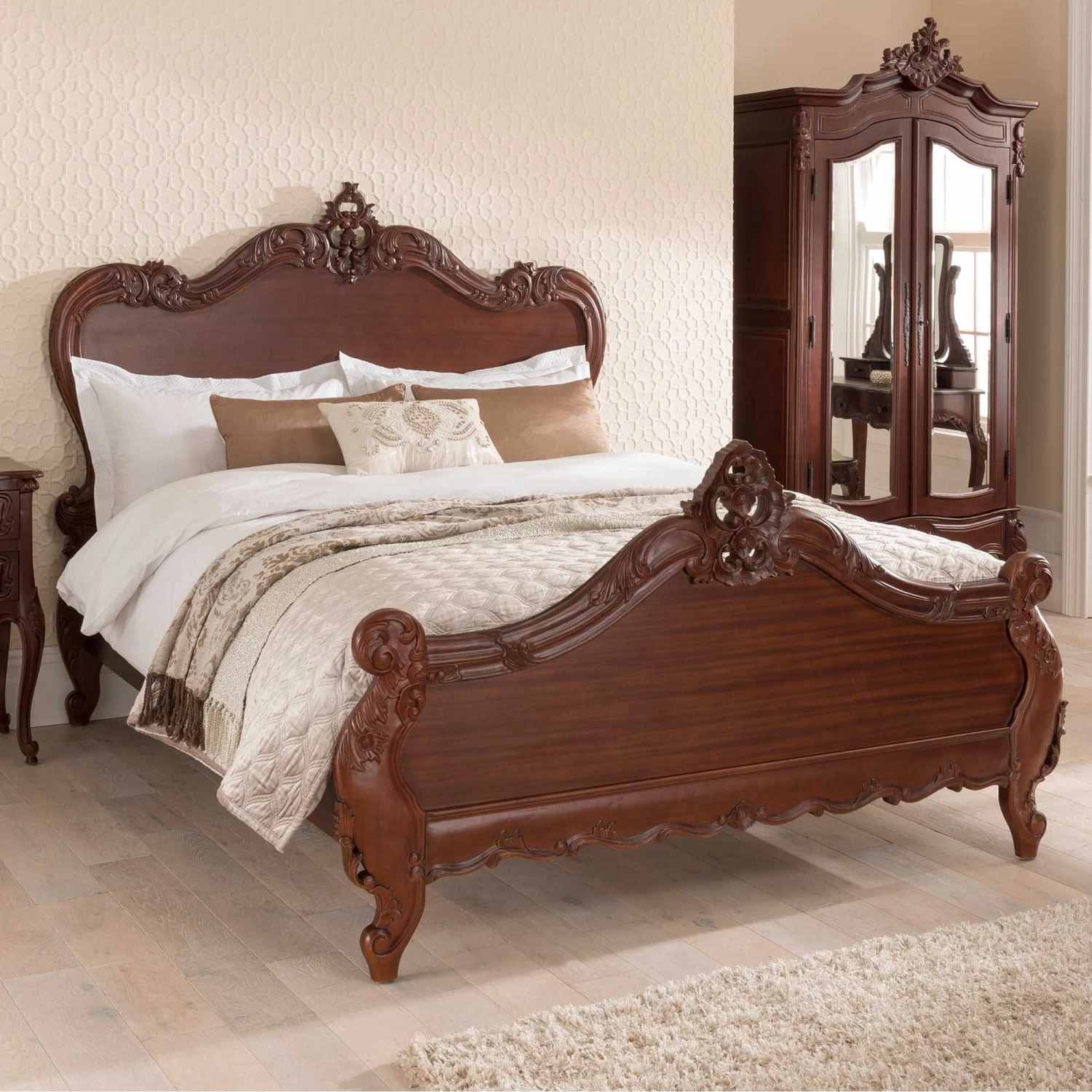 A delightful new addition to our range of French bedroom furniture comes this antique French bed, handcarved from mahogany. Soft curves and delicate carving are the features of the stunning Raphael range, as this furniture range is the ultimate in ‘boudoir elegance’. Inspired from the 18th century where elegance and luxury were the order of the day, this item is sure to impress, particularly working well with our fantastic shabby chic furniture.