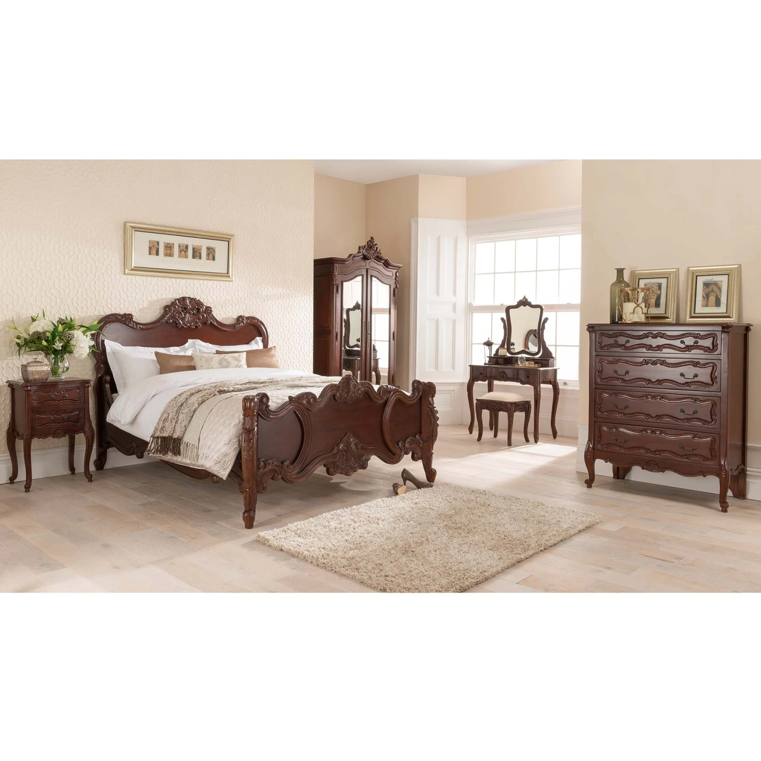 A delightful new addition to our range of French bedroom furniture comes this antique French 4 drawer chest, handcarved from mahogany. Soft curves and delicate carving are the features of the stunning Raphael range, as this furniture range is the ultimate in ‘boudoir elegance’. Inspired from the 18th century where elegance and luxury were the order of the day, this item is sure to impress, particularly working well with our fantastic shabby chic furniture.