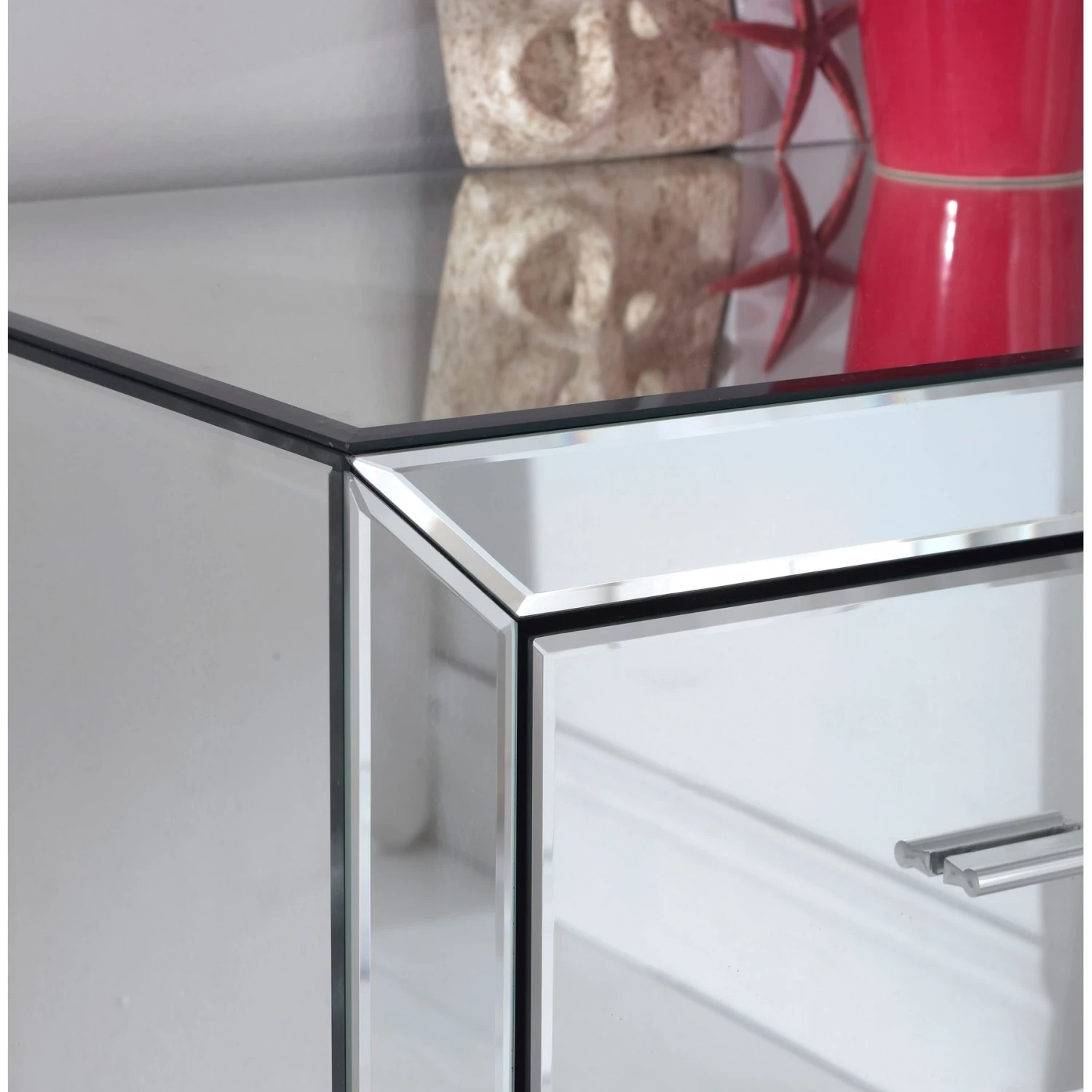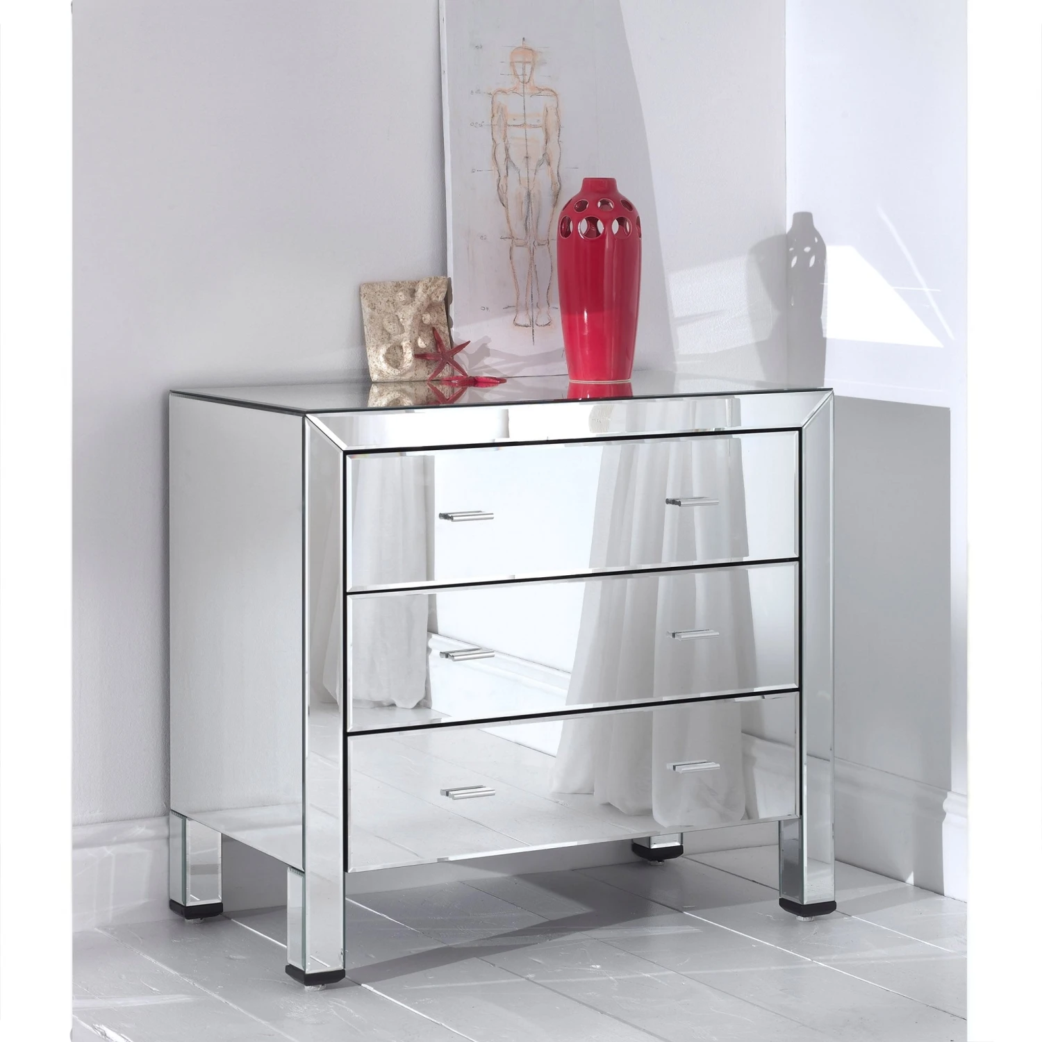 Venetian Romano Mirrored Chest 3 Drawer . This Romano Mirrored Chest 3 Drawer has been carefully built using a combination of mirror glass and wooden frames. It has been inspired by the Italian Venetian period, the versatile design of this range will sit comfortably in a modern or traditional setting making this mirrored furniture a welcome addition to any home.