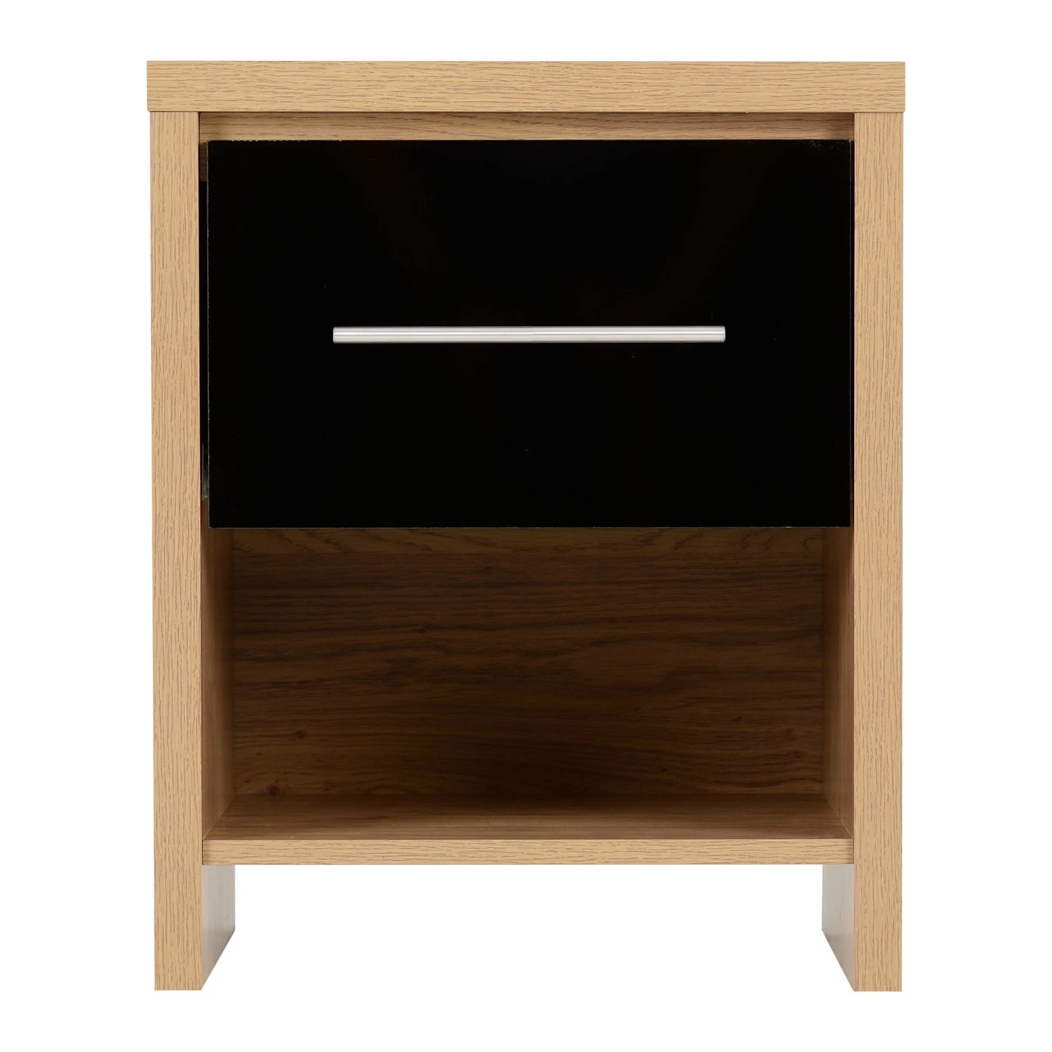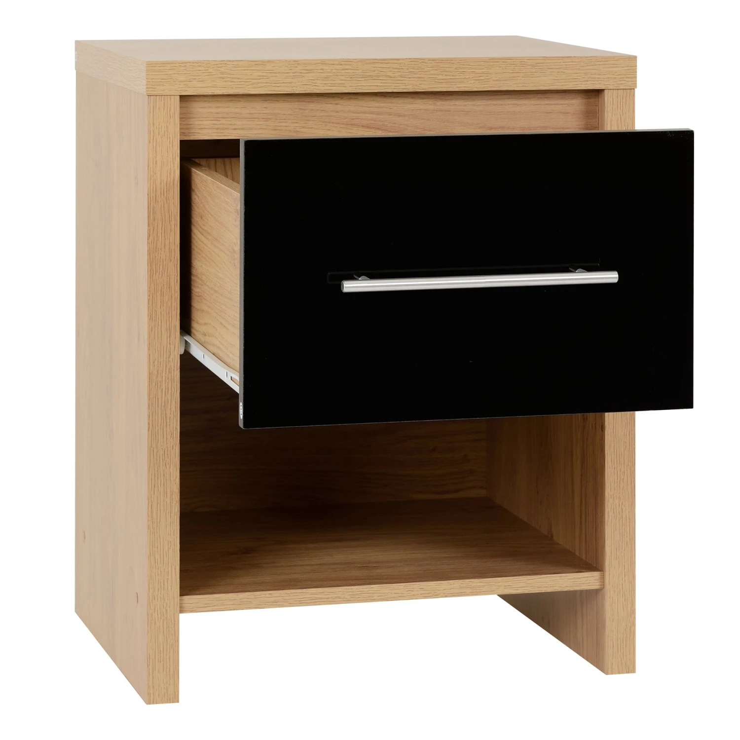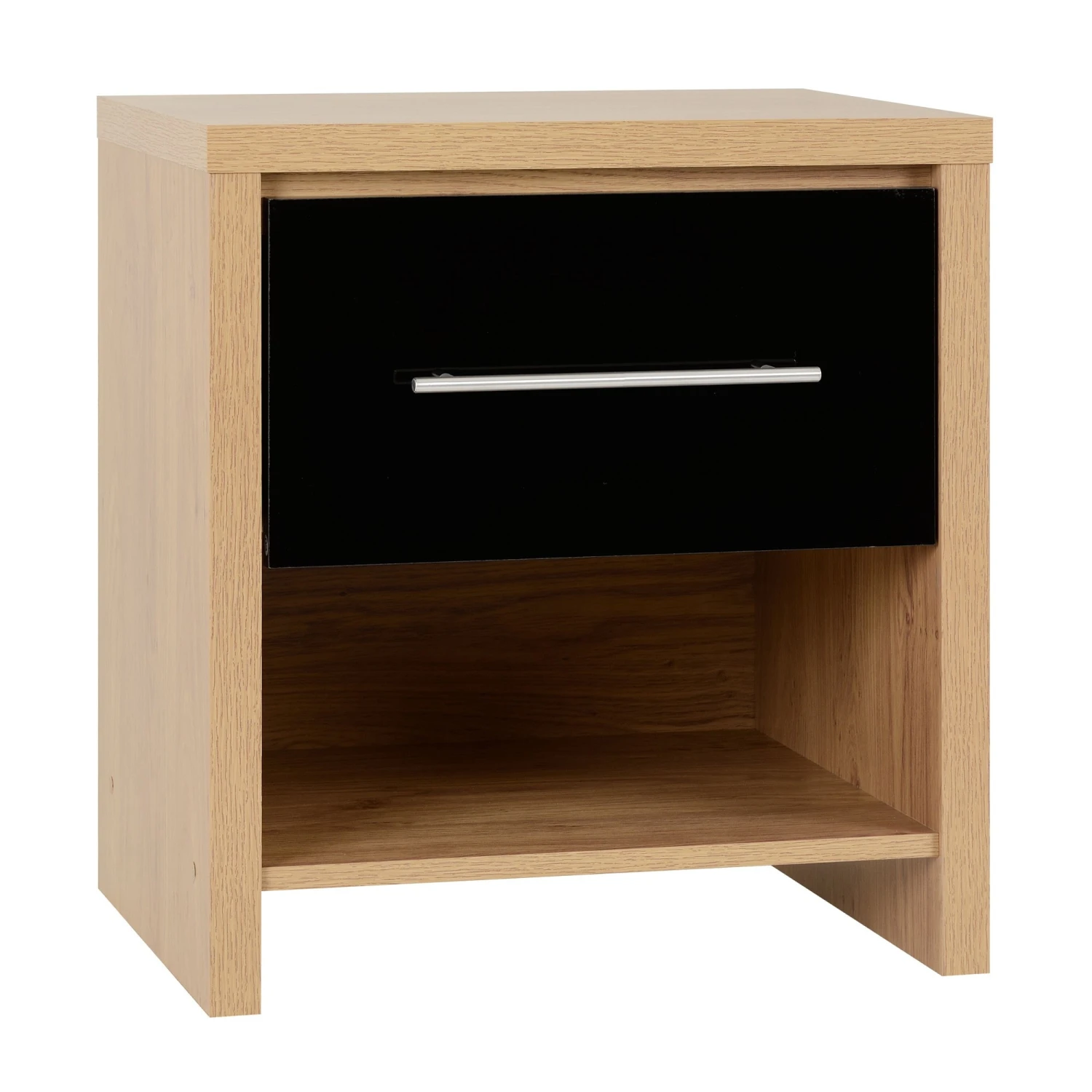 This Seville Black Gloss & Light Oak 1 Drawer Bedside Cabinet will be a lovely addition, perfect for the side of your bed to display a table lamp or bedroom must-haves such as an alarm clock or book. Coming with a lovely bold black high gloss shine on the drawer front and a light oak veneer finish, this wooden bedside cabinet provides a drawer for storage, with ample space underneath. Complete with a long metal handle for easy access to its pull out drawer, it will be a practical piece of furniture for your bedroom essentials.