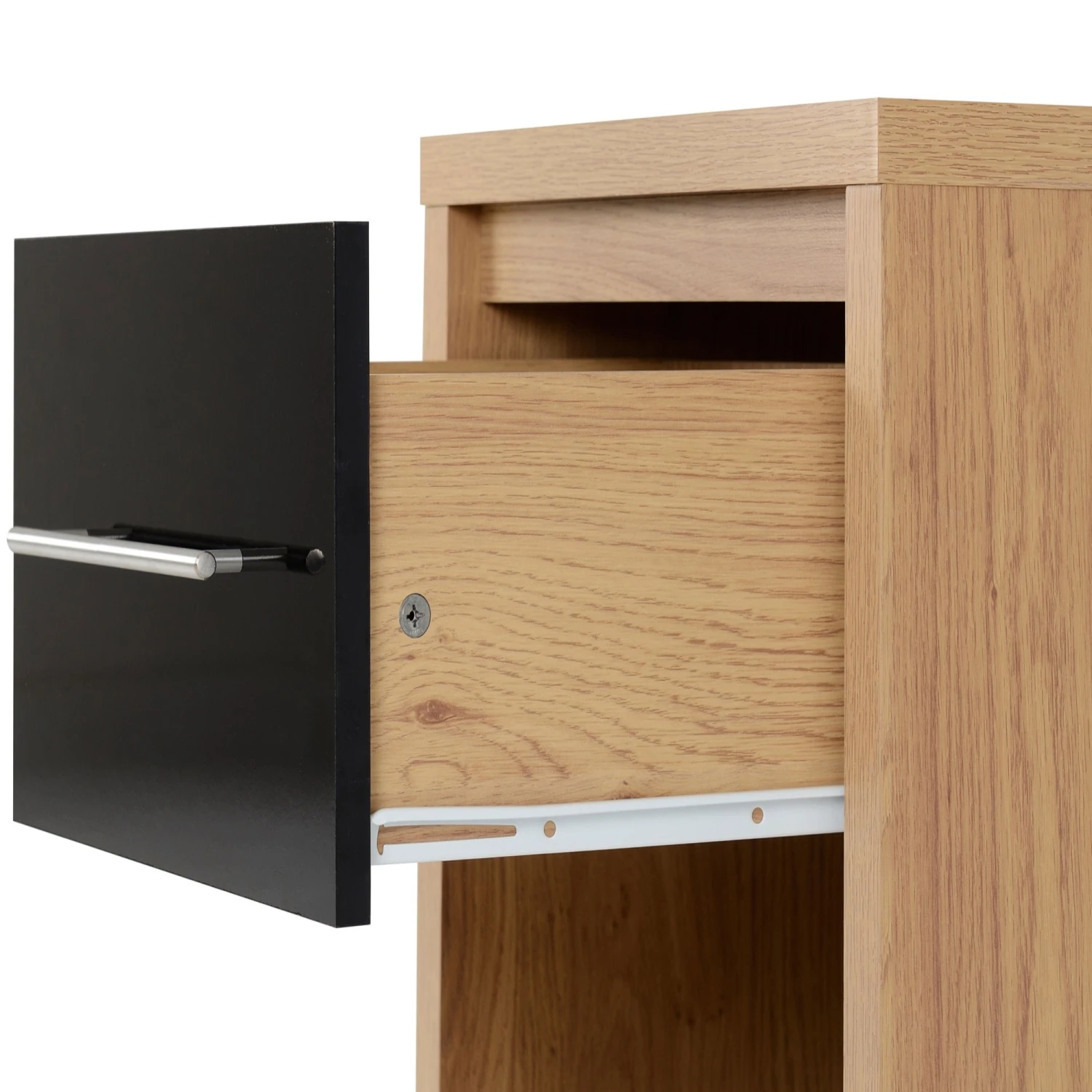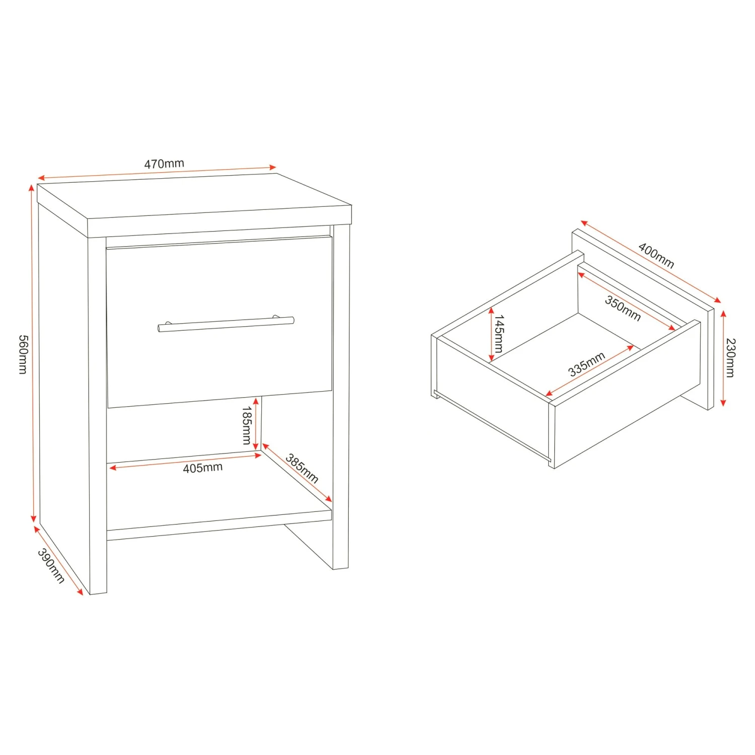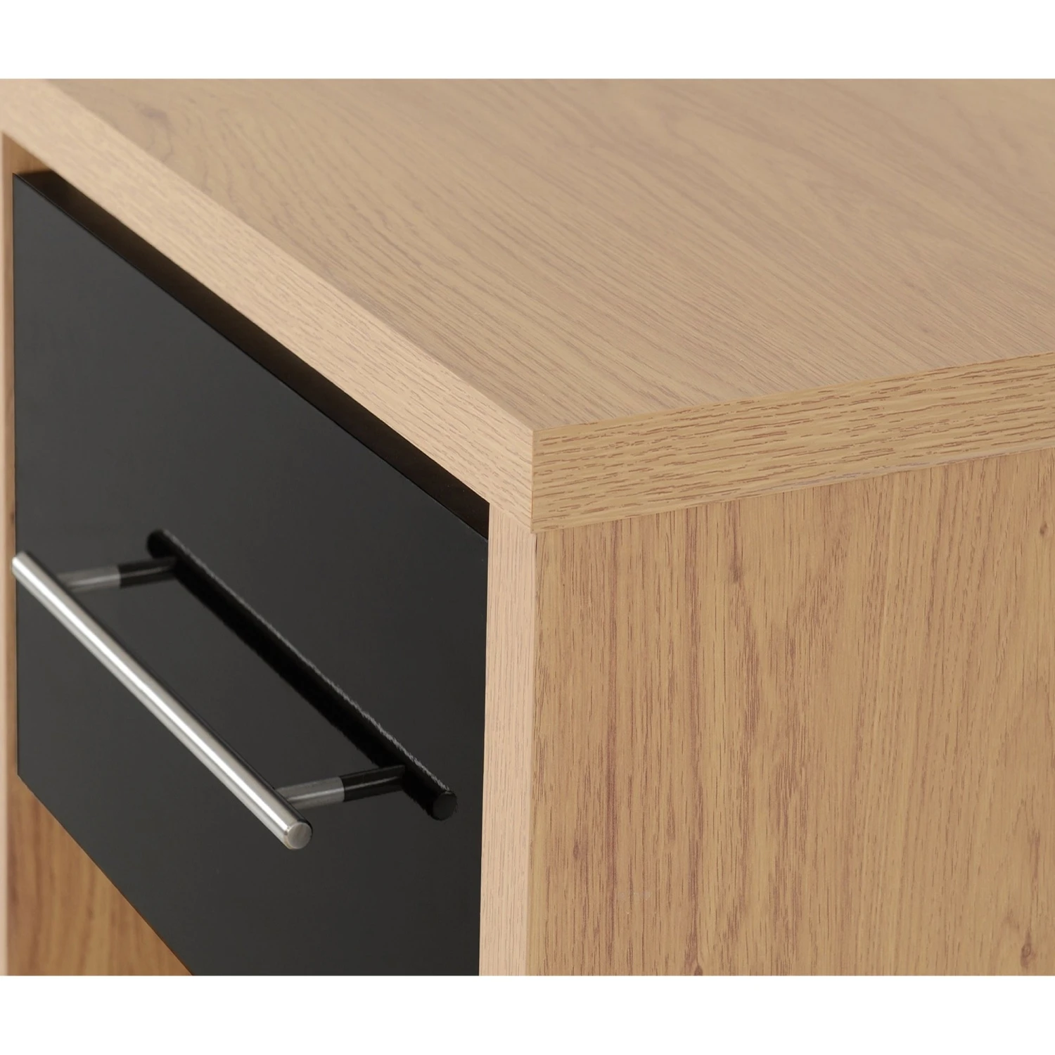 This Seville Black Gloss & Light Oak 1 Drawer Bedside Cabinet will be a lovely addition, perfect for the side of your bed to display a table lamp or bedroom must-haves such as an alarm clock or book. Coming with a lovely bold black high gloss shine on the drawer front and a light oak veneer finish, this wooden bedside cabinet provides a drawer for storage, with ample space underneath. Complete with a long metal handle for easy access to its pull out drawer, it will be a practical piece of furniture for your bedroom essentials.