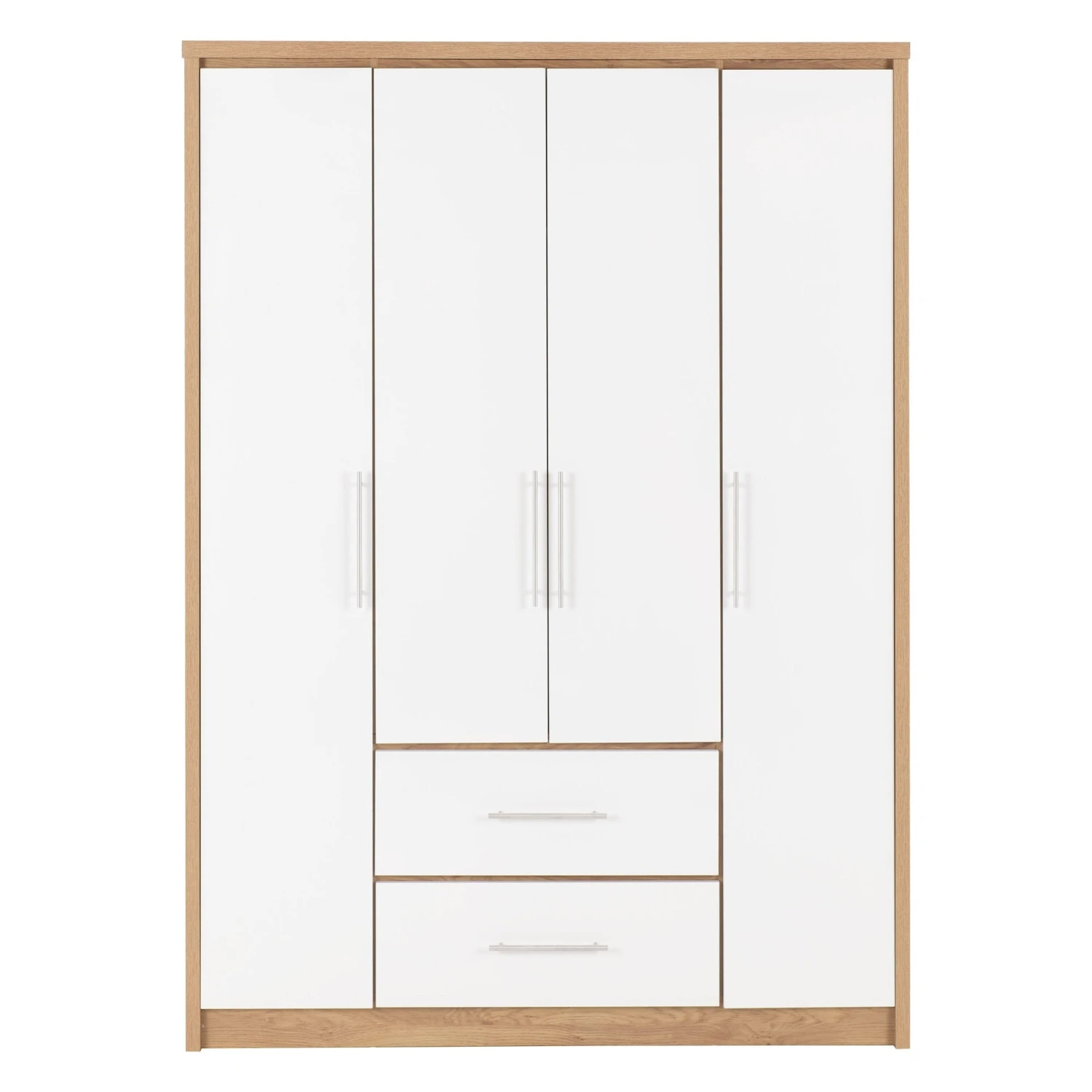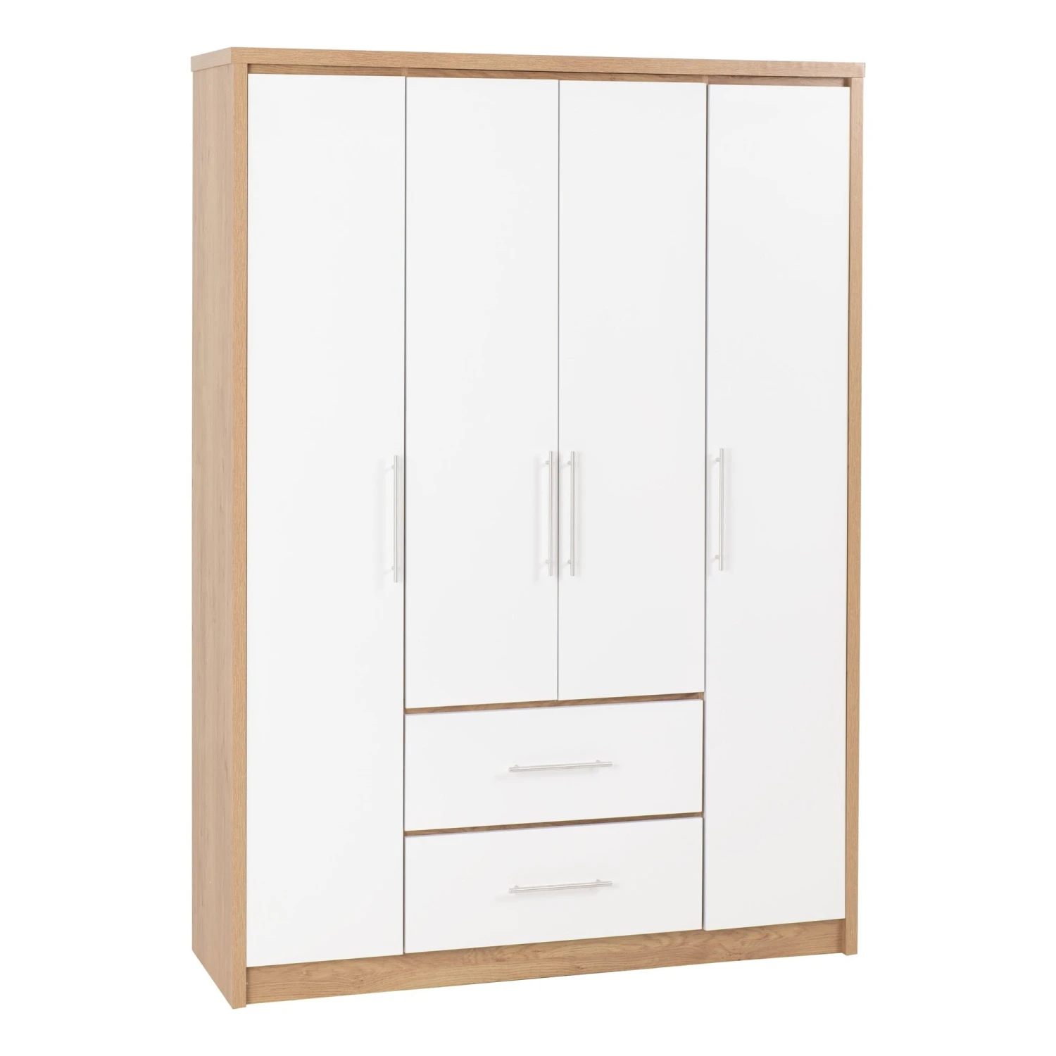 Designed to provide you with vast amounts of storage space for those who always seem to be running low, this Seville White Gloss & Light Oak 4 Door 2 Drawer Wardrobe is an ideal solution to that problem. Coming with 4 doors, featuring internal hanging rails and shelving with 2 drawers below, it allows you to store your shoes, clothes, accessories and much more. With a white high gloss and light oak finish, it brings an ultra stylish and contemporary look to your bedroom furniture, upgrading your decor in an instant. It’s use of light colours enables you to match against other furnishings, giving you a versatile product that is well-built and will last many years.