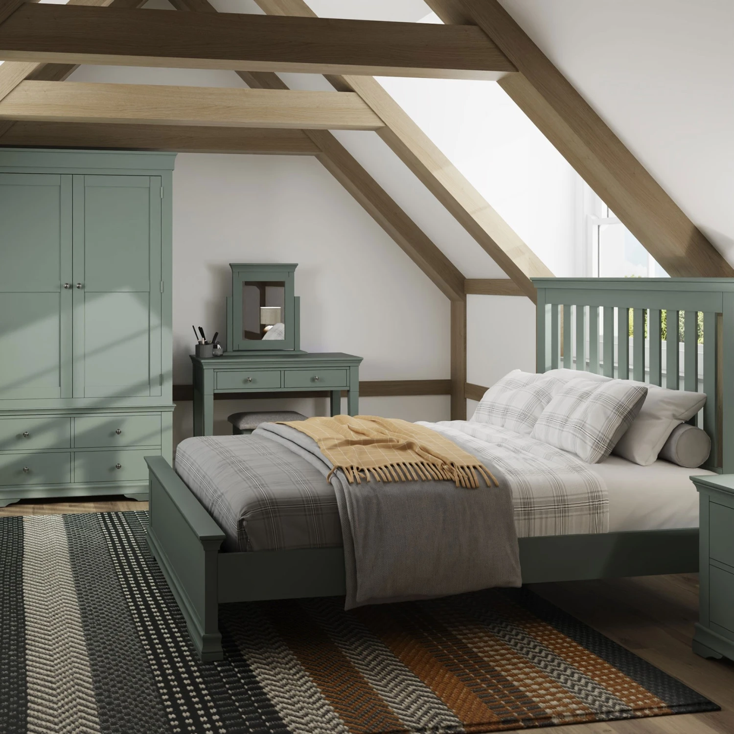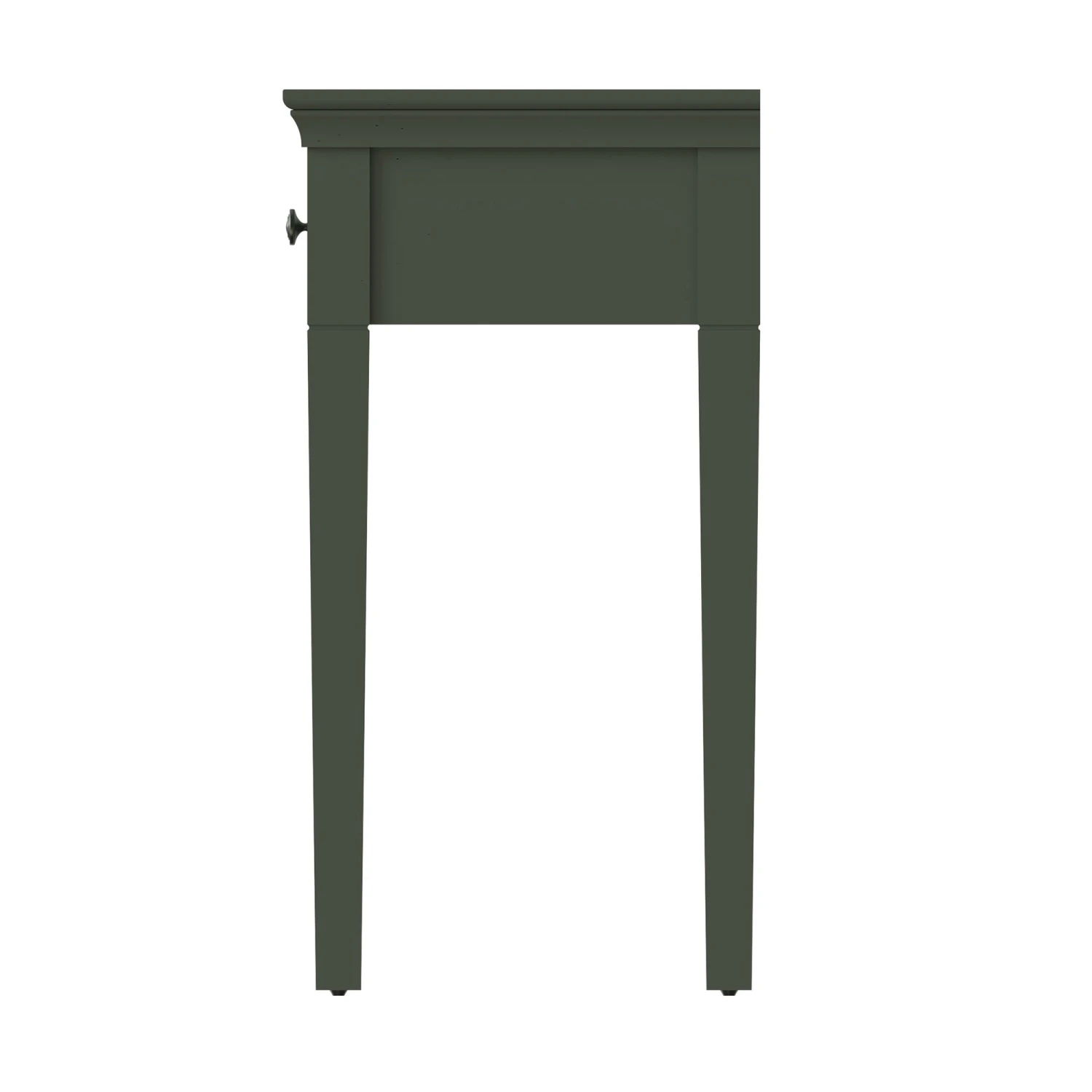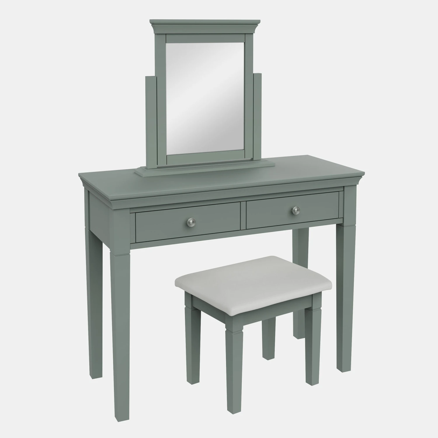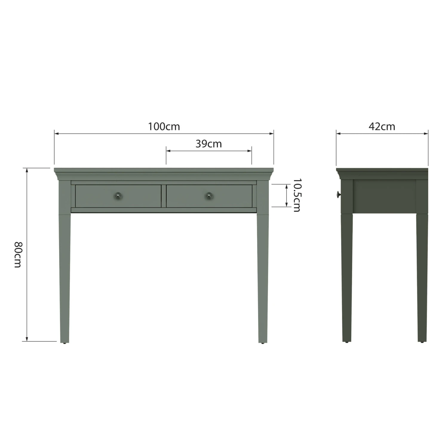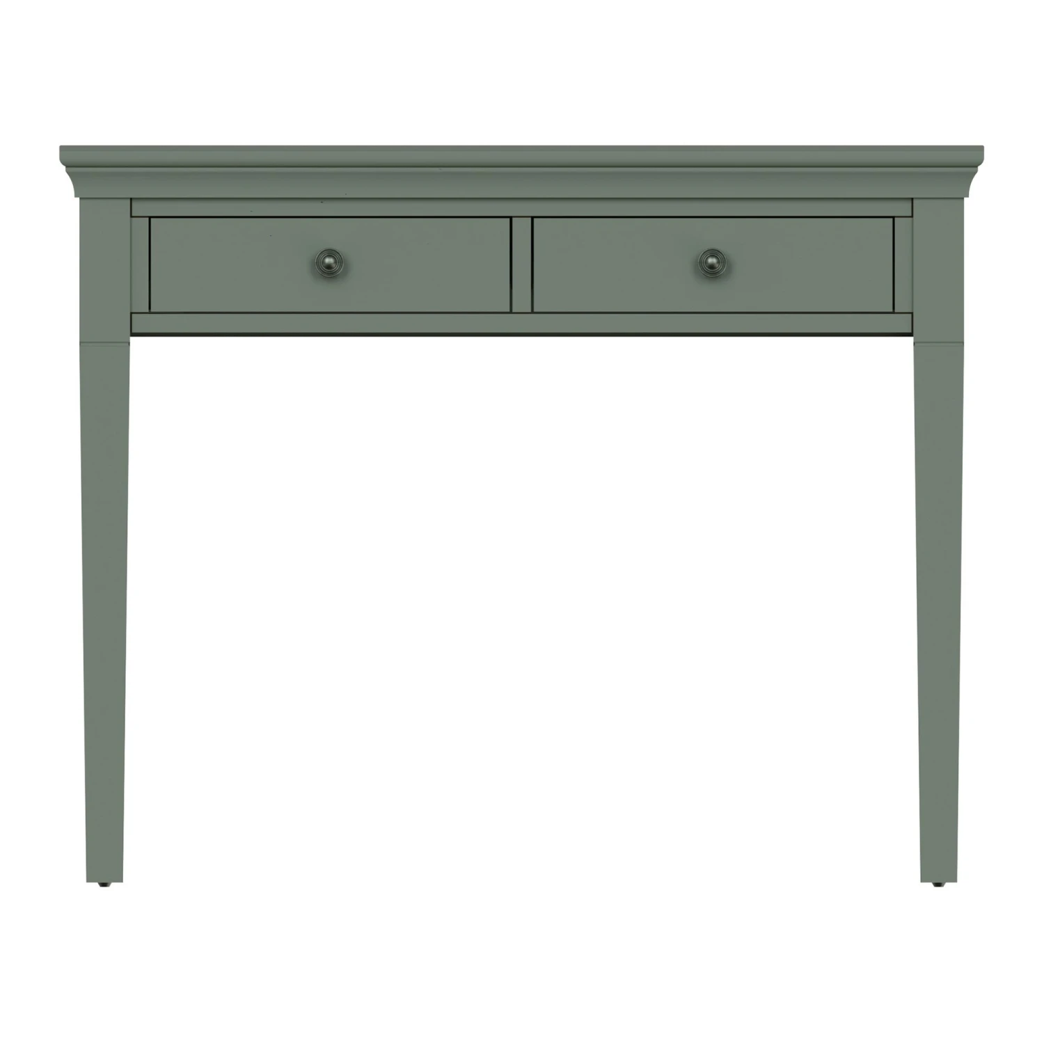 Bring an elegant touch to your bedroom with this stunning designed Swindon Cactus Green Dressing Table. The dressing table is made from wood in a beautiful cactus green paint, there are 2 spacious drawers that run on wooden guides and are finished with pewter effect handles for a decorative touch. The dressing table will look stunning paired with a matching trinket mirror or wall mirror and stool to complete the look.