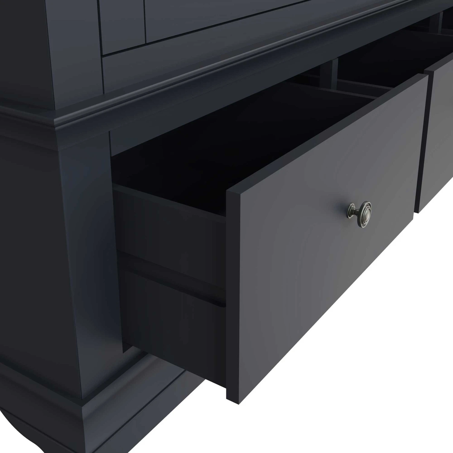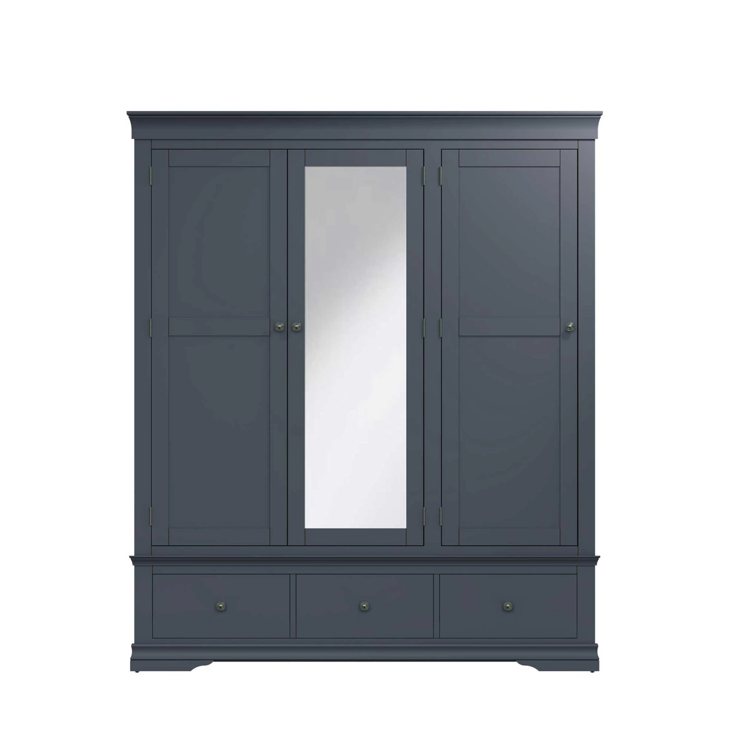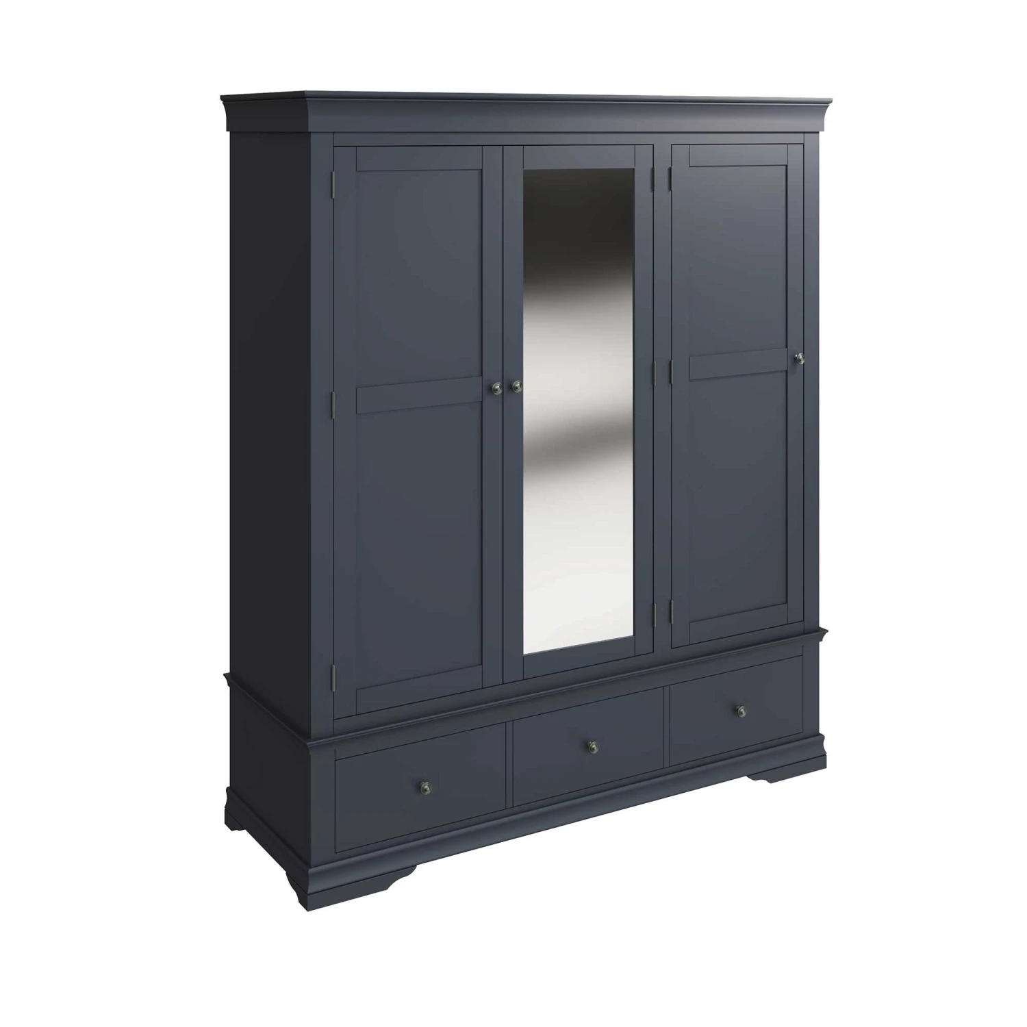 Complete the new Swindon Midnight Grey Bedroom Collection with this Swindon Midnight Grey 3 Door 3 Drawer Wardrobe. This large wardrobe is finished in painted midnight grey and showcases a beautiful timeless look. The modern style wardrobe has 3 doors, with a mirrored panel on the central door to help you get ready for that special occasion! This wardrobe also features a large hanging area and 3 extra drawers for storing bedding and towels. Finished with pewter effect handles and unique shaped legs. Matching items available.Â